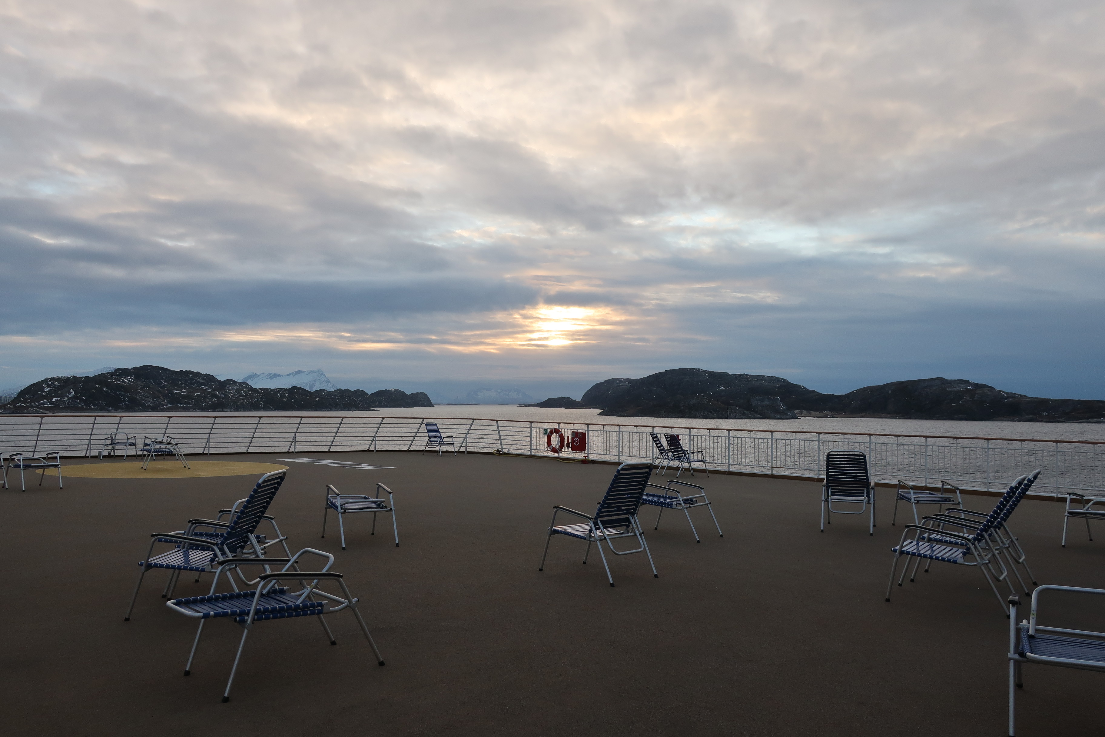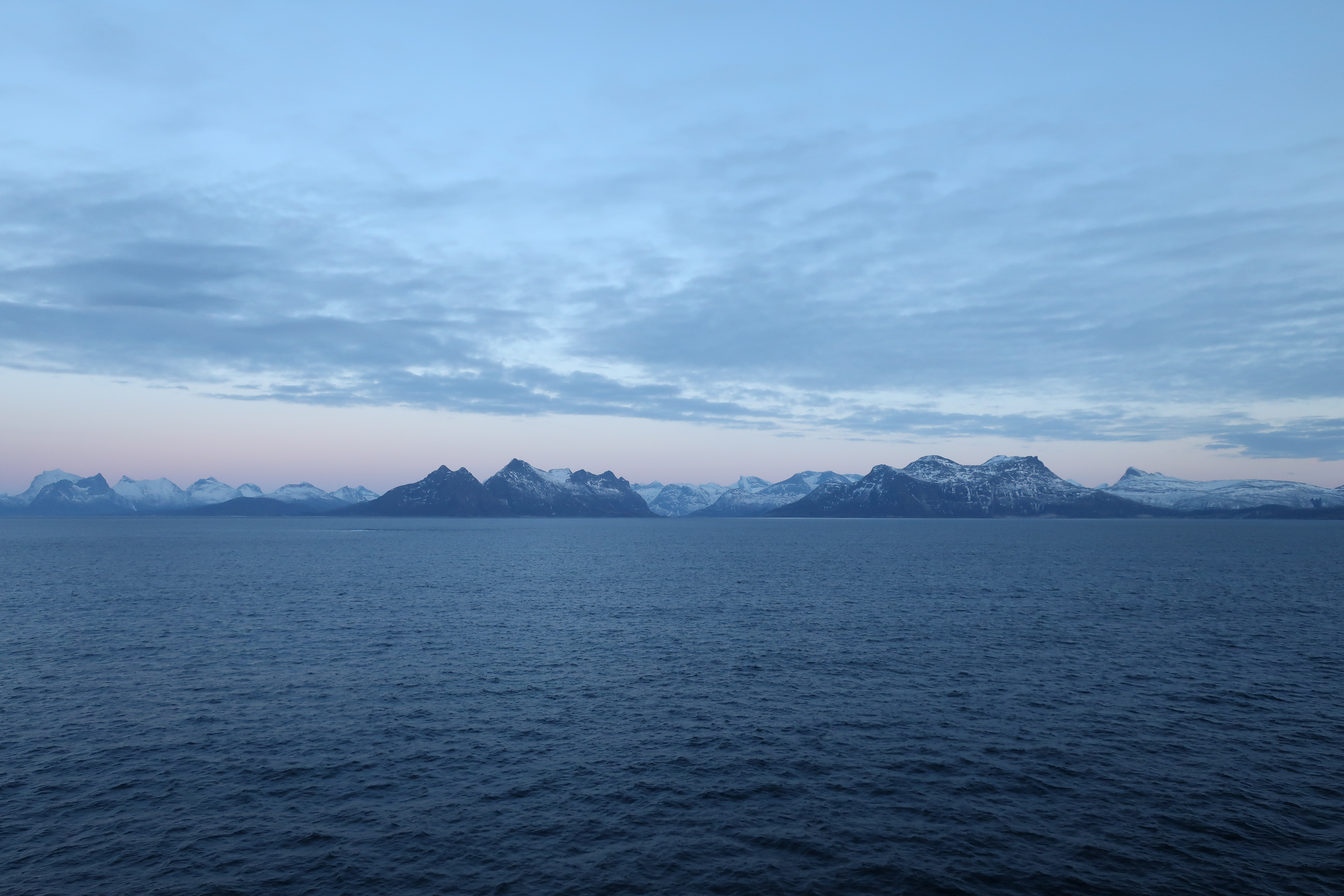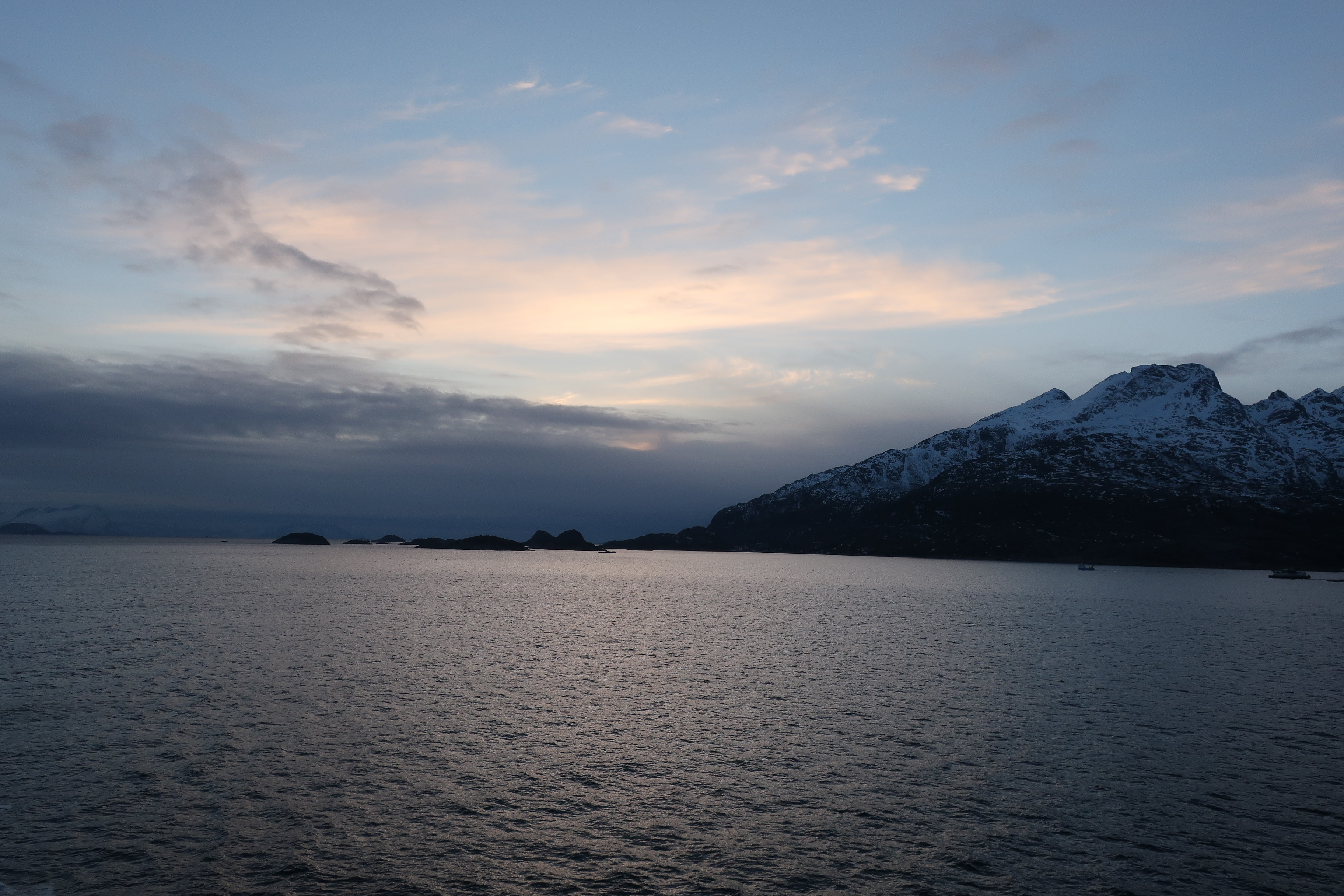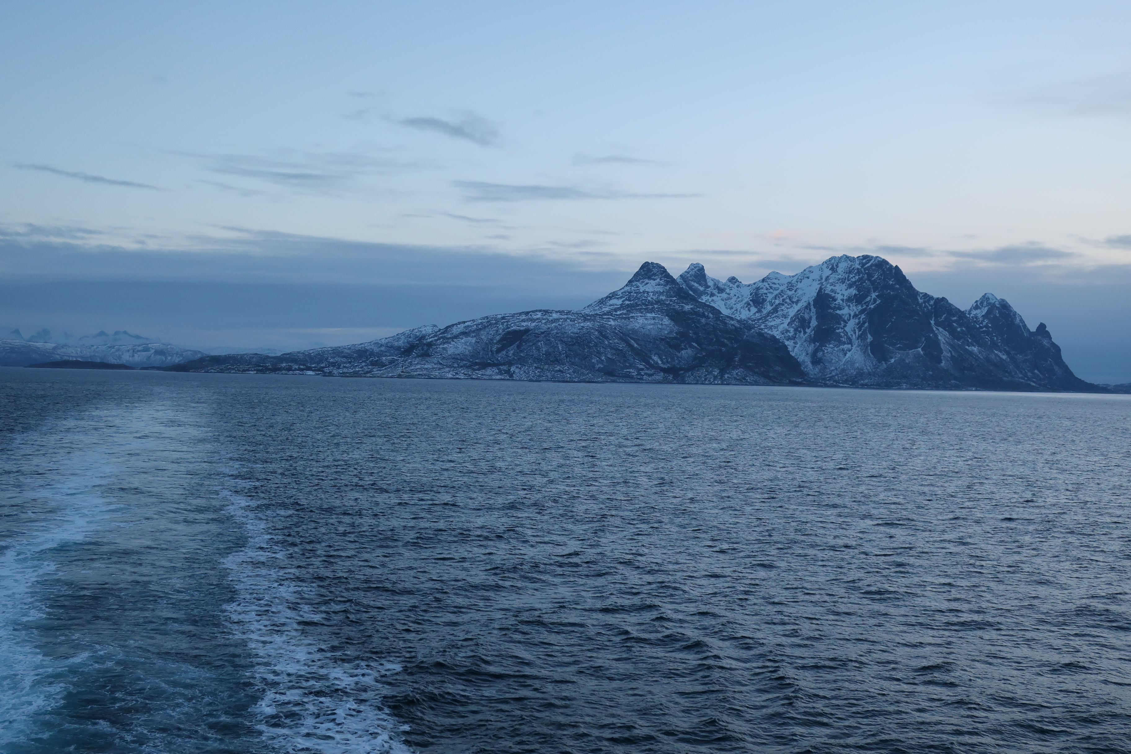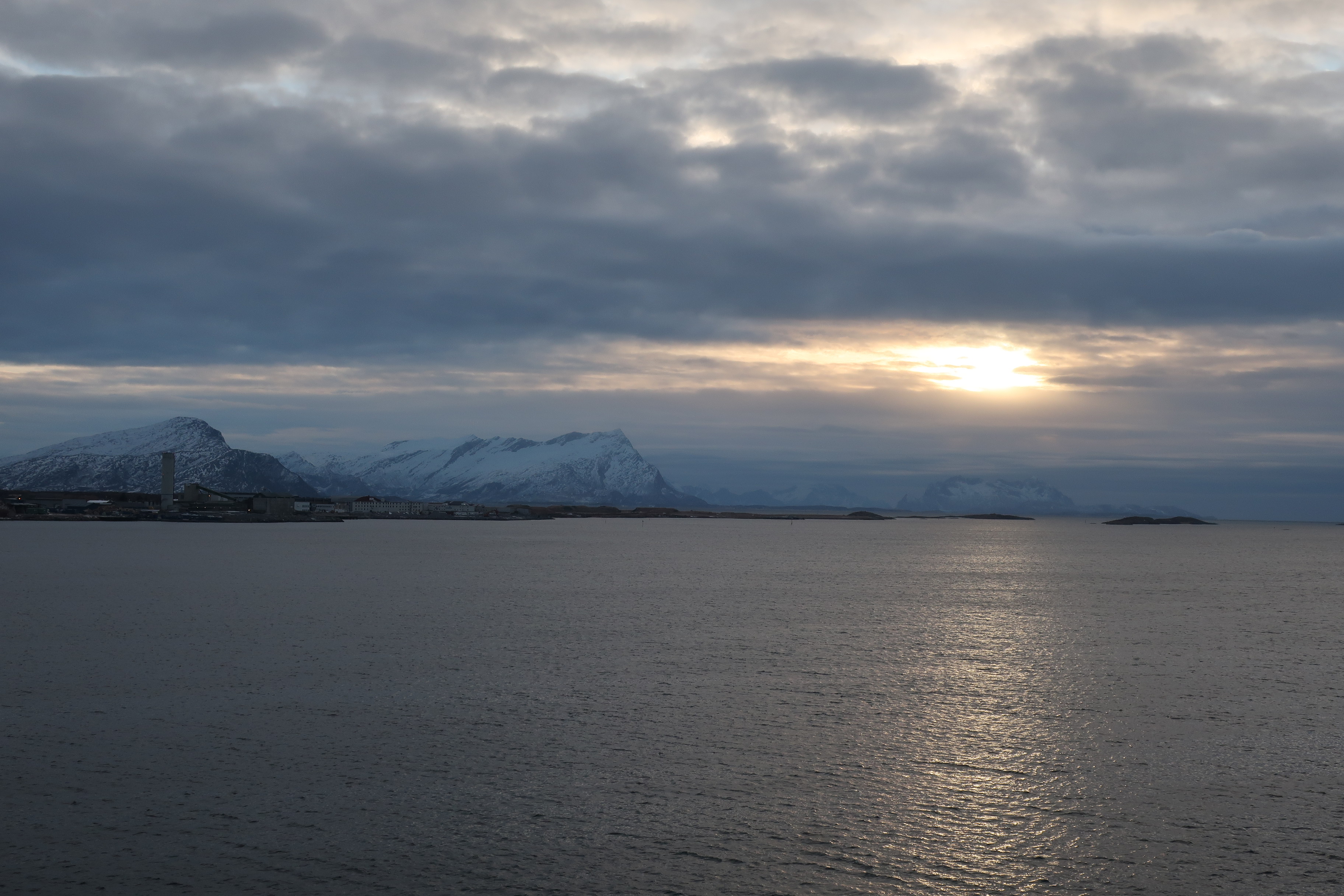 Nächste Etappe mit dem Flugzeug: Oslo – Bodø. Von dort setzen wir dann mit der MS Trollfjord über auf die Lofoten (wie praktisch, dass die Hurtigrute auch Autos mit nehmen kann). Kurz vor der Abenddämmerung laufen wir aus dem Hafen in Bodø aus.