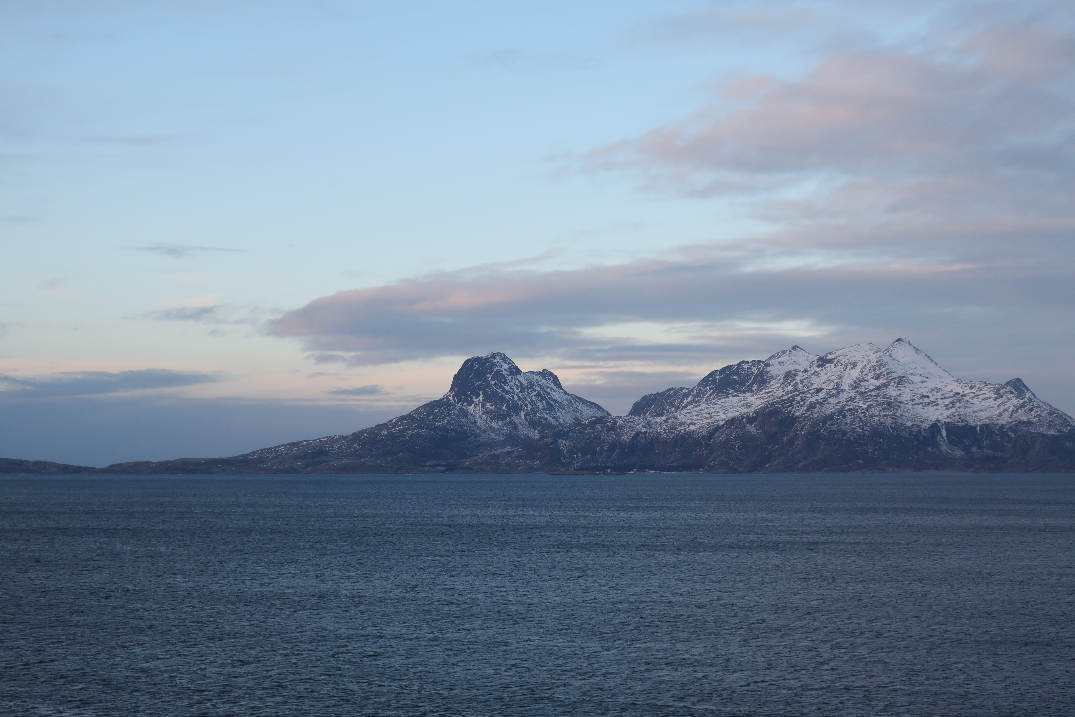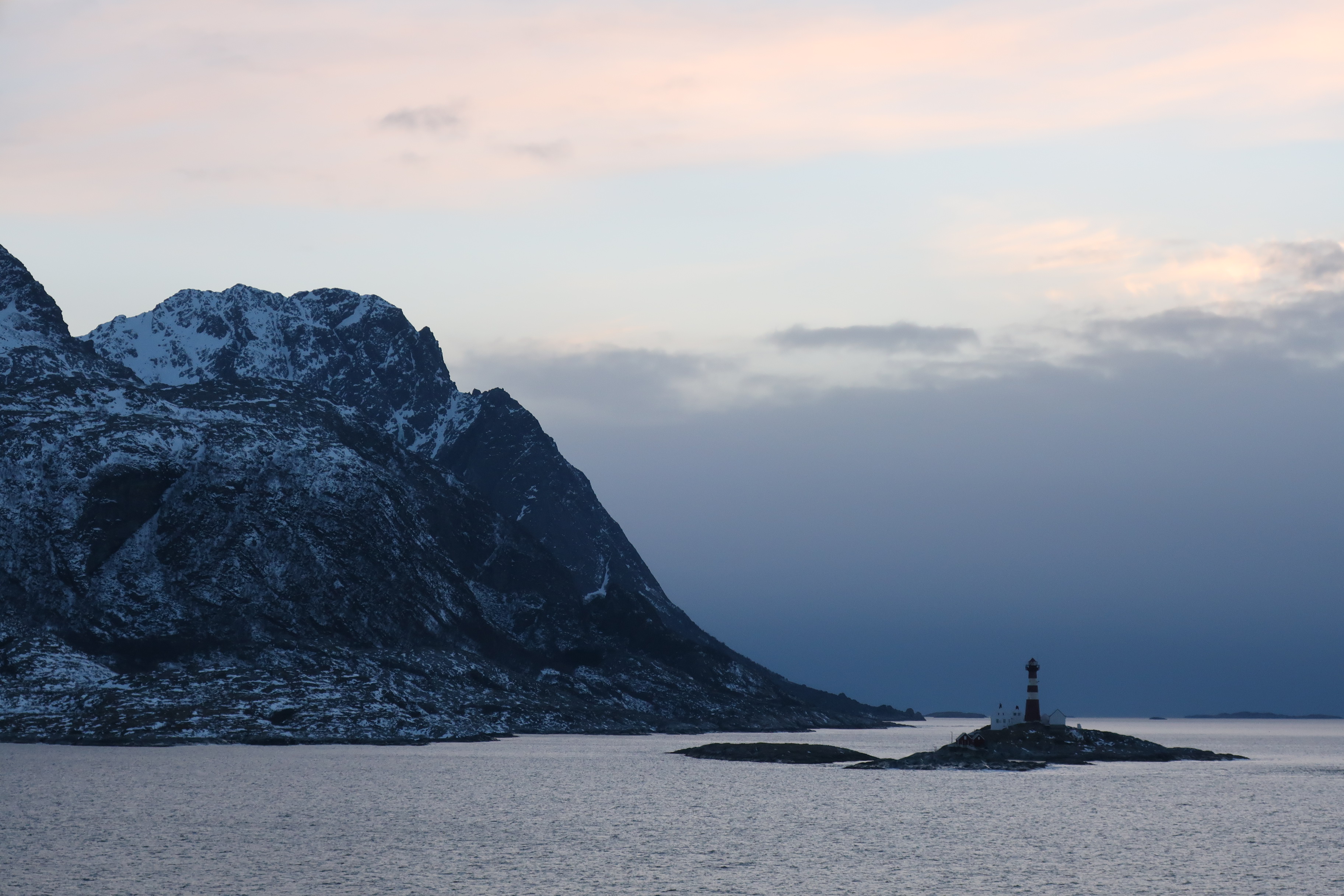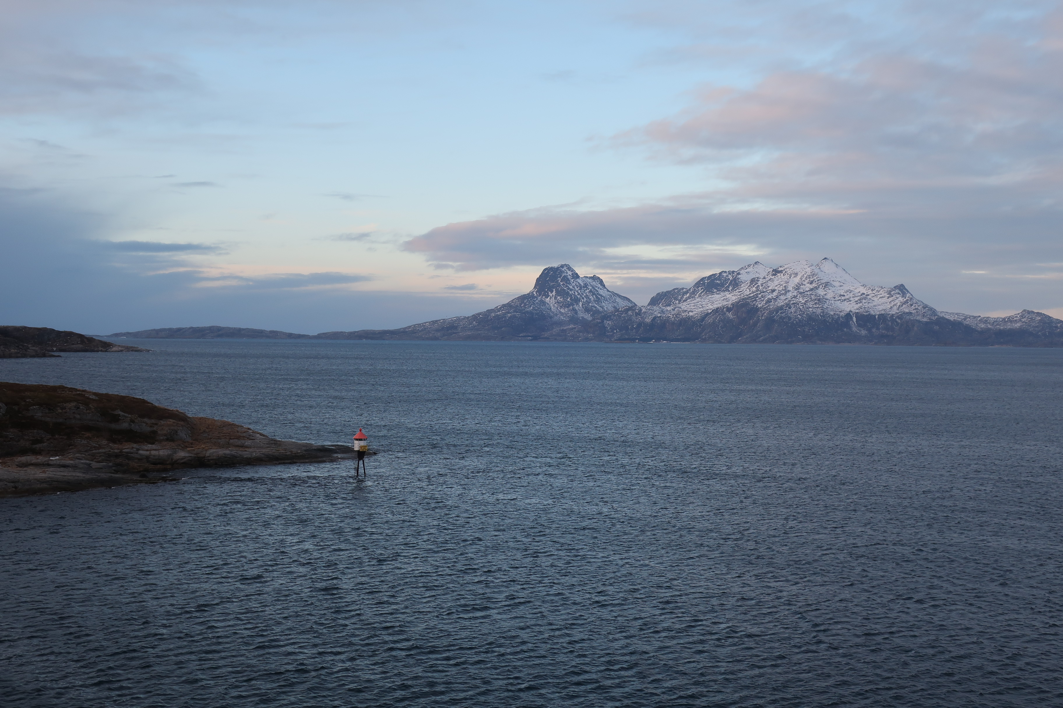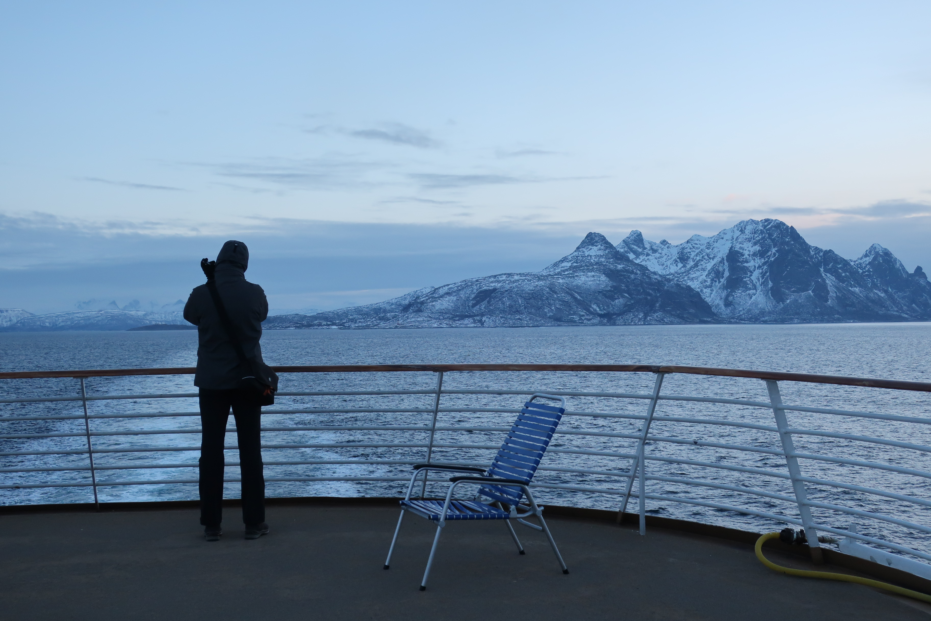 Nächste Etappe mit dem Flugzeug: Oslo – Bodø. Von dort setzen wir dann mit der MS Trollfjord über auf die Lofoten (wie praktisch, dass die Hurtigrute auch Autos mit nehmen kann). Kurz vor der Abenddämmerung laufen wir aus dem Hafen in Bodø aus.