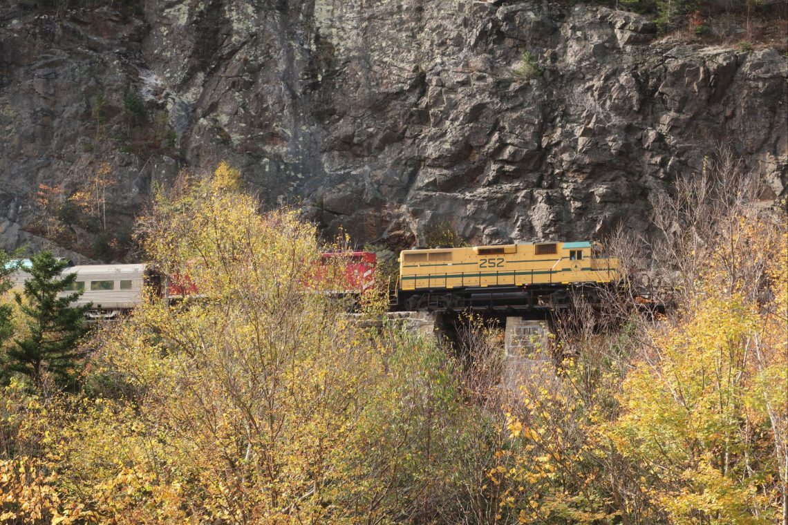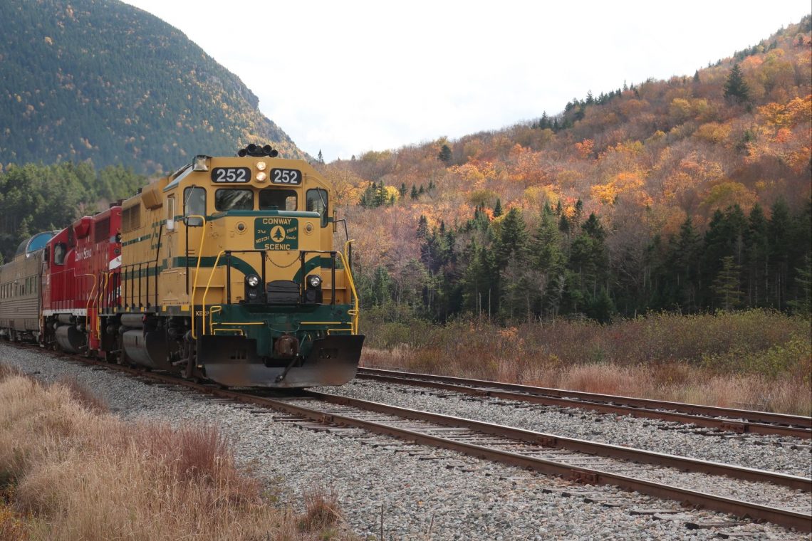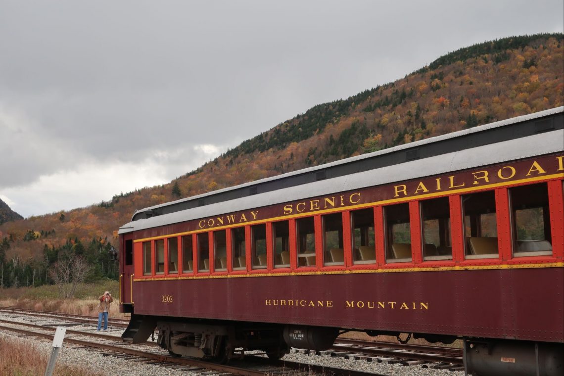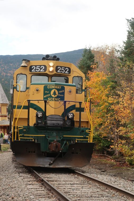 Bei der Fahrt durch die Crawford Notch hören wir plötzlich das Hupen eines Zuges. Und erinneren uns, daran, dass die Convey Scenic Railway hier durchführt. Also schnell ein Aussichtspunkt suchen und dann kommt auch schon die gelbe Lok in Sicht. Ein paar Kurven weiter ist dann der Bahnhof, an dem der Zug länger hält.