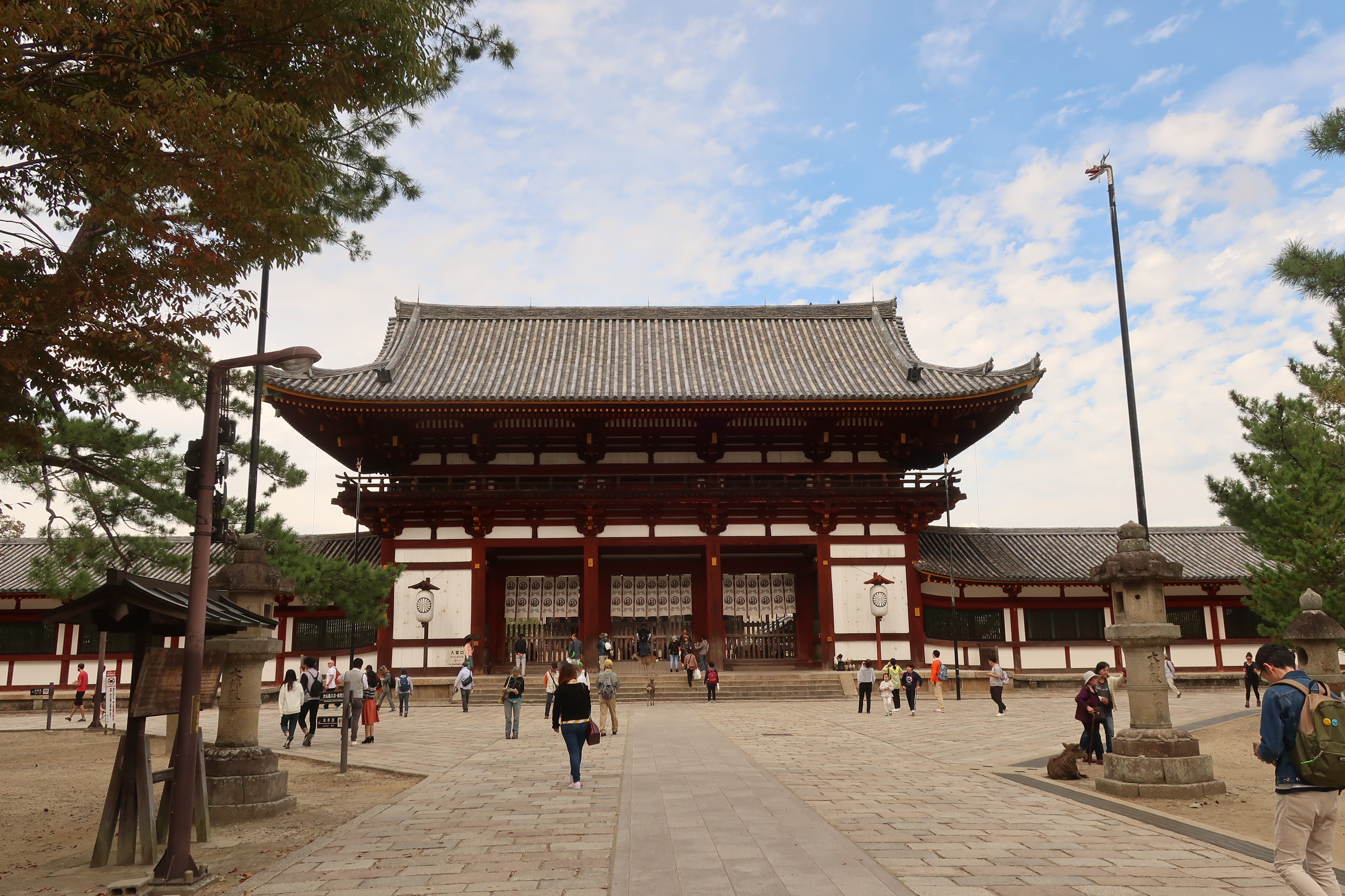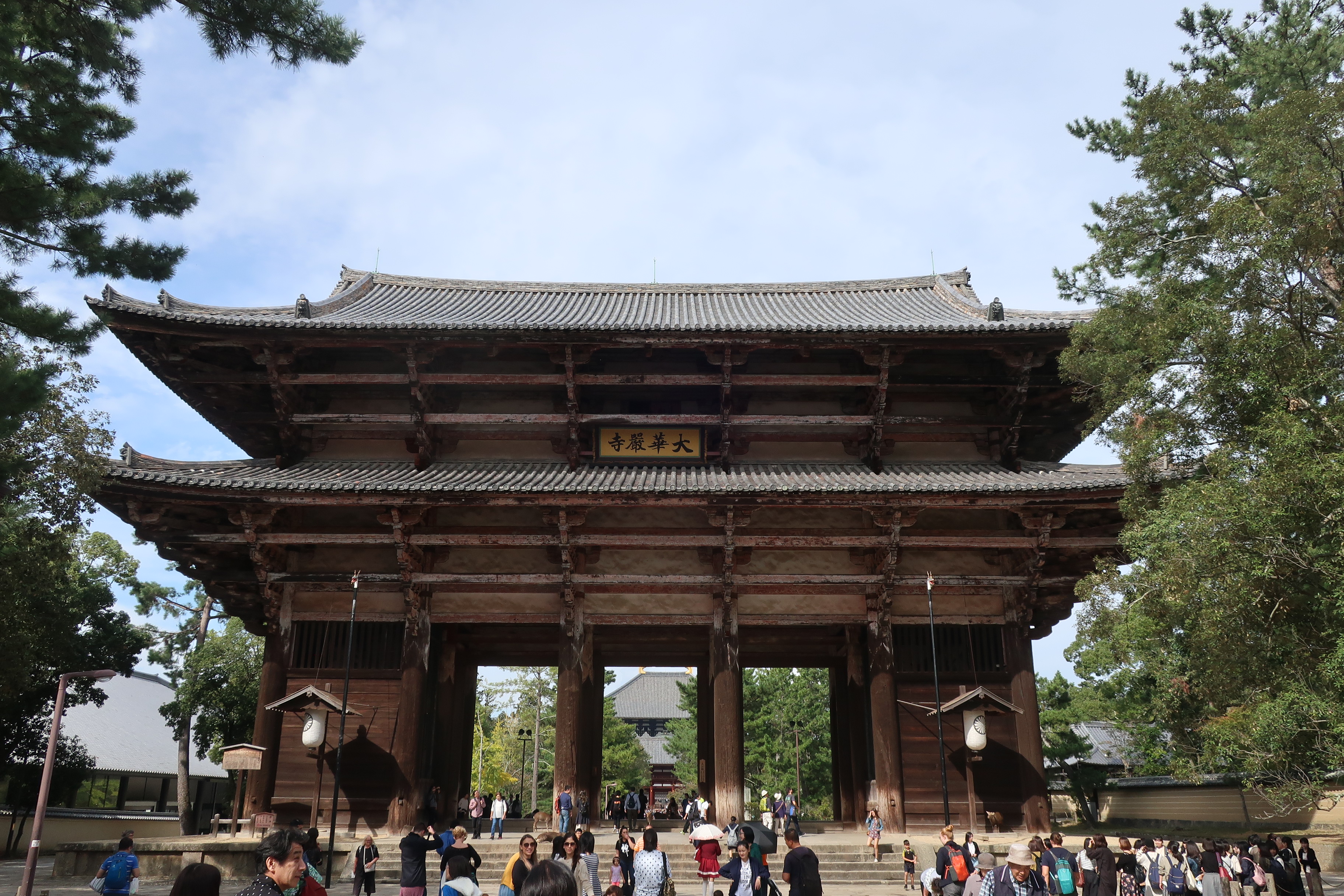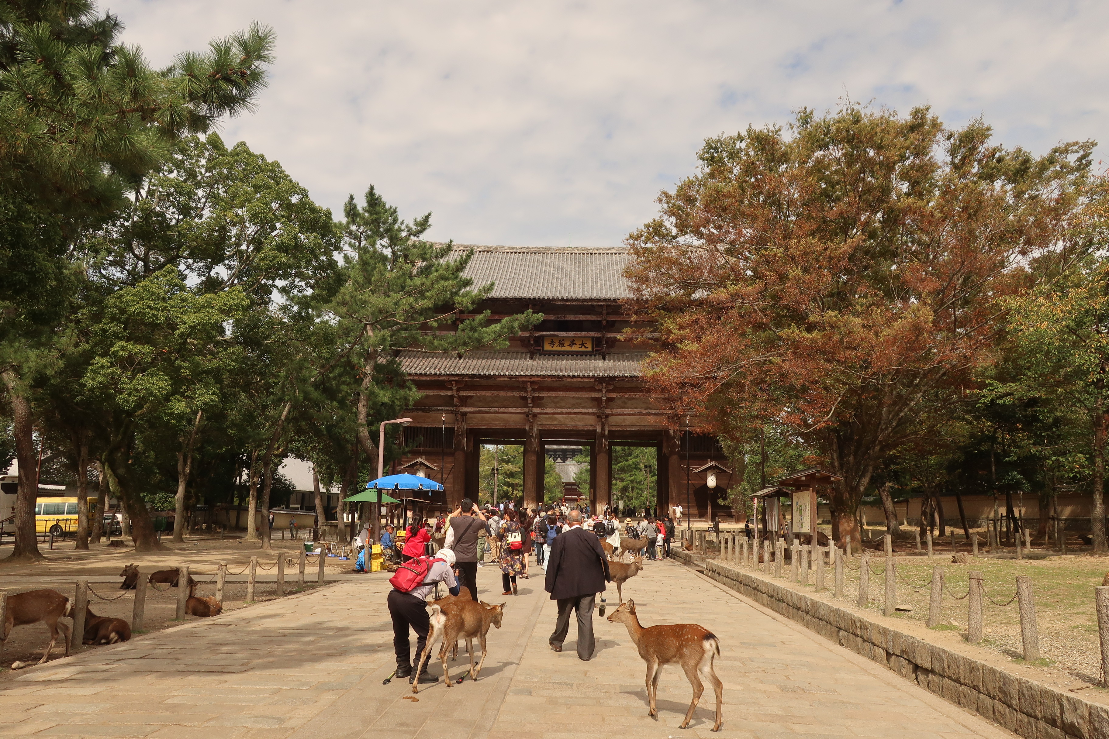Vormittags fahren wir mit dem Zug nach Nara. Die Rapid-Line braucht nur 45 Minuten. Vom Bahnhof in Nara läuft man ca. 30 Minuten bis zum Haupttempel mit dem großen Buddha. Zunächst vorbei an einigen Läden und Restaurants. Vor Letzteren steht der ein oder andere und versucht Touristen zu überzeugen, bei ihm im Laden zu essen. Weiter geht es durch den Park. Die Besonderheit hier sind die frei herumlaufenden Rehe. Sie sind zahm und an Menschen gewohnt. Wer am Straßenrand Futter kauft (sieht aus wie Kekswaffeln) wird auch gerne Mal von mehreren Tieren umzingelt und verfolgt. Besonders Kinder haben ihren Spaß hier. Entsprechend sind auch unzählige Schulklassen unterwegs. Jede Gruppe mit einfarbigen Mützen. Eindeutig erkennbar. Brav in zweier Reihen. Ruhig und geordnet.
