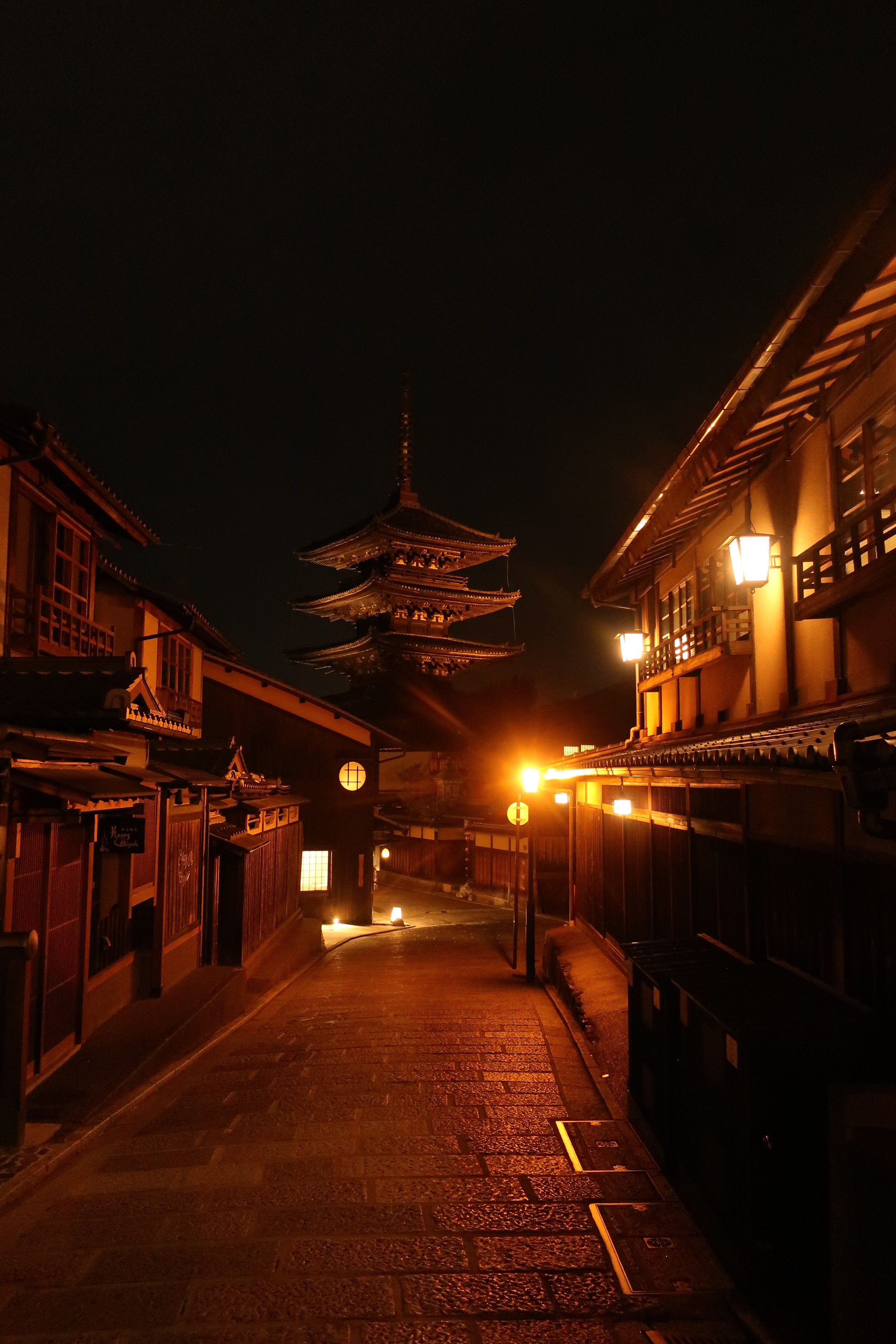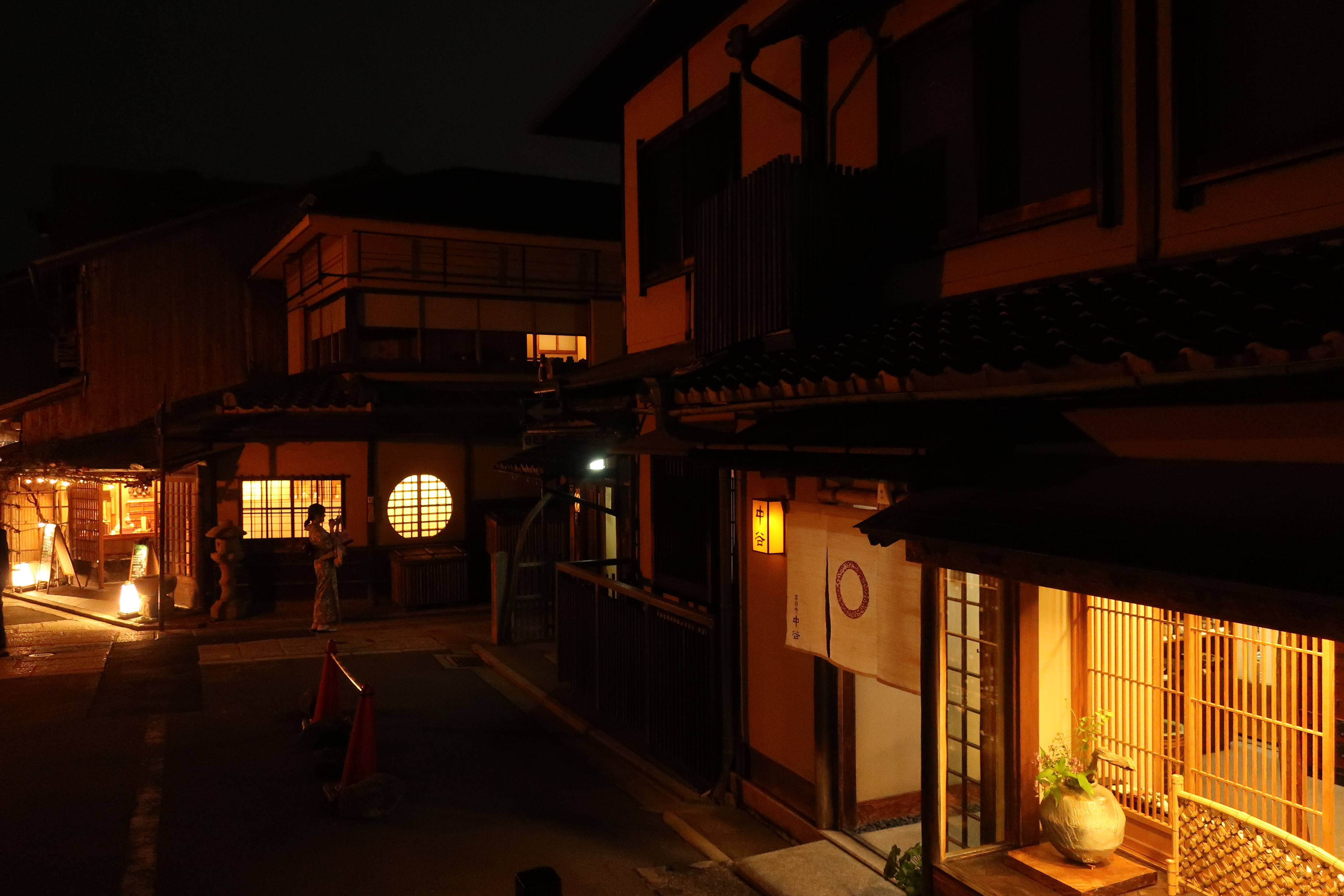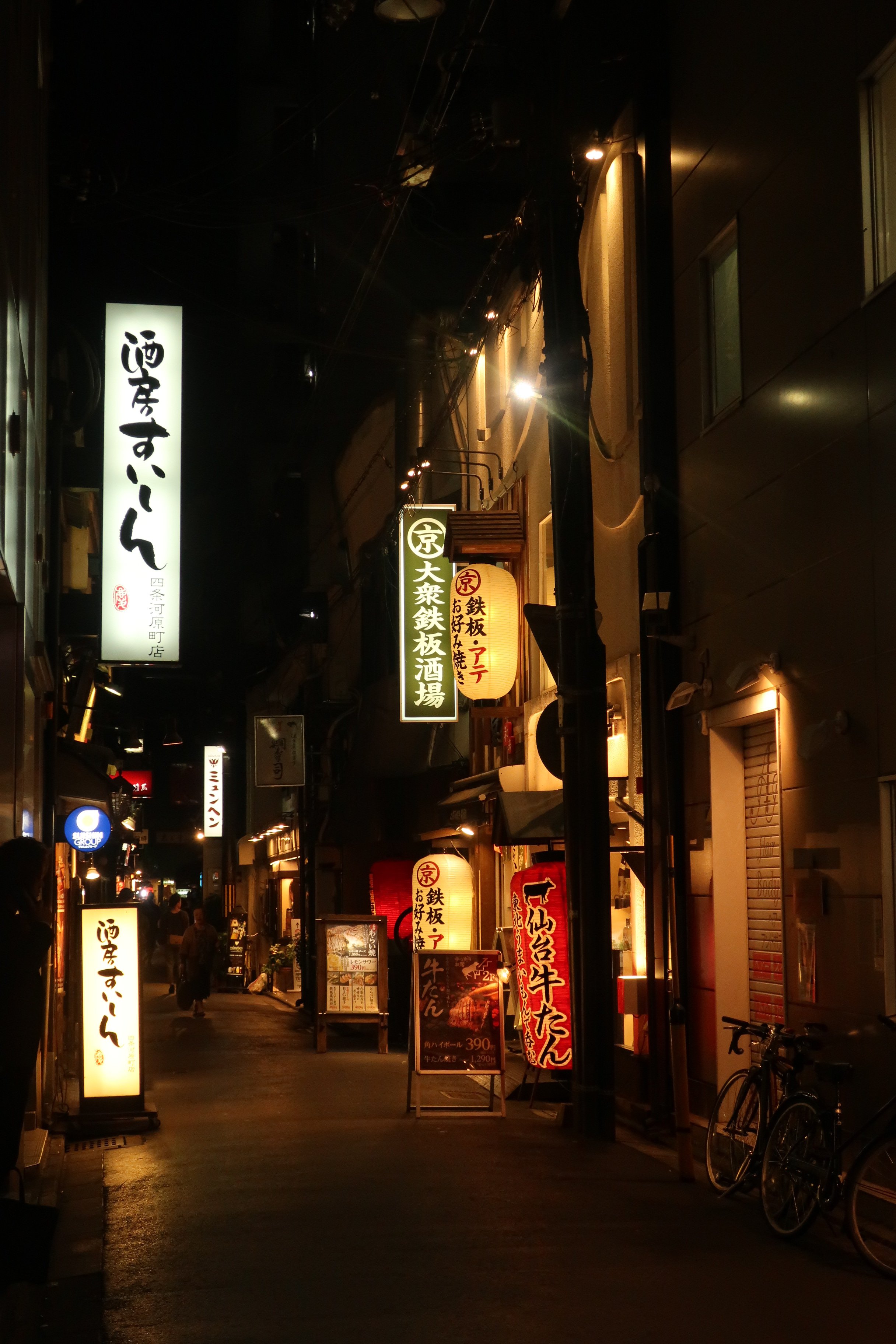 Um halb sechs wird es dann auch schon dunkel. Wir laufen in Richtung Gion. Die Straßen sind schön beleuchtet und man entdeckt noch die ein oder andere Gasse mit traditionellen Häusern.
