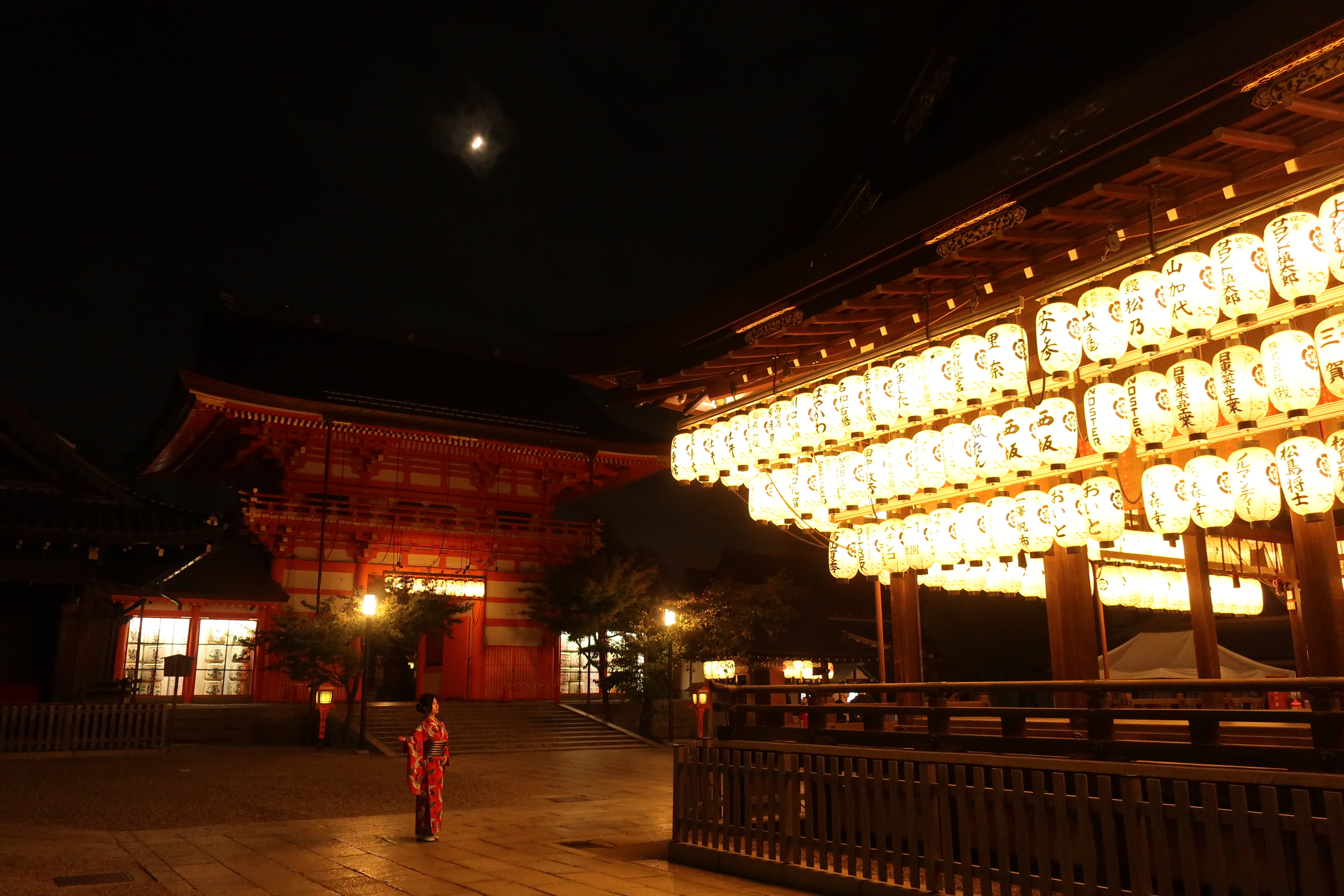 Eine ganz andere Sicht von Kyoto. Immer wieder Eingänge zu feinen Restaurants. Schick gekleidetete Menschen steigen aus teuren Autos (durchaus auch mal mit Chauffeur) und werden mit vielen Verbeugungen vom Personal ins Restaurant geleitet. Hier und da ein Tempel. Besonders der Yasaka Shrine mit seinen leuchtenden Laternen ist schön anzusehen.