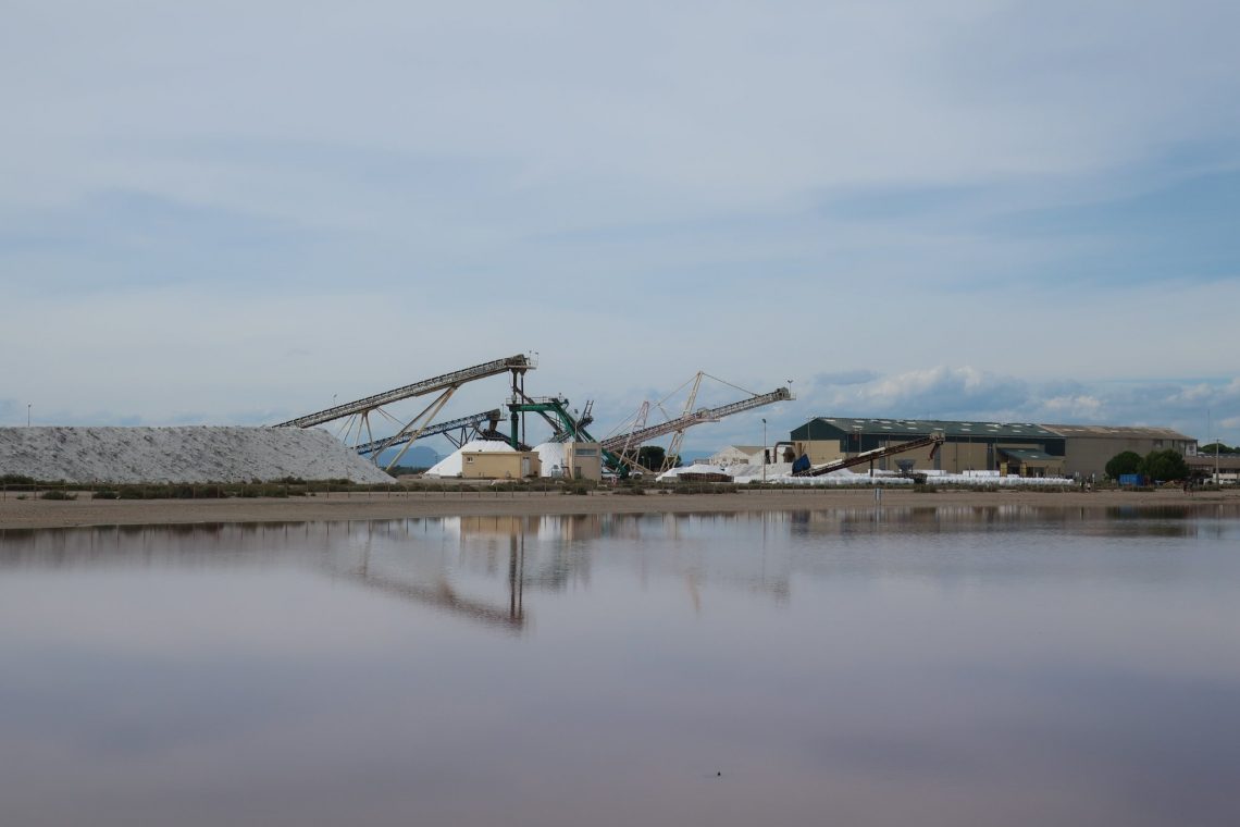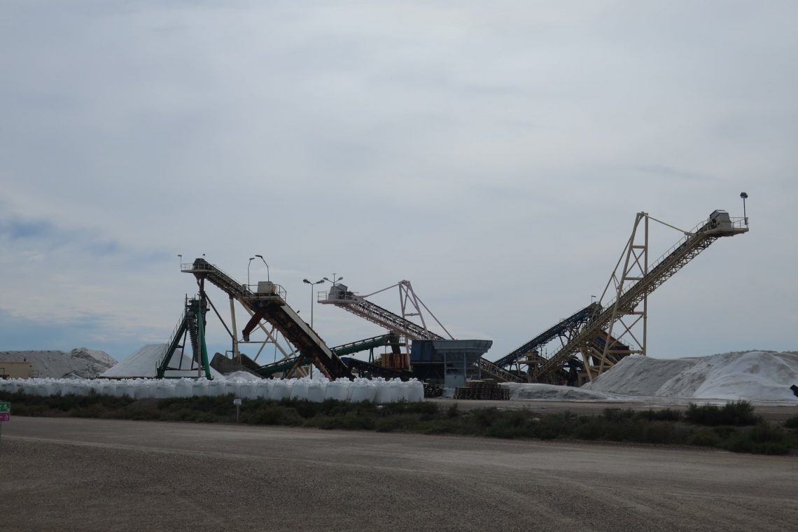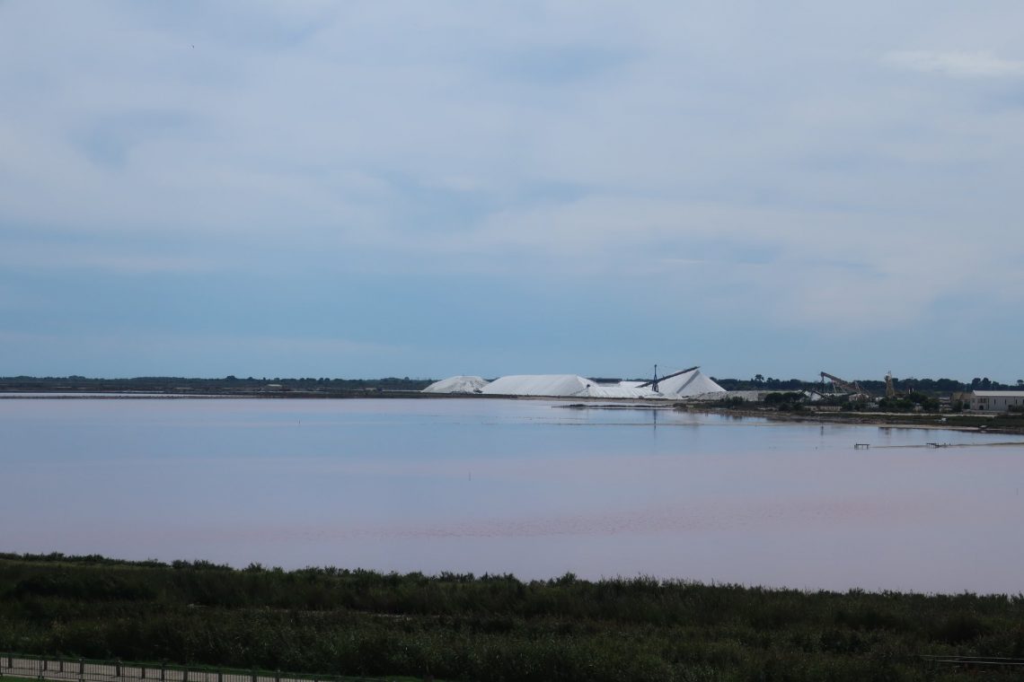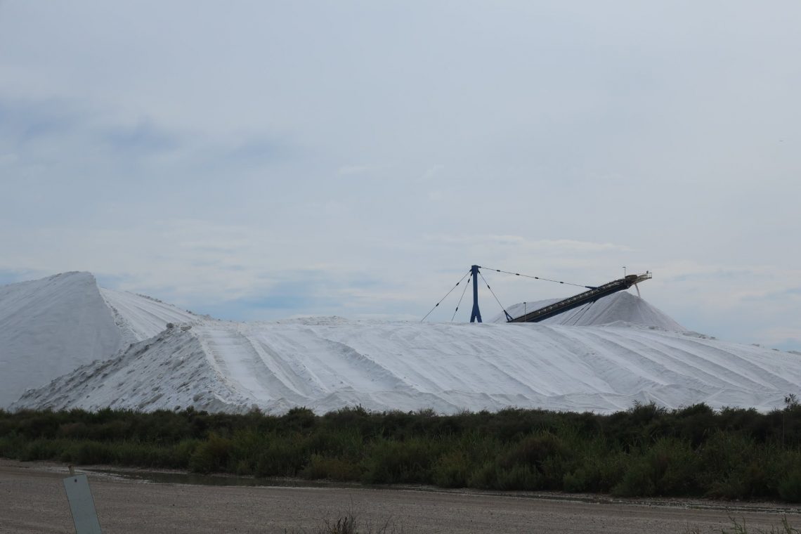 Le Salin d’Aigues-Mortes – südlich von Aigues-Mortes wird Salz gewonnen. Gegen Eintritt kann man einen Rundgang machen (ca. 4km zu Fuß). Die Becken enthalten flaches Meerwasser. Je nach Wärme schimmert das Wasser rosa. Eine schöne Kulisse mit den mächtigen Stadtmauern von Aigues-Mortes im Hintergrund. Auf dem ersten Blick fühlt man sich an eine Kiesgrube erinnert. Große Muldenkipper, die das abgebaute Salz transportieren, Förderbänder zur Weiterverarbeitung und weiße, große Berge – aus Salz.