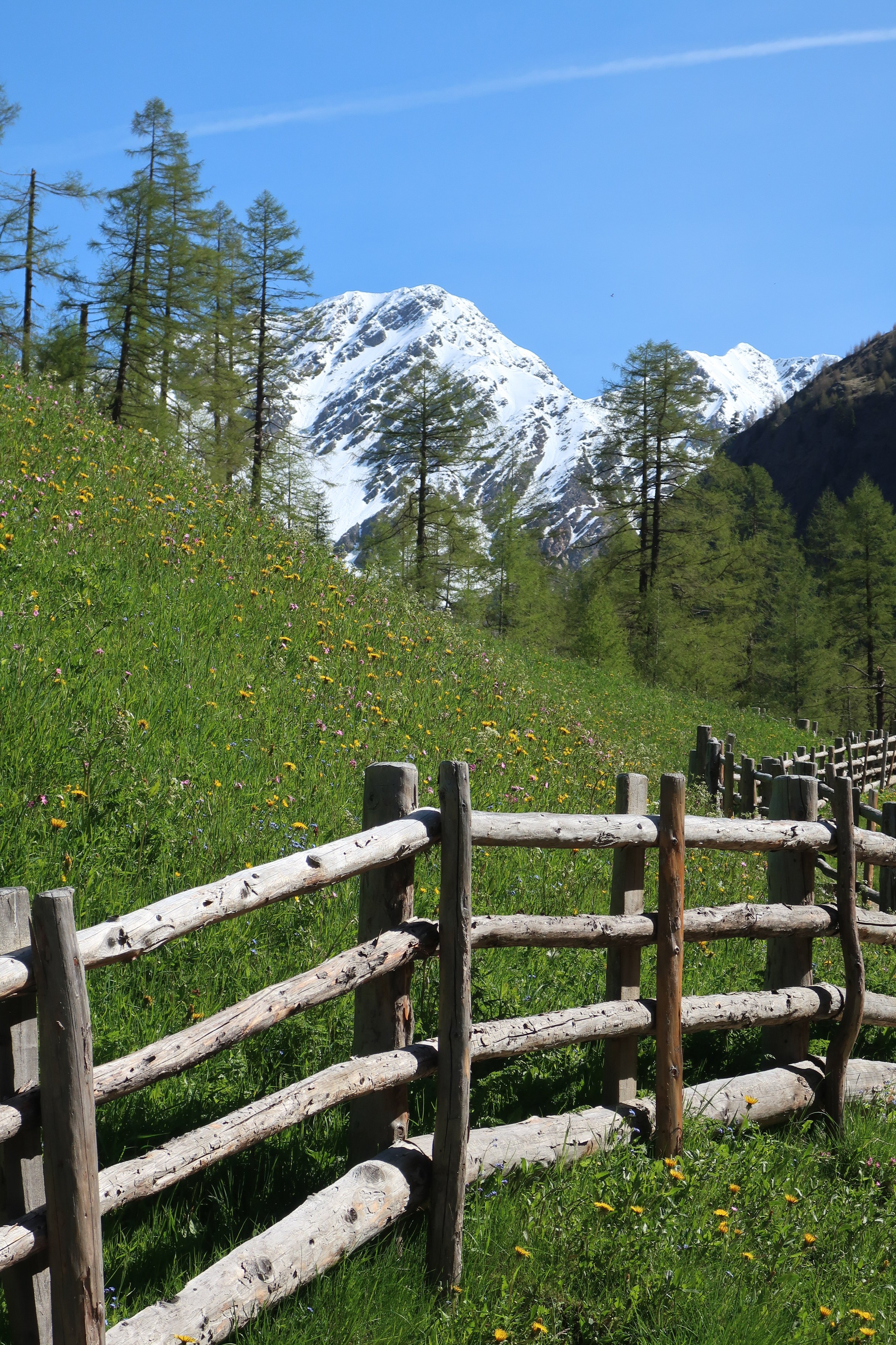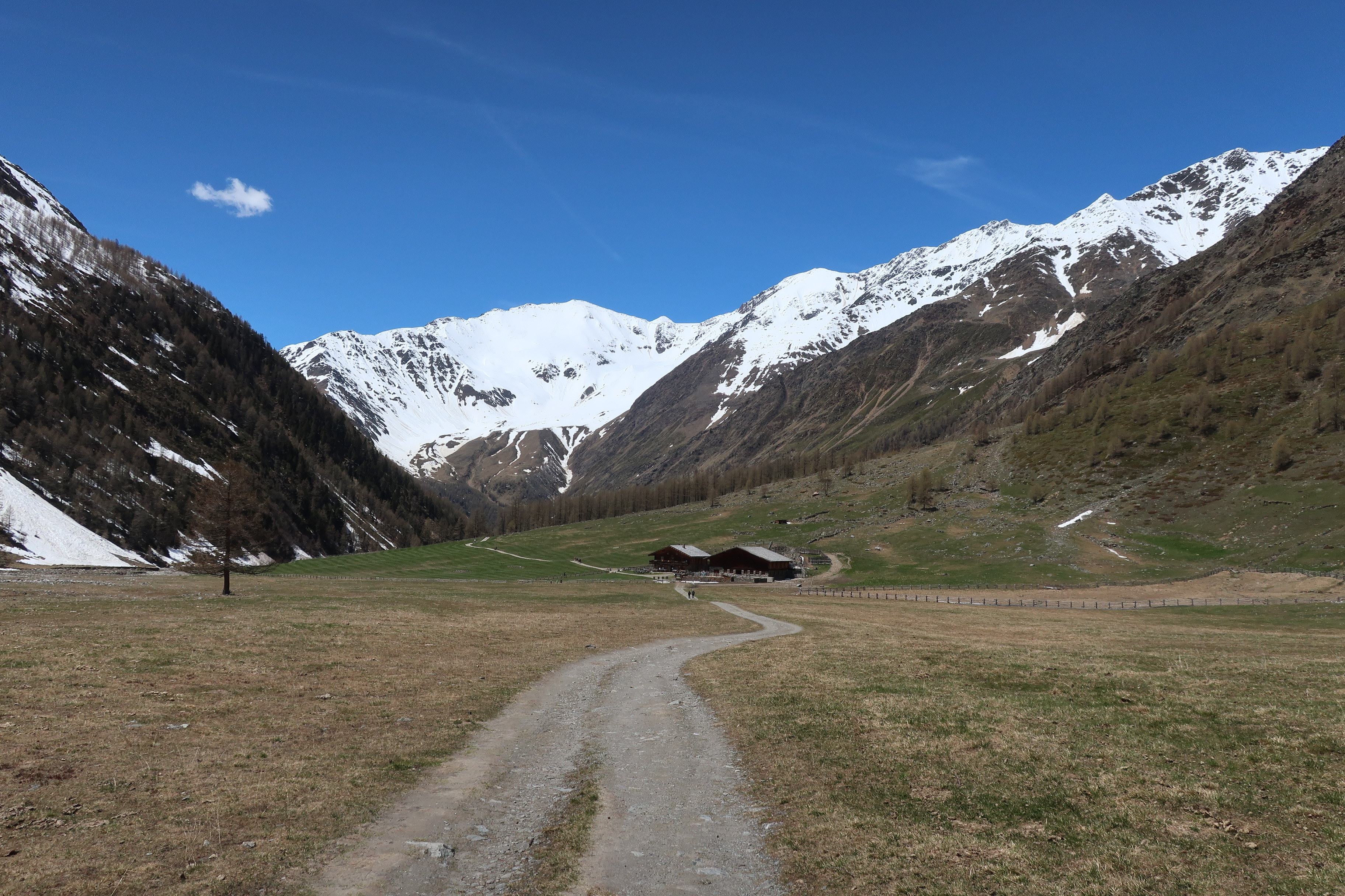 Der Teil des Meraner Höhenweg ist gut ausgebaut. Ein schmaler, geschotterter Fahrweg führt zur Eishof Alm. Die Hütte liegt auf 2067 m an der Baumgrenze. Es wird immer karger, die Natur verändert sich.