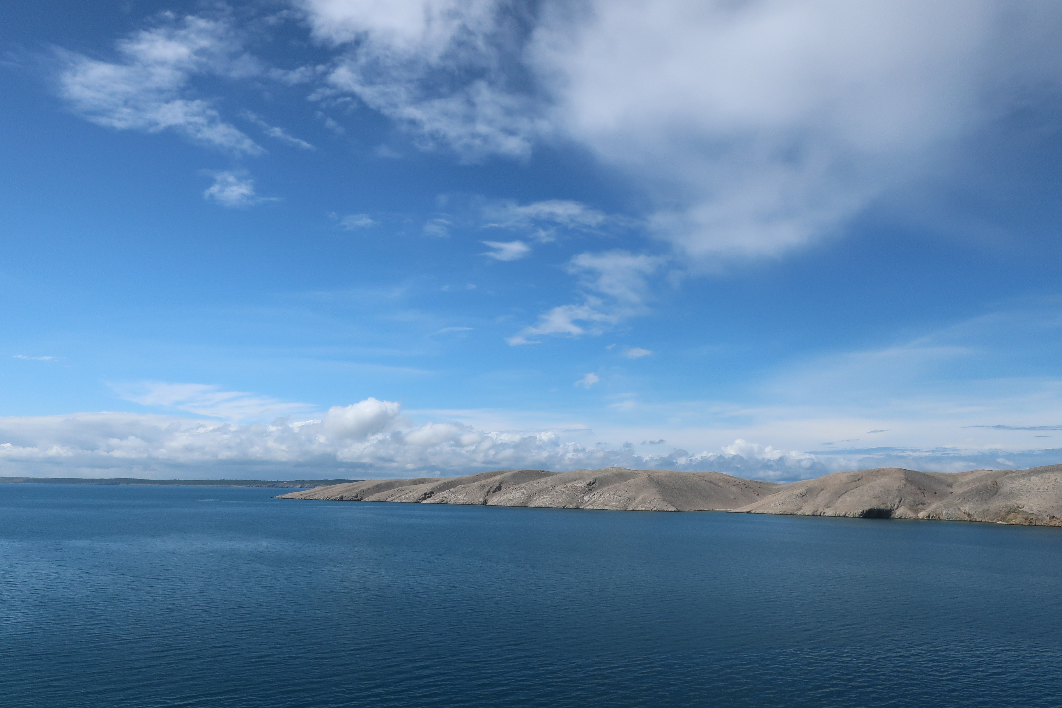 Nach heftigen Gewittern in der Nacht ist morgens die Luft wieder klar. Die Sonne strahlt uns vom blauen Himmel entgegen. Die Insel Pag zeigt sich nochmal in ihrem schönsten Licht, als wir abfahren.