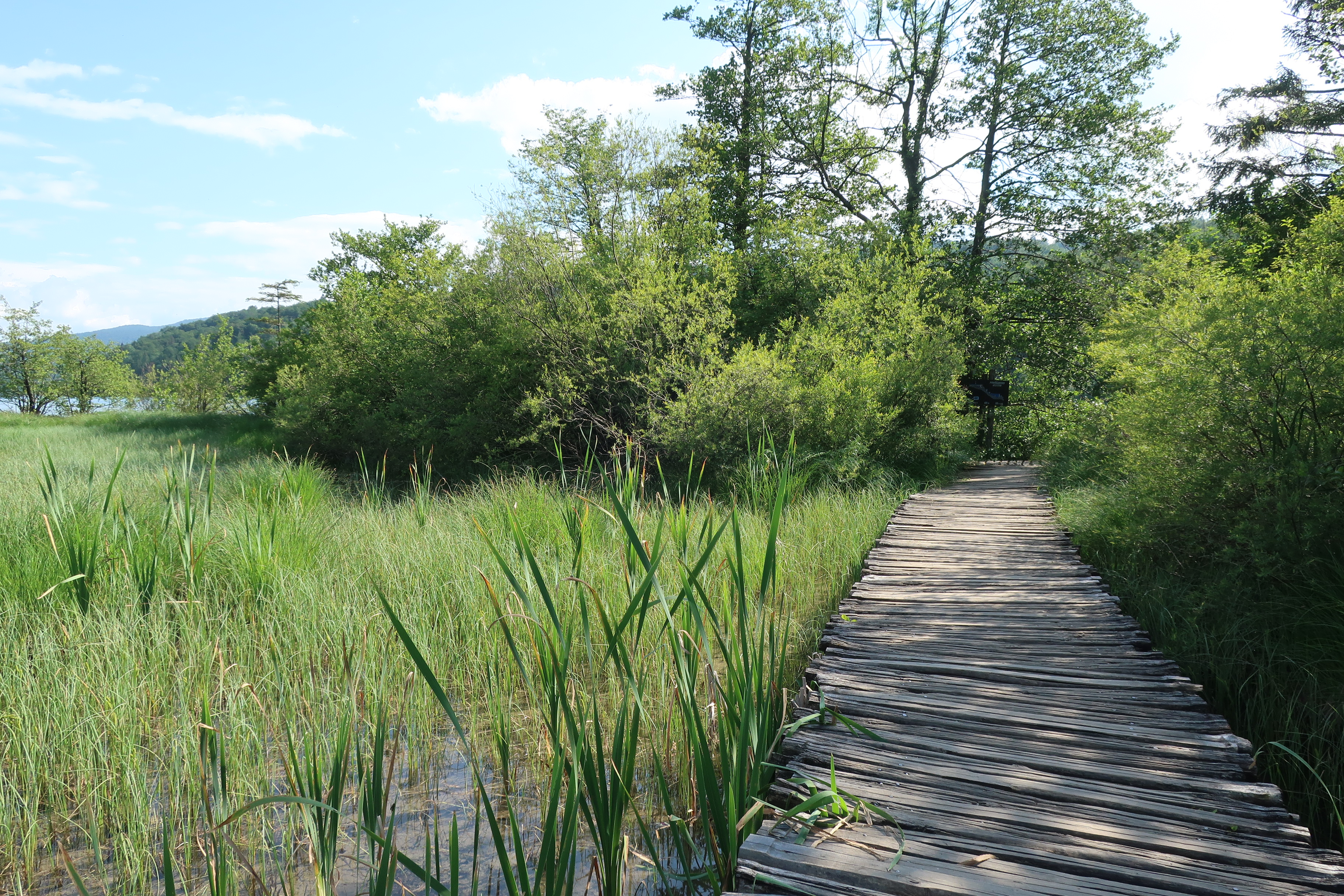 Am Eingang 2 ist einiges los. Auf großen Tafeln finden wir Wandervorschläge, die auf verschiedenen Routen durch den Park führen. Meist geht man über Holzstege und geschotterte Wege, vorbei an Wasserfälle, Seen und Bäumen und Büschen. Überall plätschert es. Kleine und große Wasserläufe. Mal unter dem Steg, mal daneben. Dann wieder ein großer Wasserfall, der den oberen See mit dem nächst unteren verbindet. Libellen mit großen Augen fliegen nah an uns vorbei.