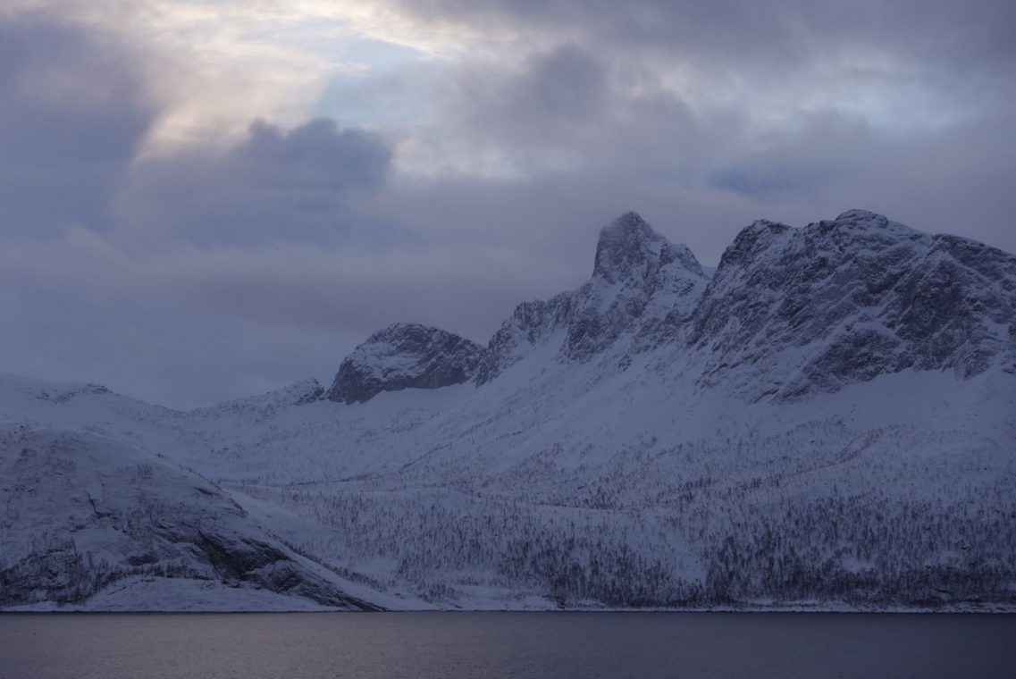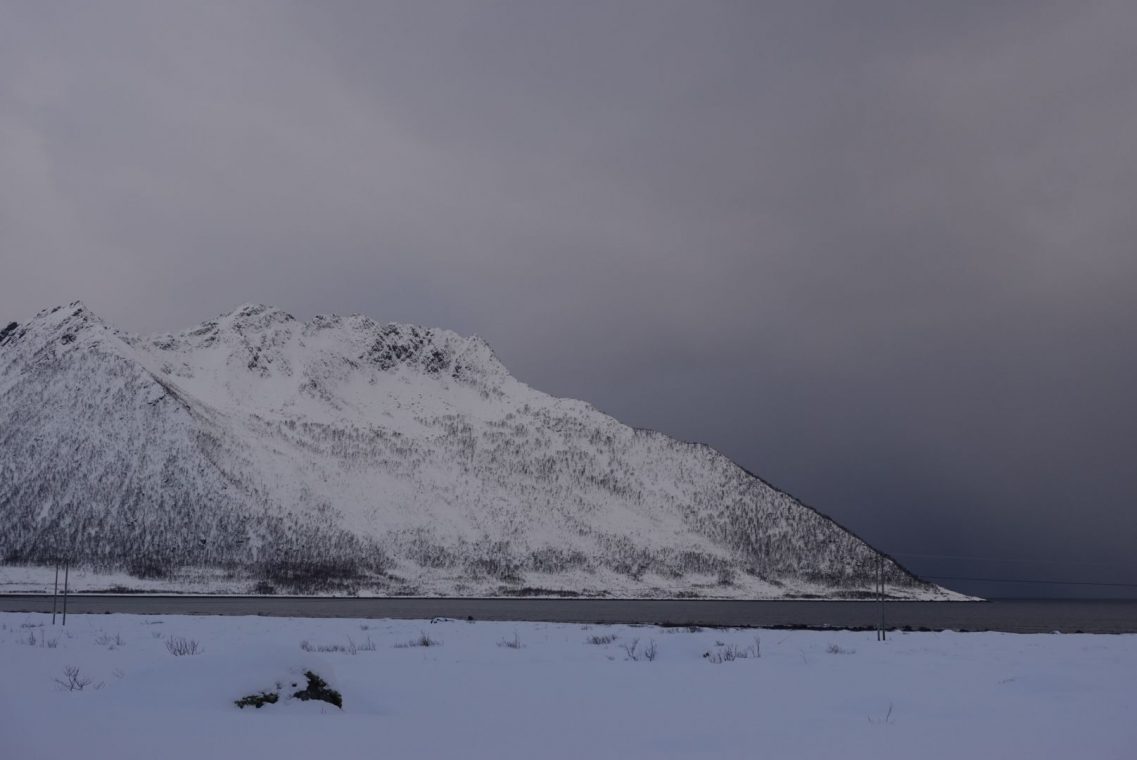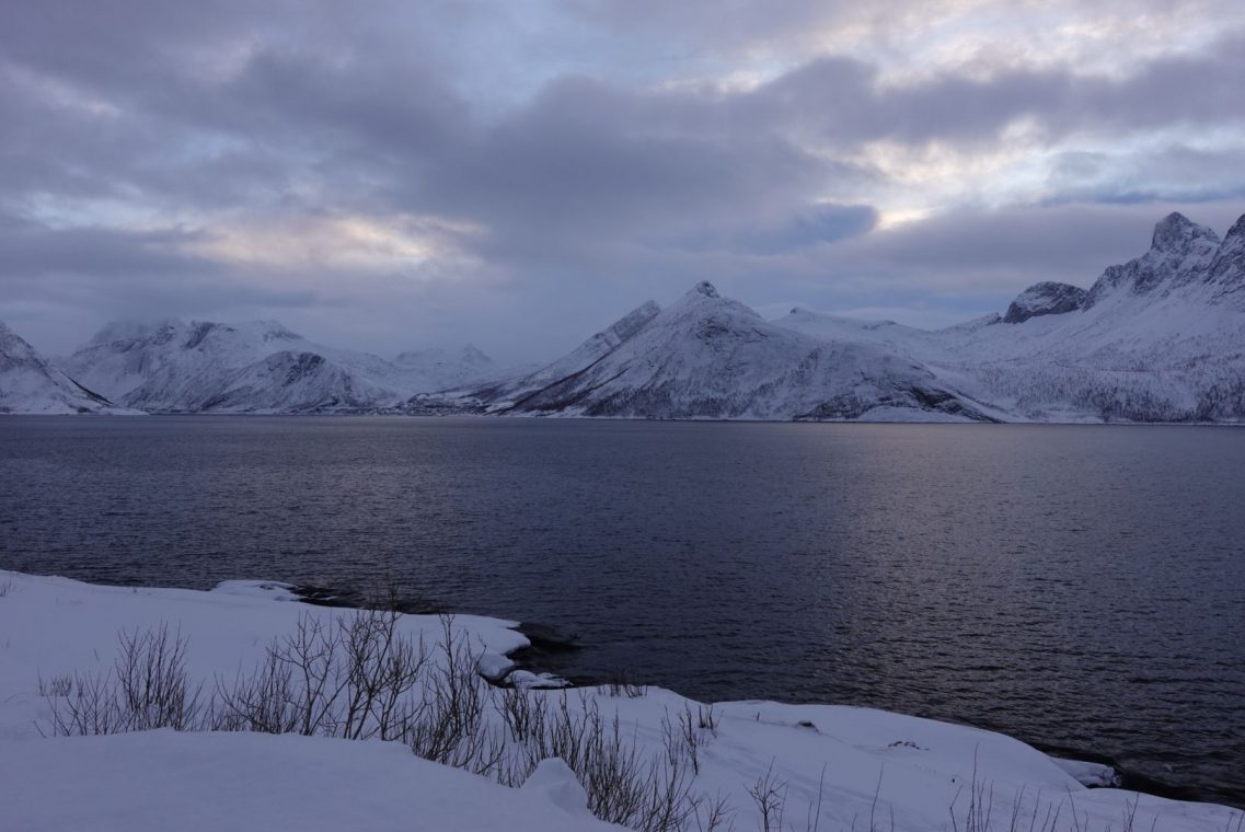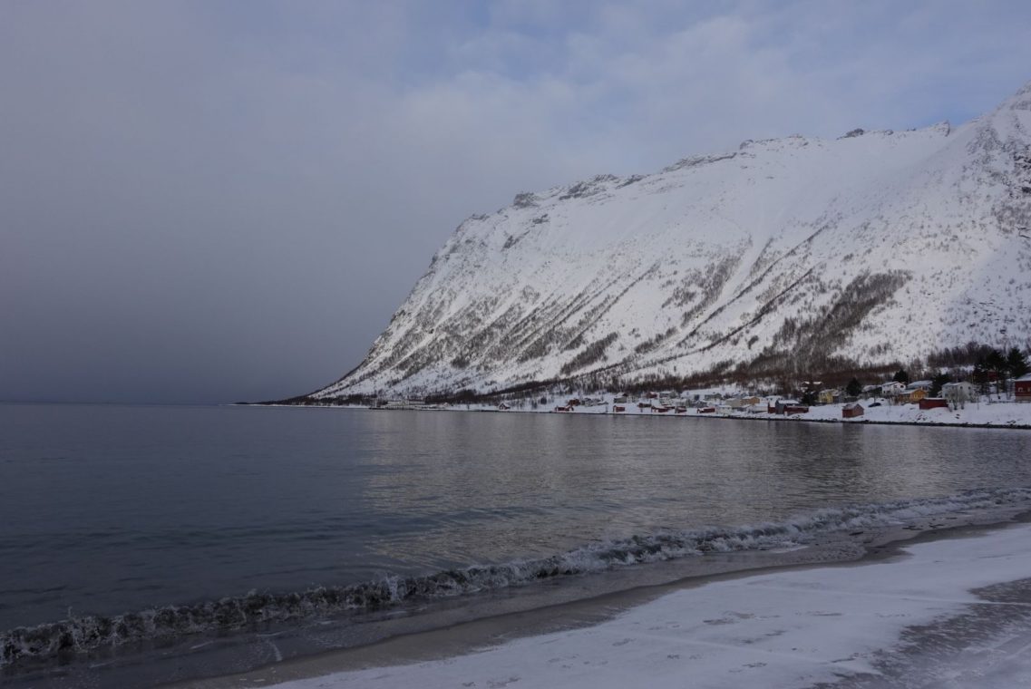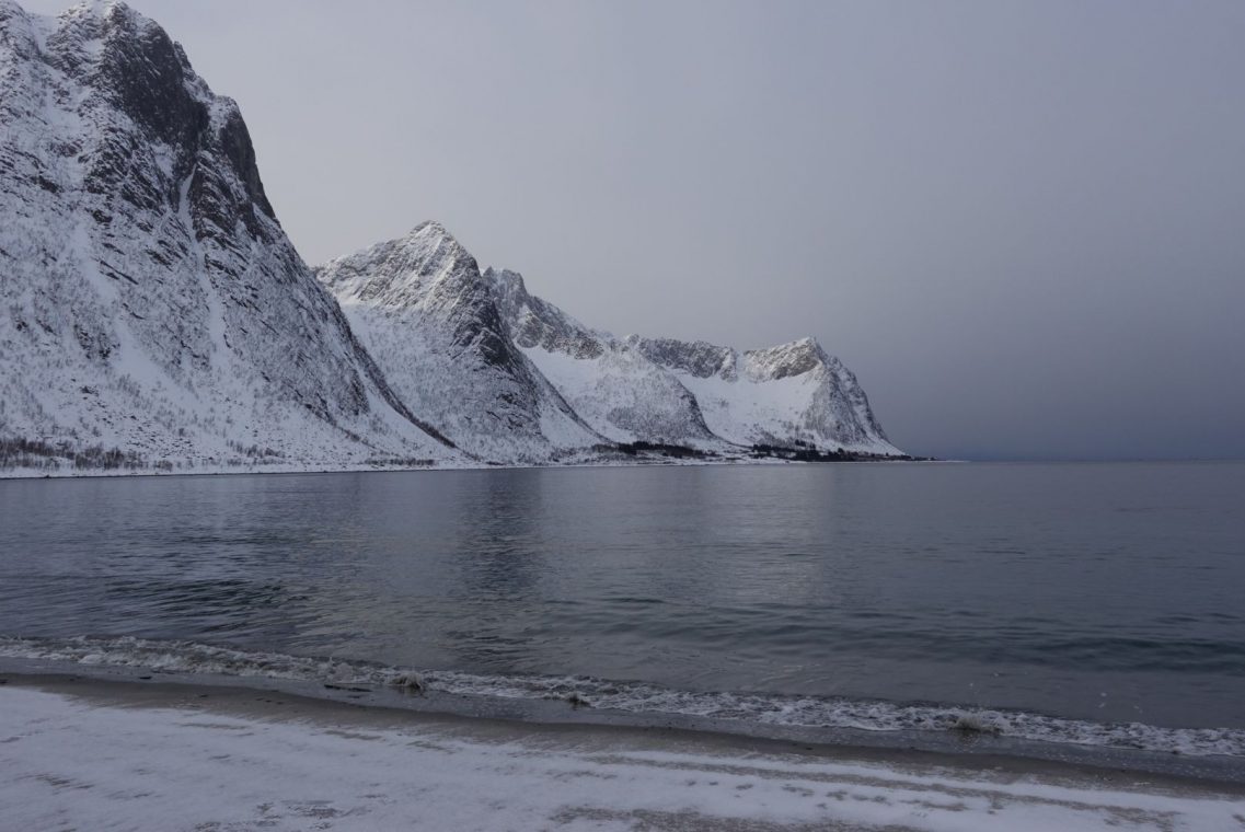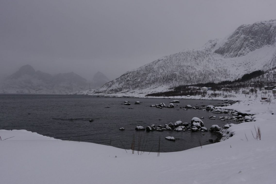 Es schneit leicht, ganz weiche Flocken. Stille. Ruhe. Ein Gefühl, das wir die letzten Tage nicht erlebt haben. Die unglaubliche Landschaft, die Berge, das Meer, der Fjord, alles wirkt klarer, stärker, beeindruckender. Am Rückweg kommt noch die Sonne hinter den Wolken hervor, was will man mehr.