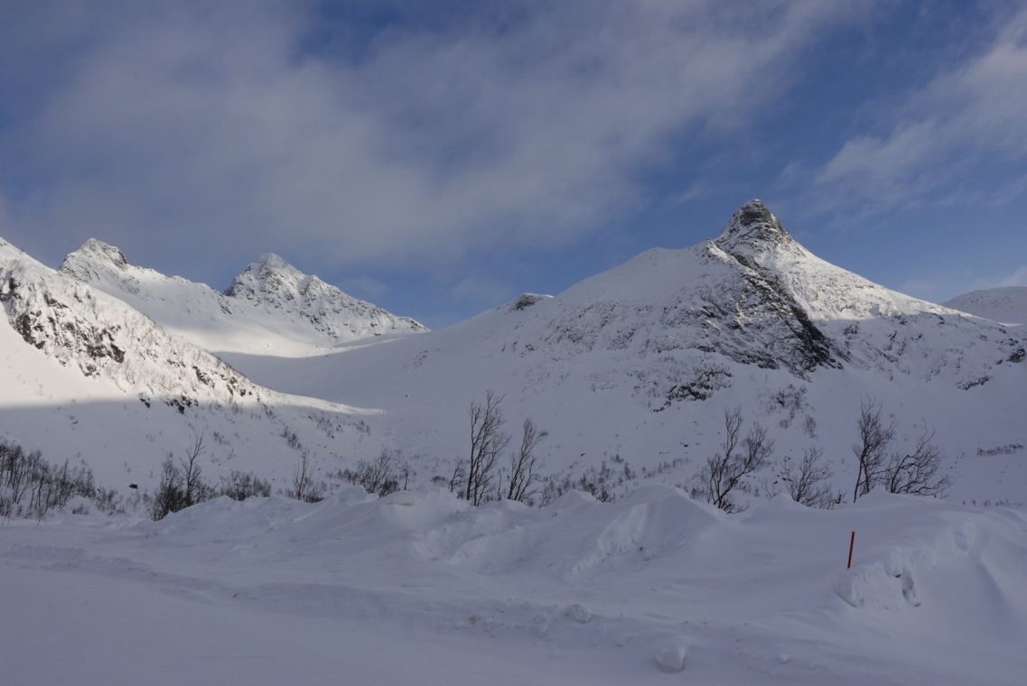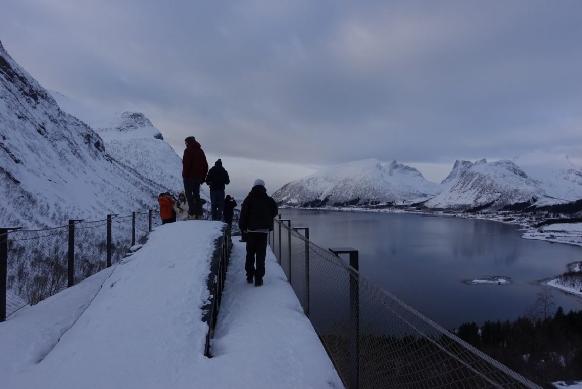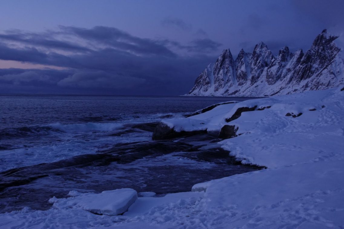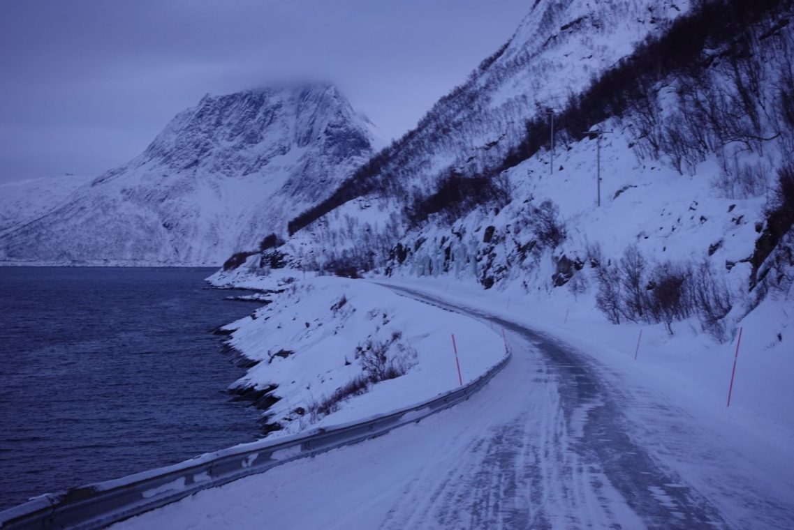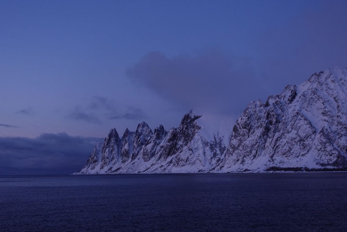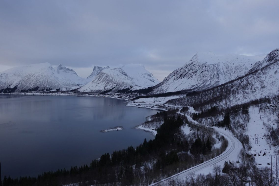 Es schneit leicht, ganz weiche Flocken. Stille. Ruhe. Ein Gefühl, das wir die letzten Tage nicht erlebt haben. Die unglaubliche Landschaft, die Berge, das Meer, der Fjord, alles wirkt klarer, stärker, beeindruckender. Am Rückweg kommt noch die Sonne hinter den Wolken hervor, was will man mehr.