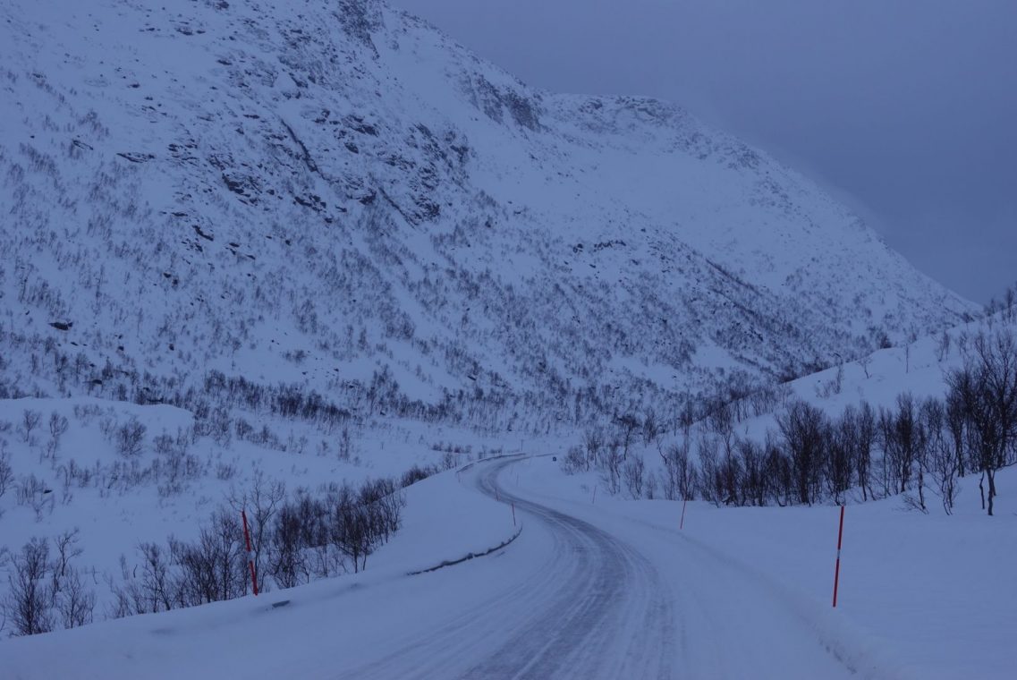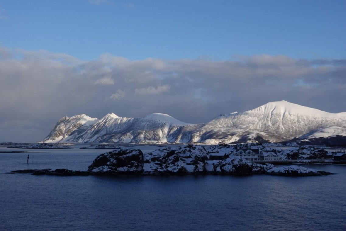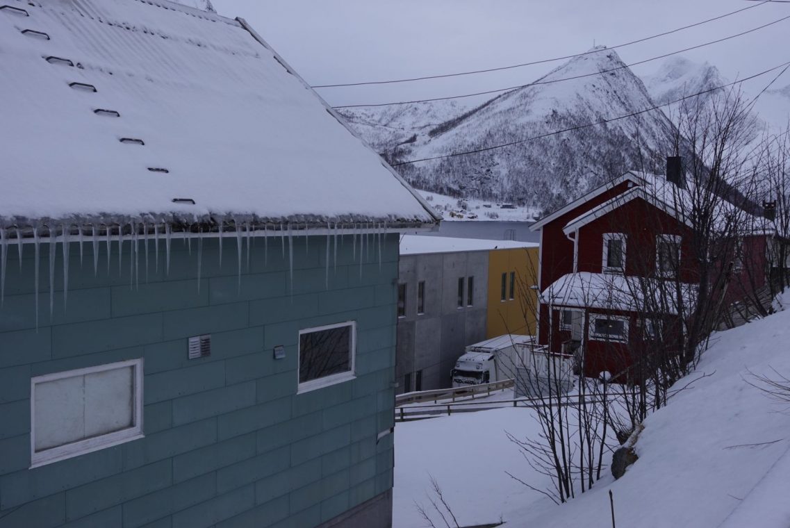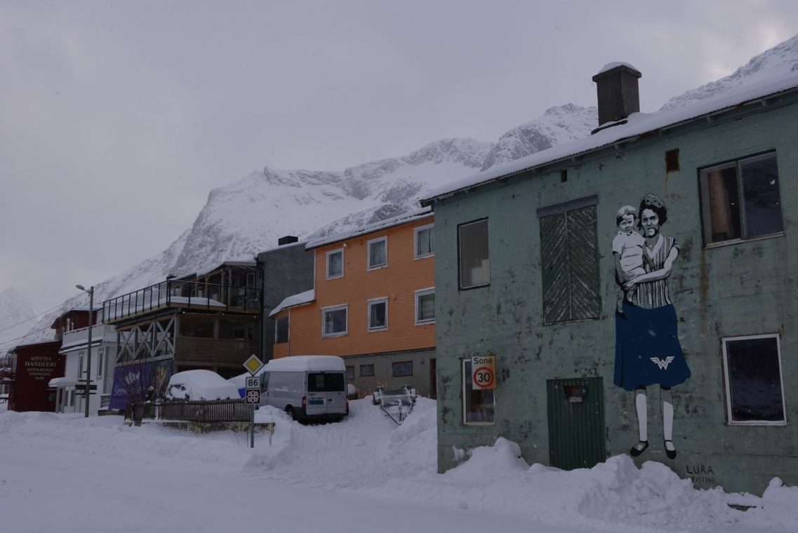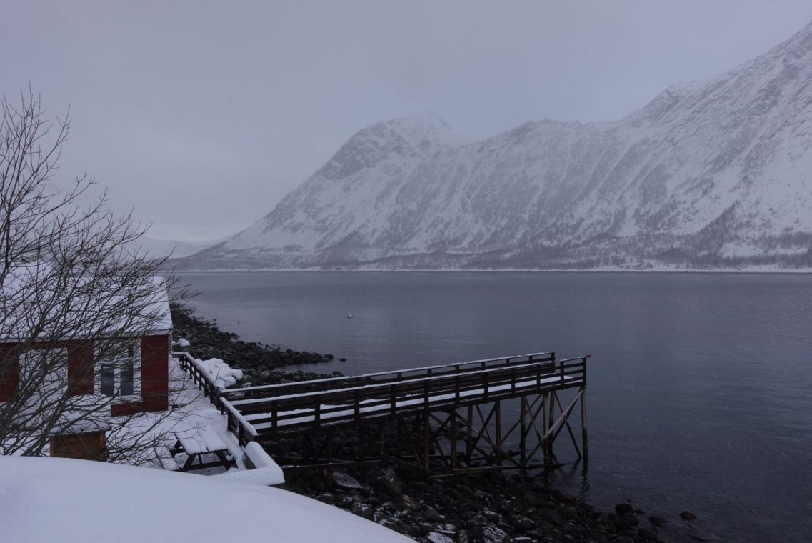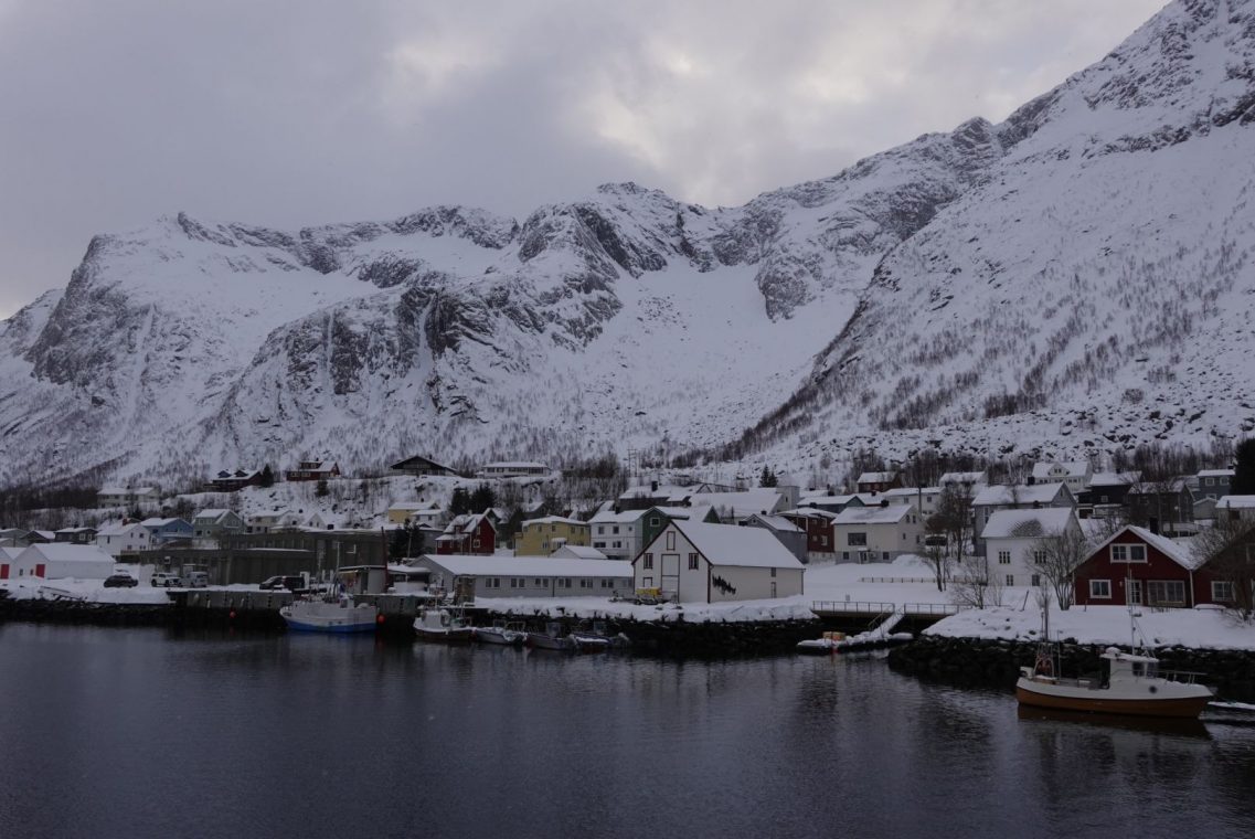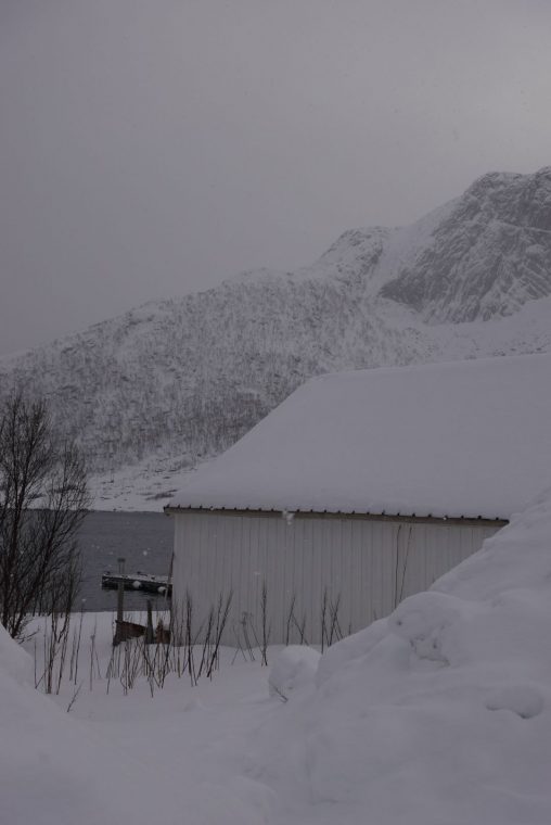 In dem kleinen Ort Mefjordvaer bekommen wir im hier ansässigen Hotel einen guten Kaffee. Vielleicht beim nächsten Mal ein guter Übernachtungsort? Heute genießen wir den wunderbaren Schnee, dicke Flocken fallen leise vom Himmel. Der kleine Ort mit seinen bunten Häuser – ruhig, einsam und richtig schön gelegen.