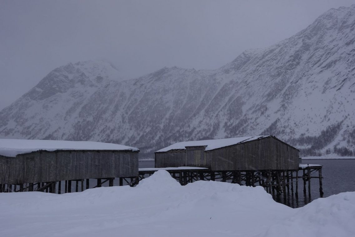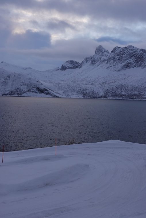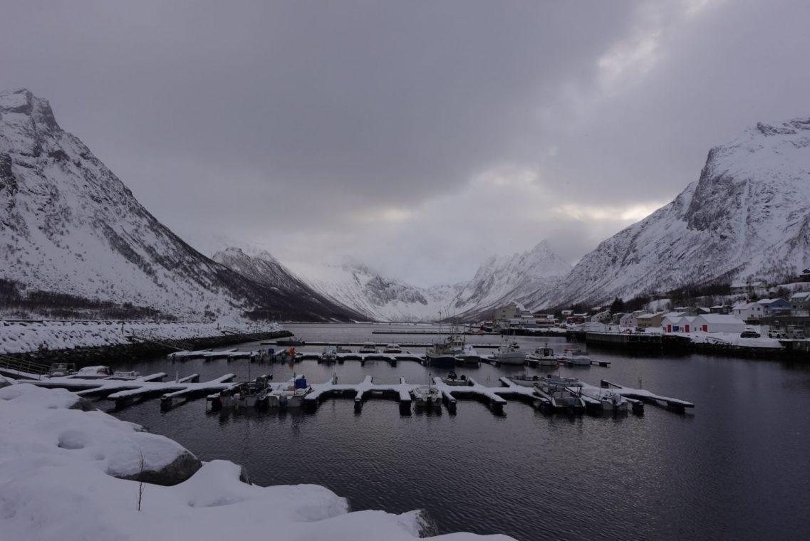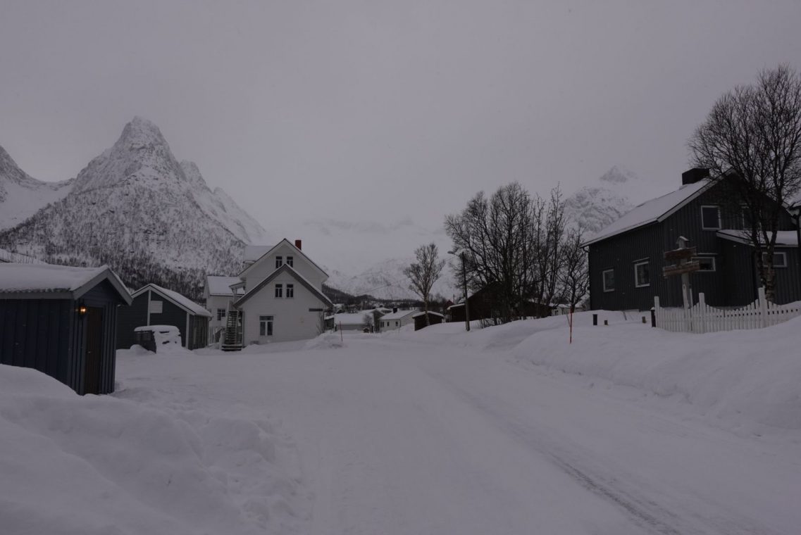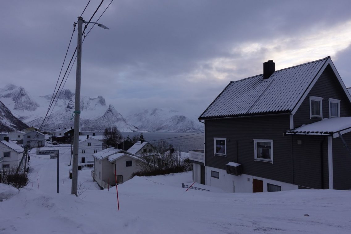 Morgens fahren wir nach Gryllefjord. In dem kleinen Ort legt im Sommer die Fähre nach Andesnes ab. Erinnerungen an unseren letztjährigen Urlaub dort werden wach … Jedenfalls ist der Ort gerade im Winterschlaf, da die Fähre um diese Jahreszeit nicht fährt. Keine Touristen – außer uns. Es herrscht absolute Ruhe. Wenige Autos vor dem örtlichen Supermarkt, ein Spaziergänger mit Hund – und ein älterer Herr mit Tretschlitten, der so seine Einkäufe über die verschneiten Straßen transportiert.