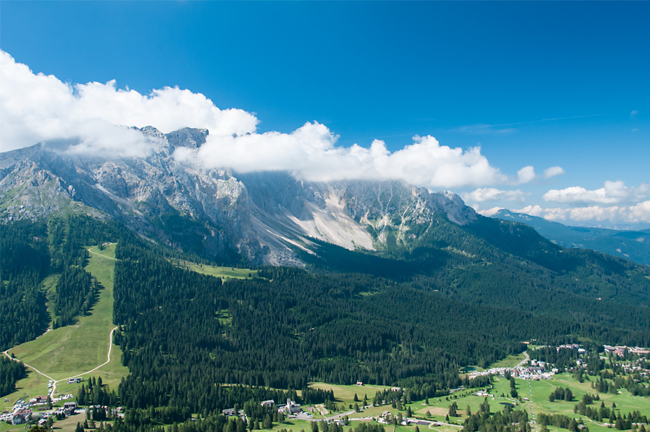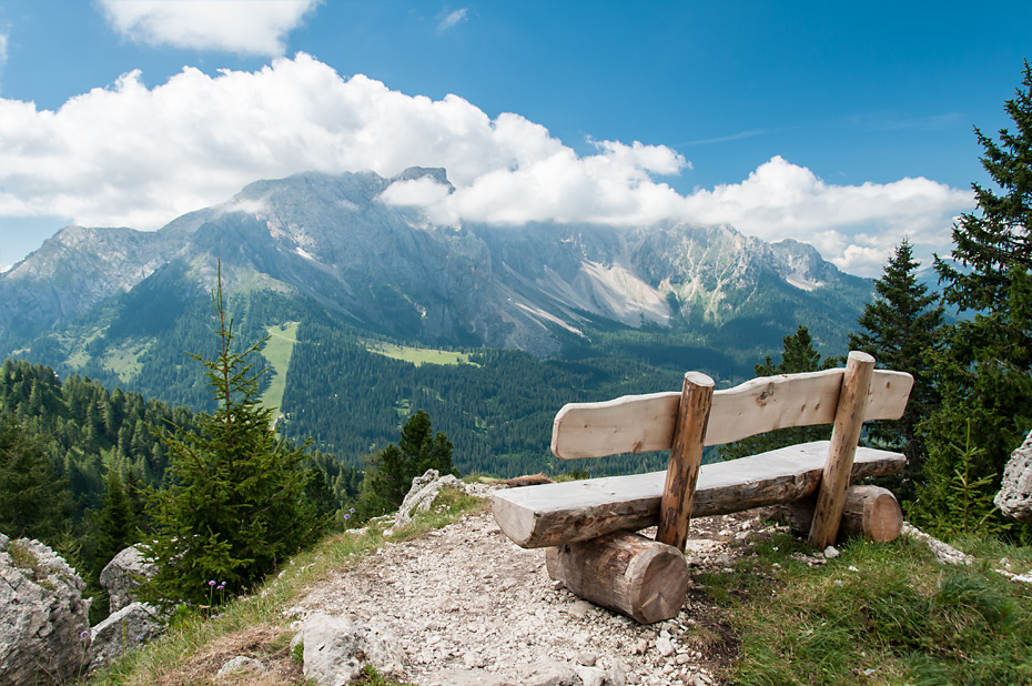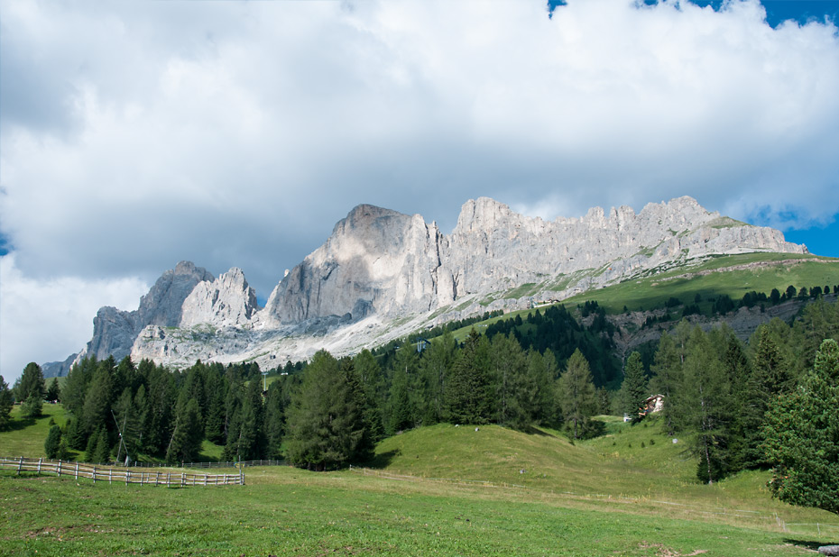 Nachdem wir den Aufstieg über Almen und vorbei an ein paar Golfplätzen hinter uns hatten, bot sich uns ein unvergleichliches Panorama hinüber zum Latemar. Es war noch recht früh am Morgen und die Wolken um die Gipfel des Latemar waren gerade erst dabei sich aufzulösen.