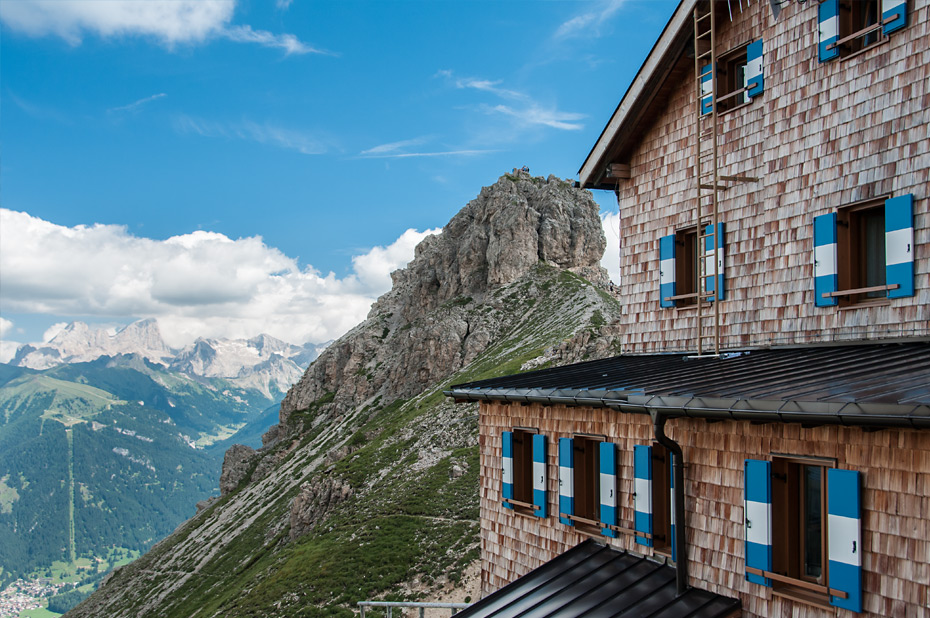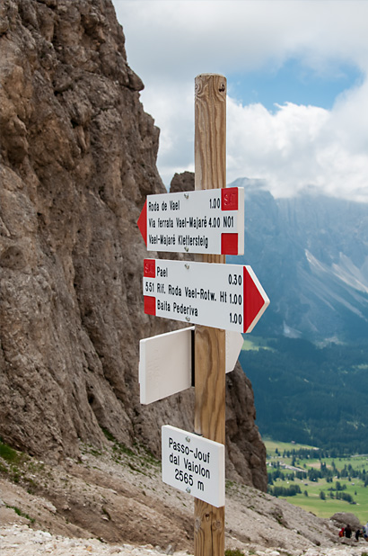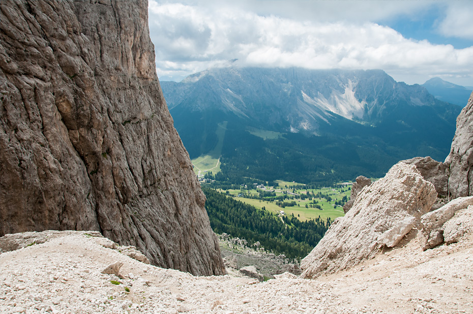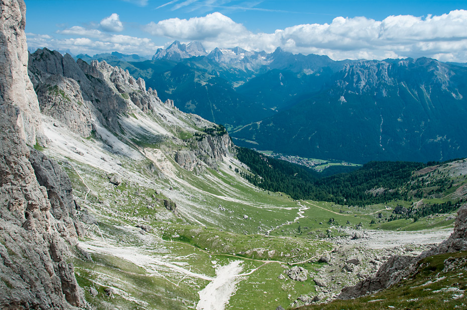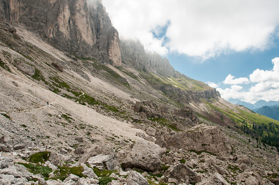 Die Wolken hatten sich bei uns nun mittlerweile ganz verzogen und als wir auf der Passhöhe angekommen waren boten sich uns traumhafte Ausblicke zurück zum Latemar und auf der anderen Seite bis hin zu den Bergstöcken der Seiser Alm.
