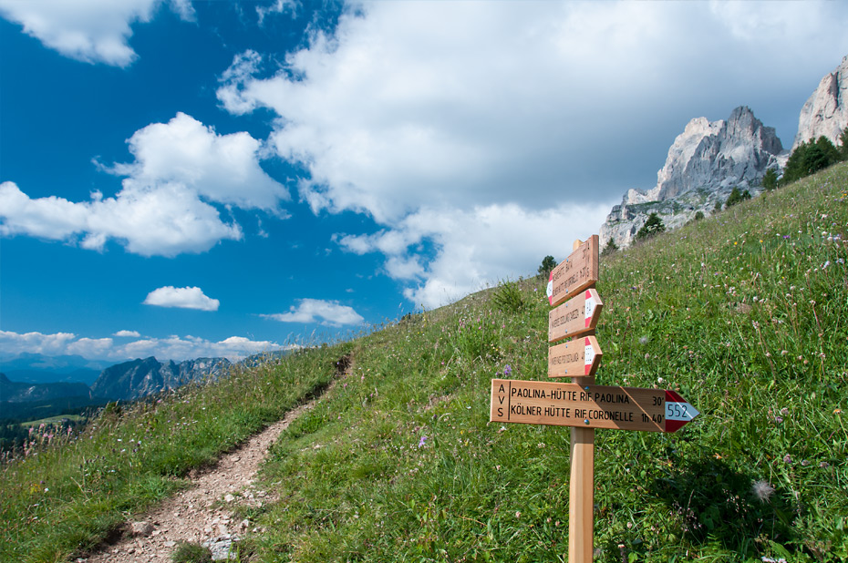 Von nun an ging es größtenteils nur noch bergab. Mal auf sanft abfallenden Steigen, mal in steileren Serpentinen. Unser nächstes Ziel war die Paolina-Hütte. Dort machten wir Rast, bevor es in einem langen Rechtsbogen zurück zur Bergstation des Sessellifts ging und von da an auf kleinen Wegen über Almen zurück zum Parkplatz.