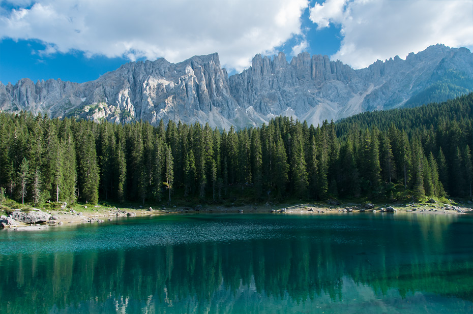 Aber so touristisch der See auch sein mag: Als wir dort waren, war es schon recht spät am Tag. Viele Touristen waren nicht mehr da und das warme Licht der Nachmittagssonne strahlte weich auf den See und den dahinter liegenden Latemar.