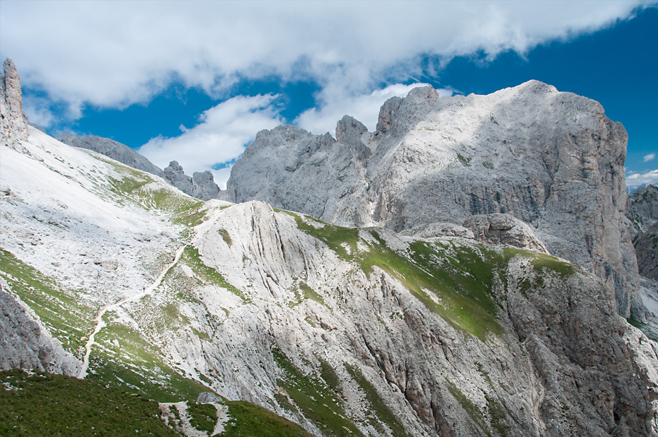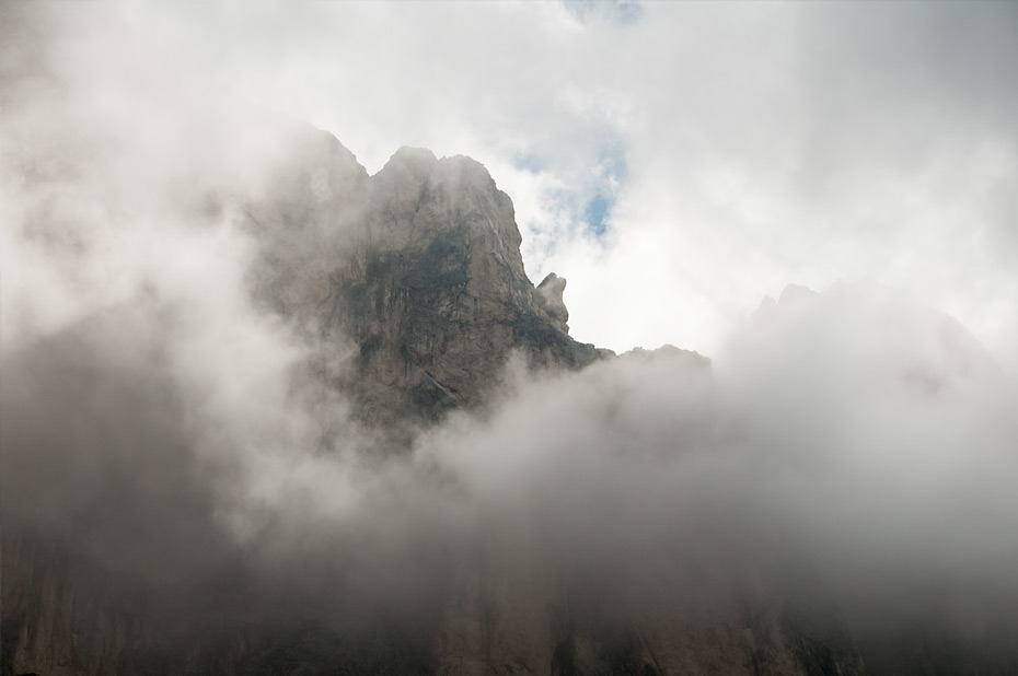 Nicht so bei uns im Rosengarten. Die Gipfel waren noch dick in Wolken gehüllt und nur an ein paar Stellen schien ab und zu der blaue Himmel durch. Aber das sollte im Laufe des Vormittags noch deutlich besser werden.