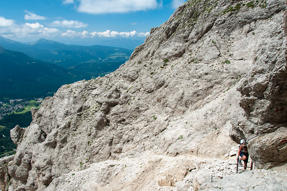 Nachdem wir etwa eine dreiviertel Stunde lang ungefähr auf gleicher Höhe entlang der Bergwand gewandert waren, zweigte der Steig hoch zum Vallon Pass rechts ab. Zuerst ging es in leichten Serpentinen bergan, dann wurden die Serpentinen so langsam immer enger und steiler bis es nur noch auf einer Eisenleiter weiter ging.