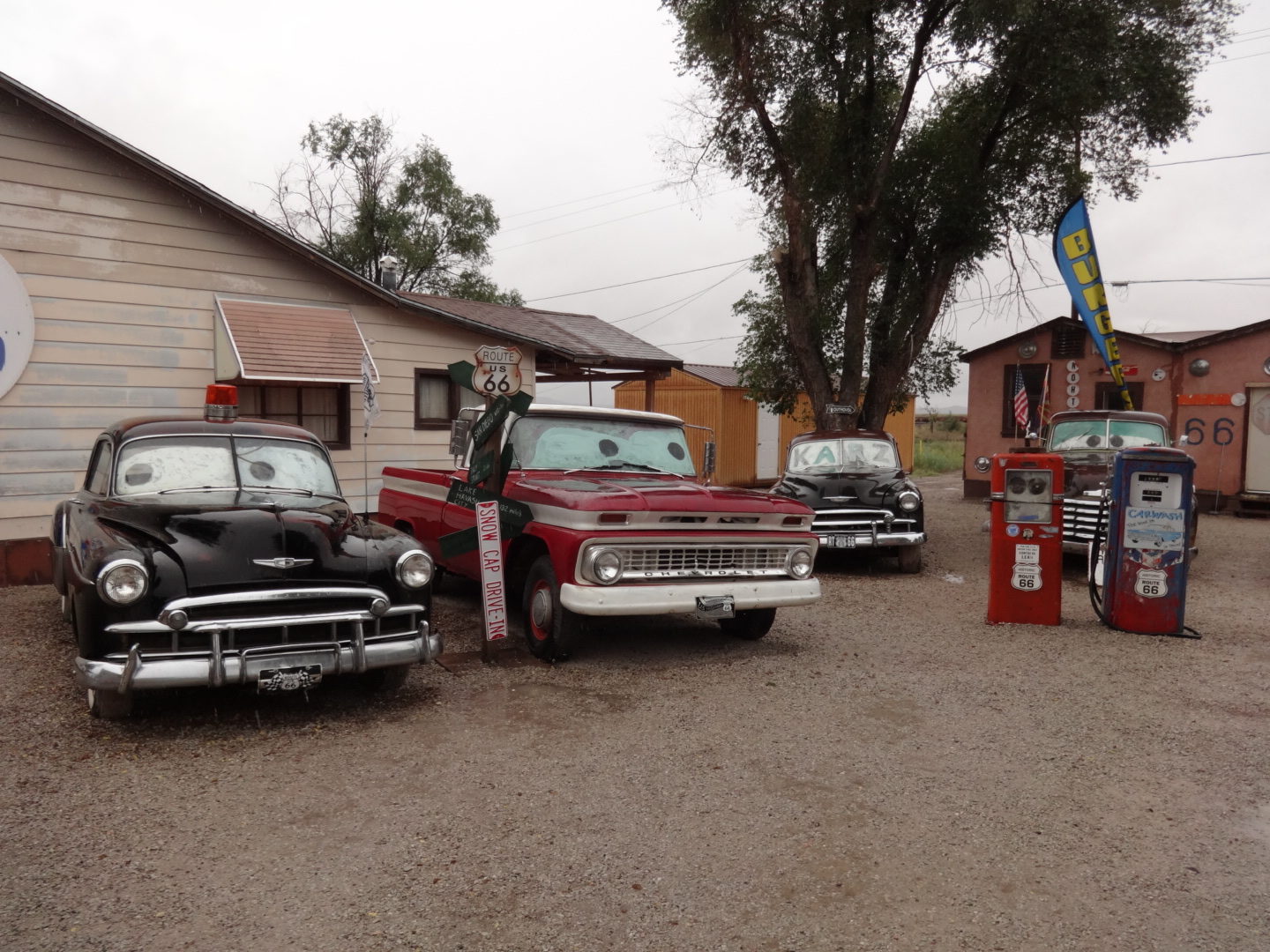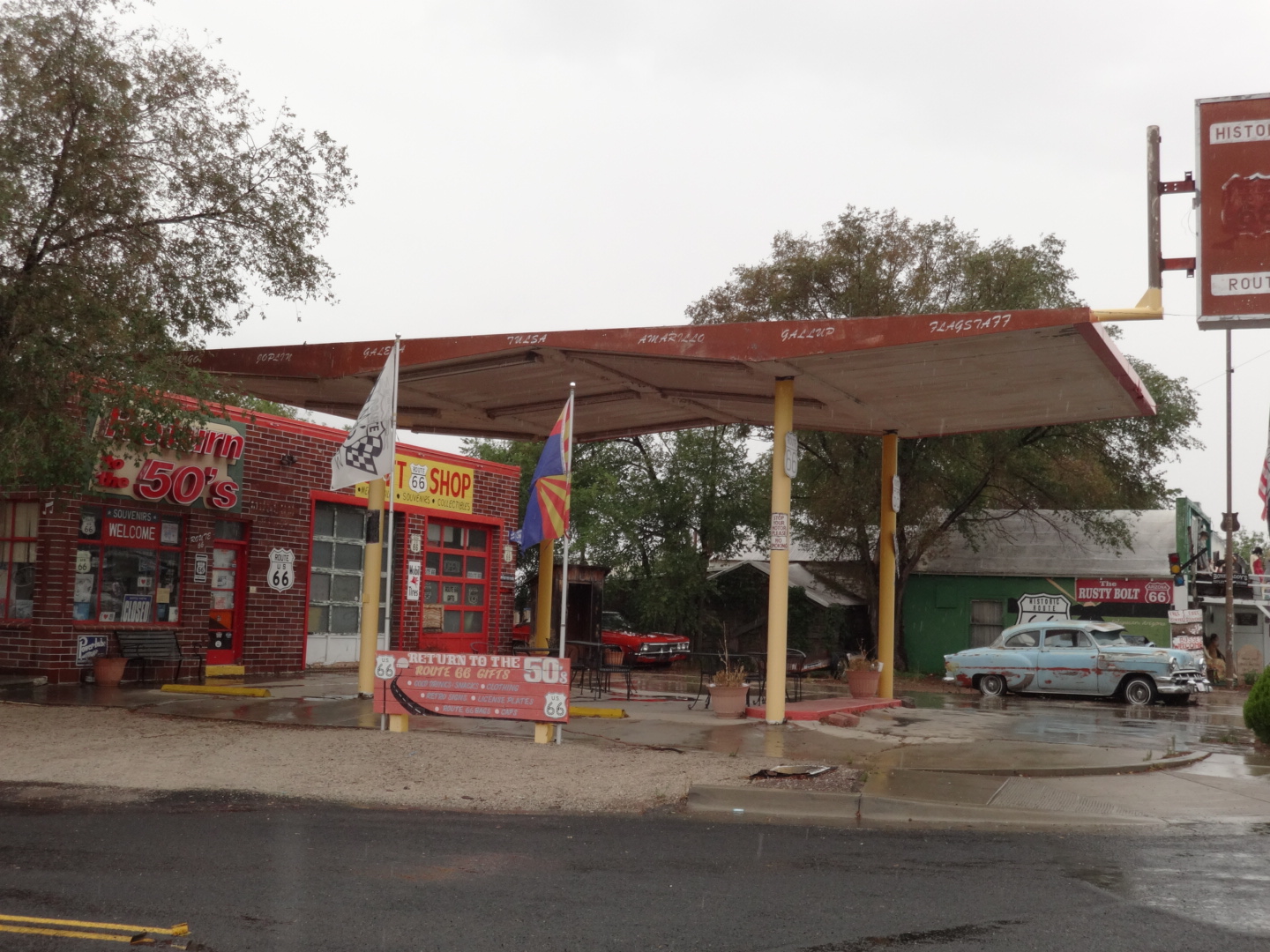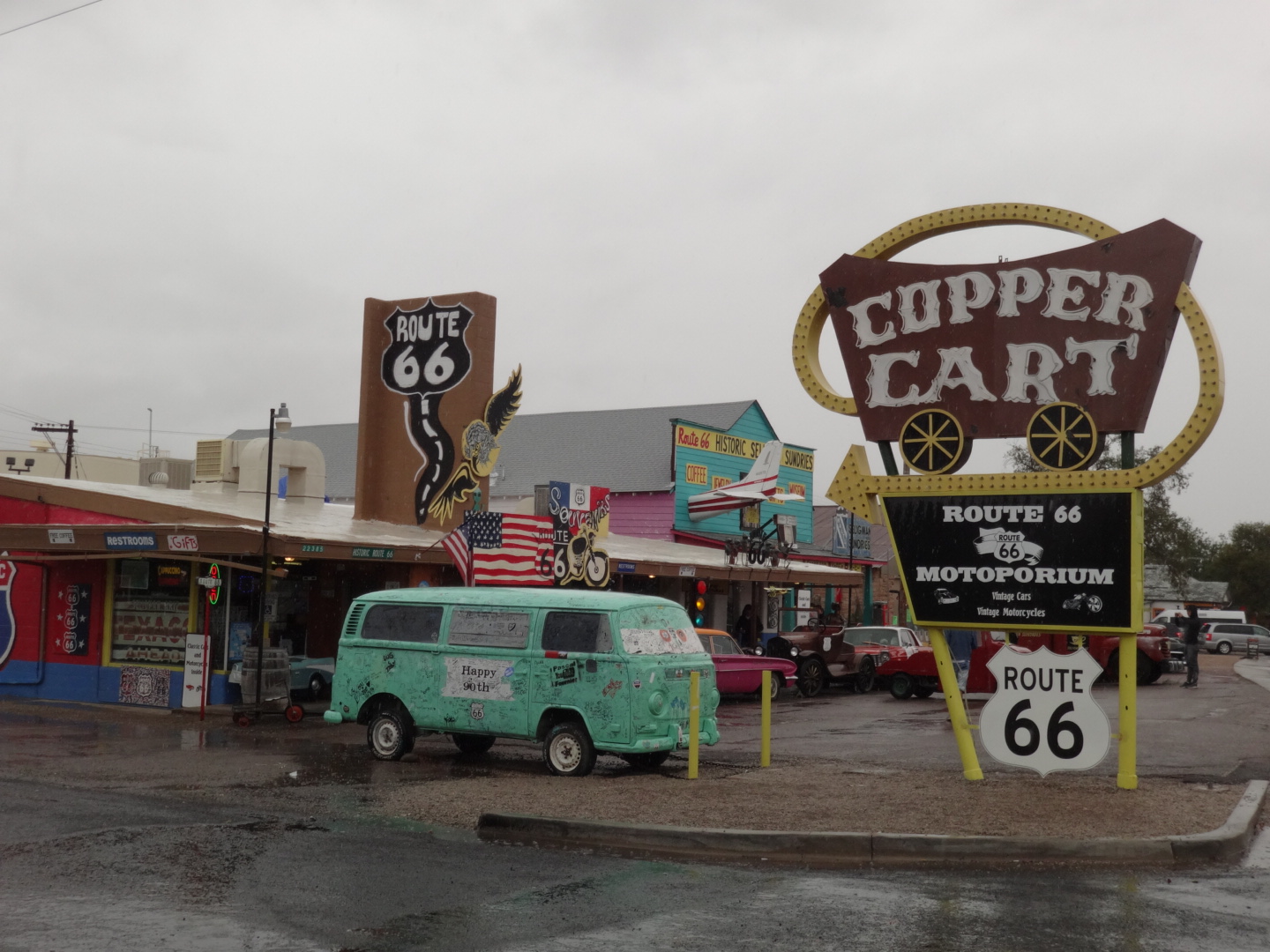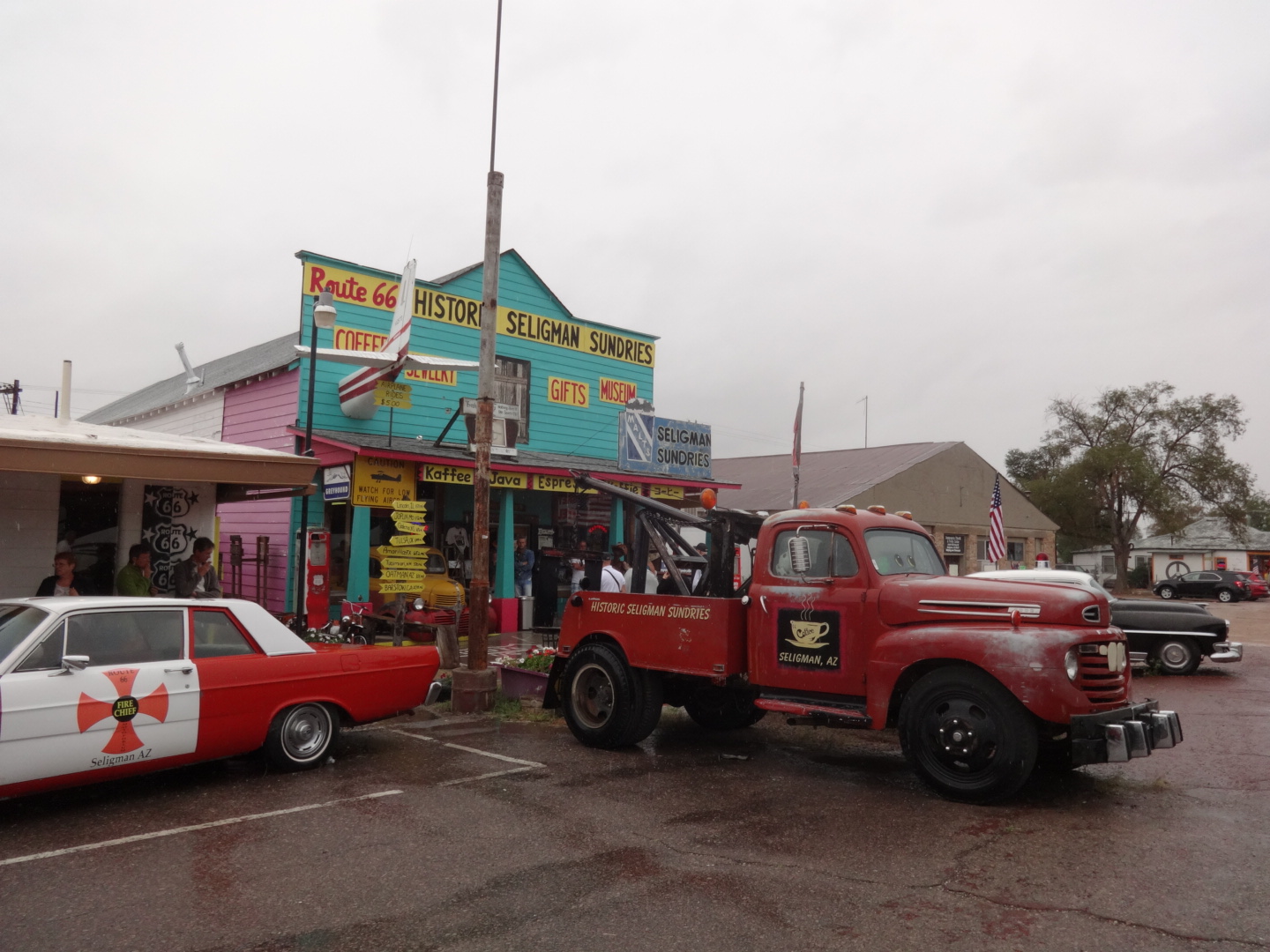 Im nächsten Örtchen Seligman treffen wir auf einige Reisebusse und ein paar auf Kitsch und alt gemachte Läden und Restaurants. Trotz Regen ganz spaßig anzusehen. Ein wenig wie ein großes Freilichtmuseum.