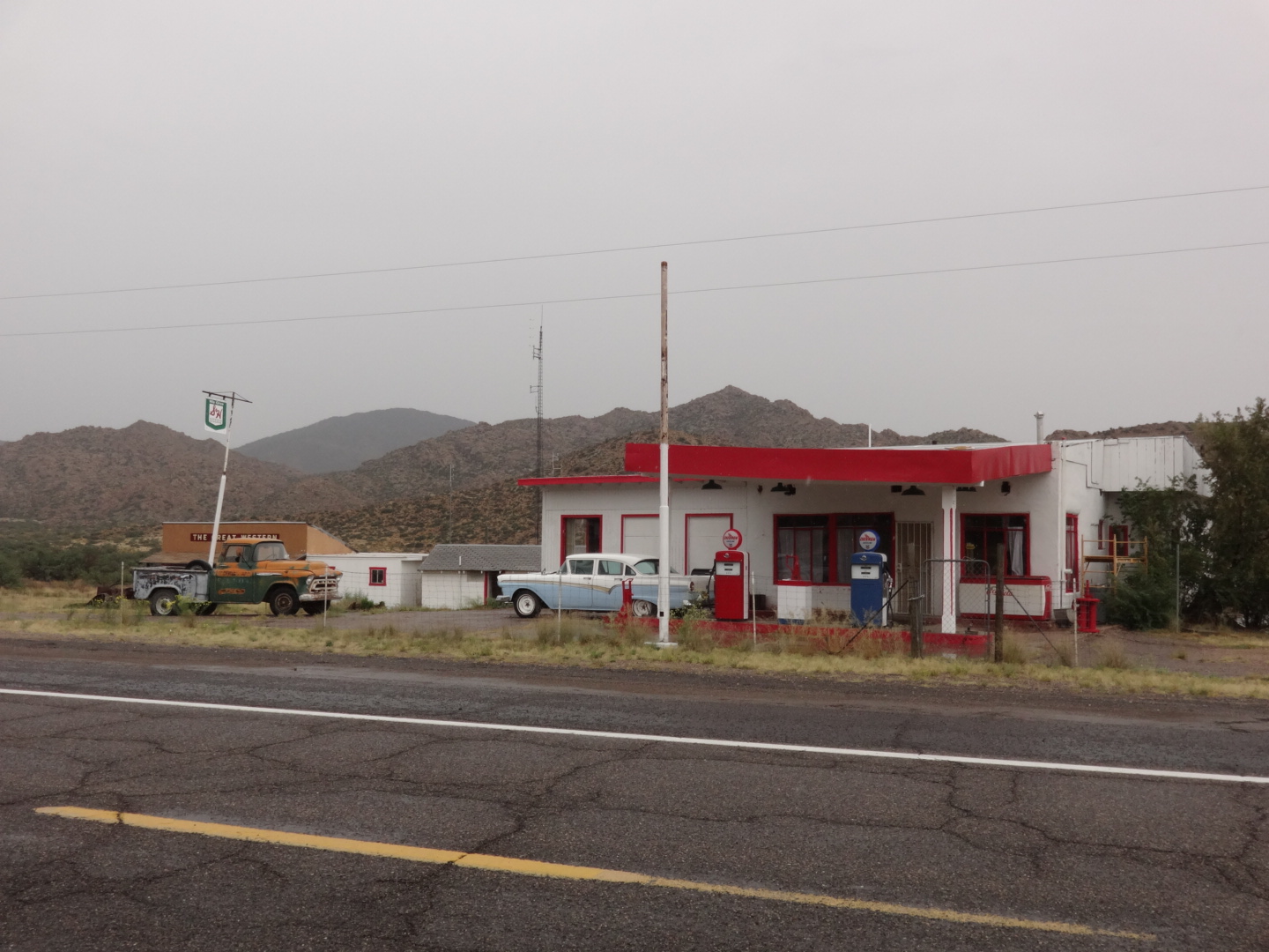 Die Straße führt weiter durch die Landschaft, eher monoton. Bei Hackberry gibt’s wieder eine alte Tankstelle mit Grocery Store. Da sind sogar die Toiletten noch in passendem Ambiente.