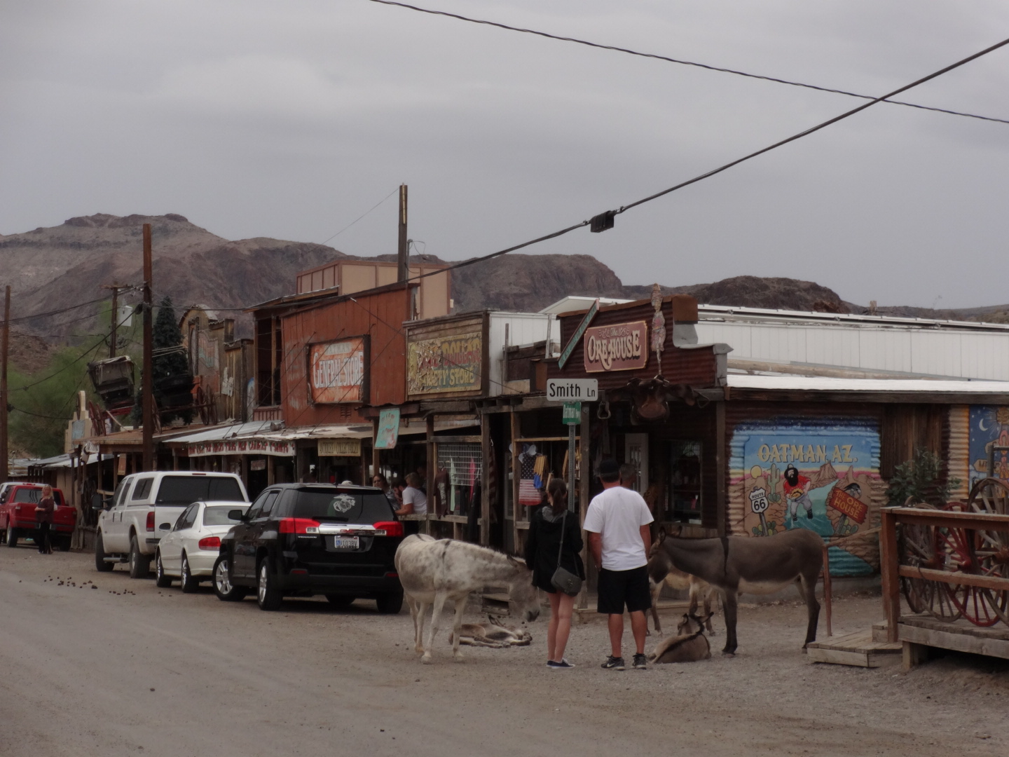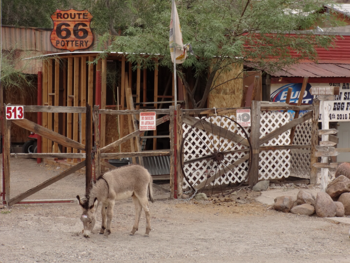 Nach Kingman führt die Route 66 eine kleine Passstraße hinauf. Mit tollen Ausblicken auf die umliegende Landschaft. Nächster Stopp: Oatman. Ein ehemaliger Goldgräber Ort. (Wobei die Miene jetzt auch wieder aktiv sein dürfte.) Der Ort lebt als eine Art “Ghost Town” und lockt damit Touristen an. Alte, traditionelle Häuser bieten alles an, was Touristen gerne mögen. Das Highlight für viele: freilaufende Esel. Mitten im Ort. Mit ihren Jungen. Absolutes beliebtes Streichelobjekt und Fotomotiv.