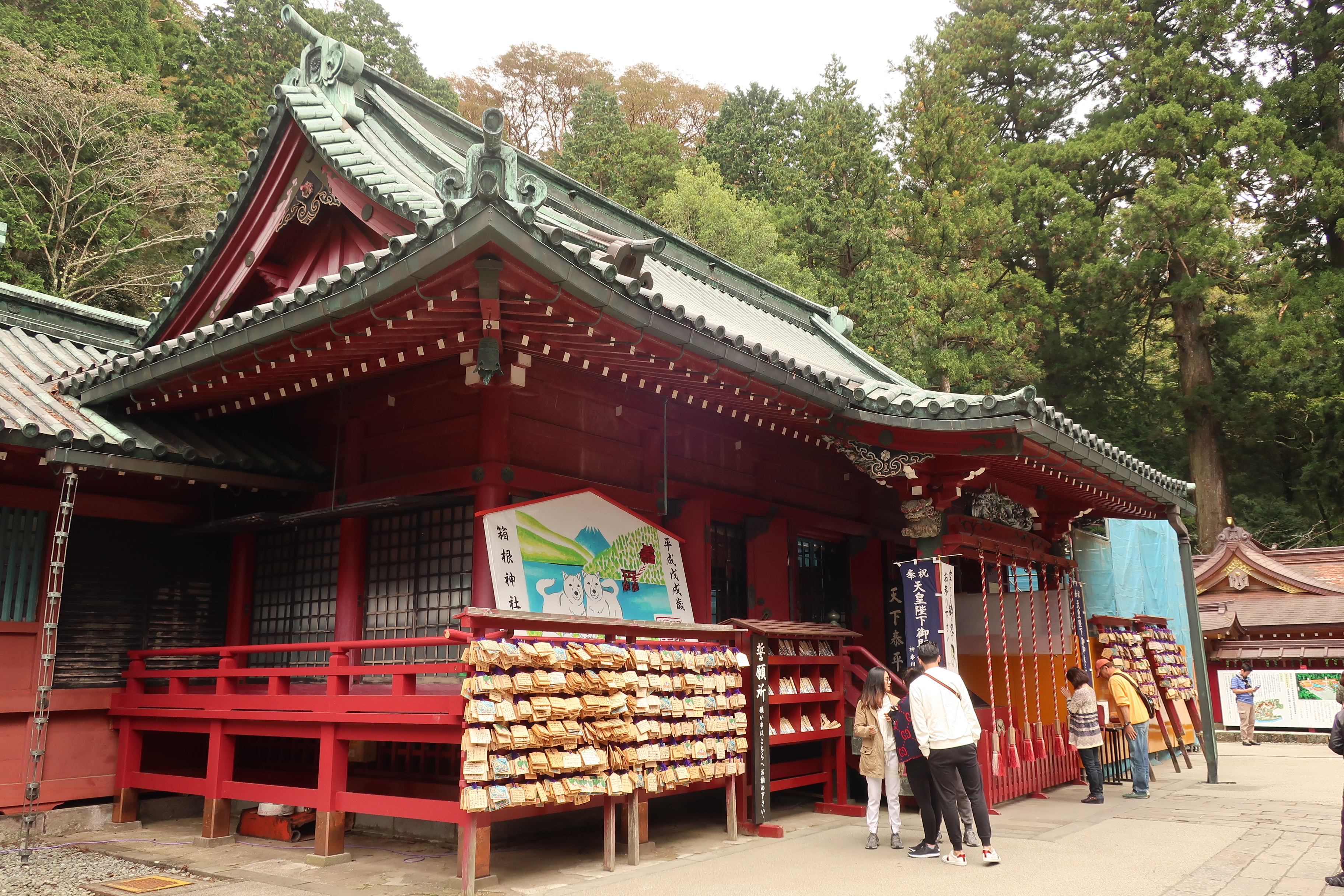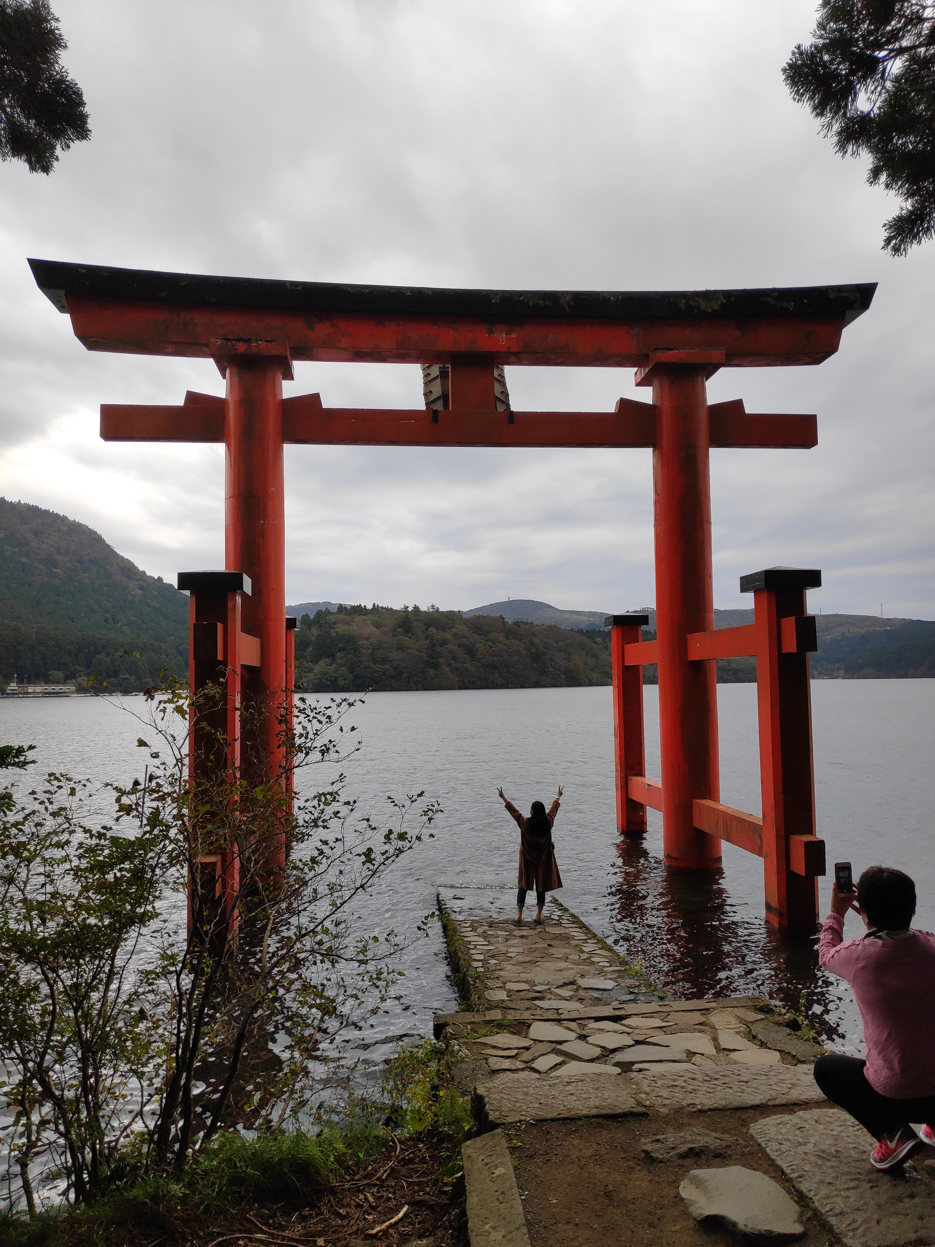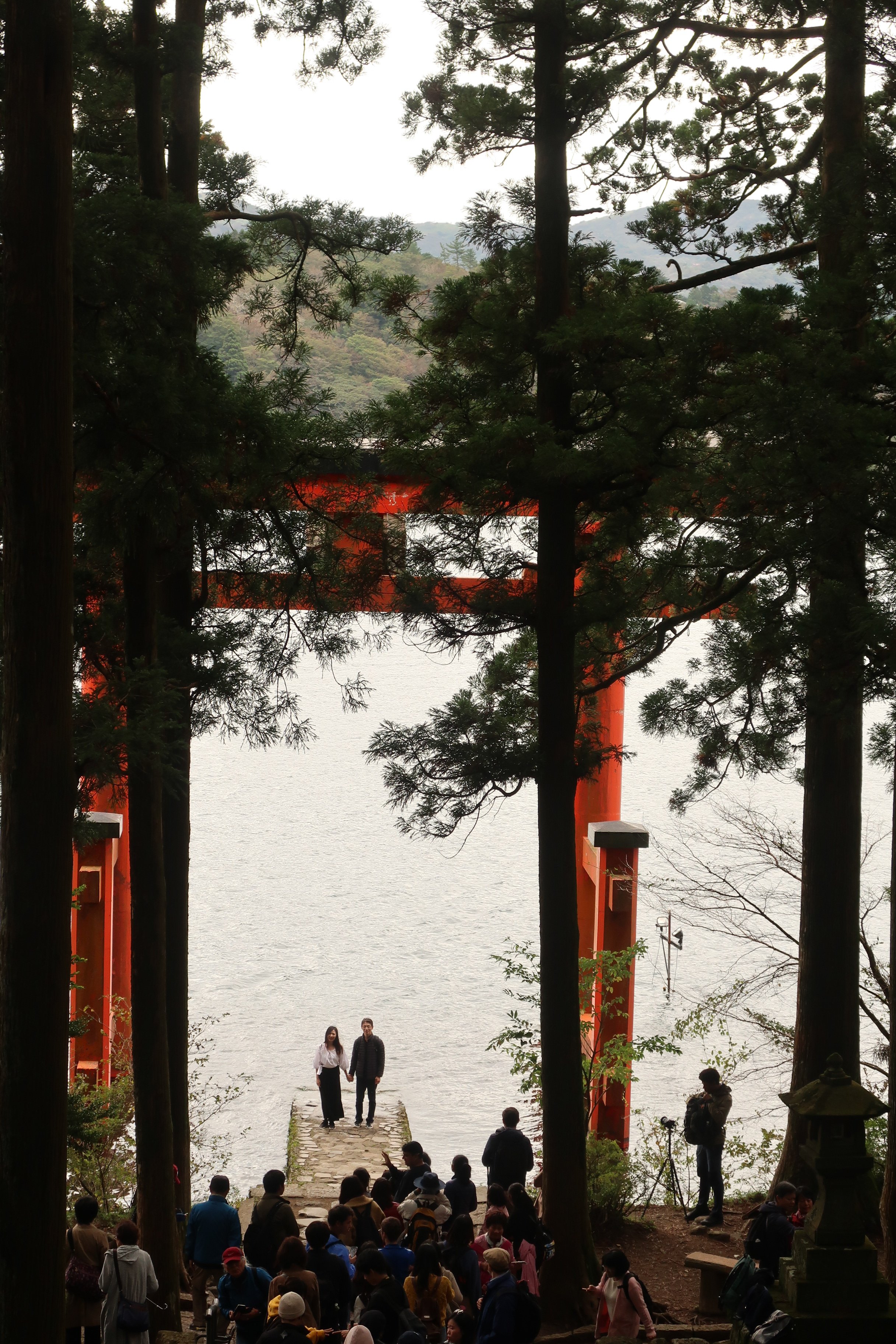 Nachmittags fahren wir zum Ashino-ko See am Fusse des Mt. Hakone. Der Hakone Schrein ist über eine lange Treppe und durch mehrere rote Tori zu erreichen. Das unterste Tori ist als Fotomotiv beliebt, da es im Wasser steht. Hier stehen Touristen auch mal 15 Minuten Schlange, bis sie ihr Selfie knipsen können.