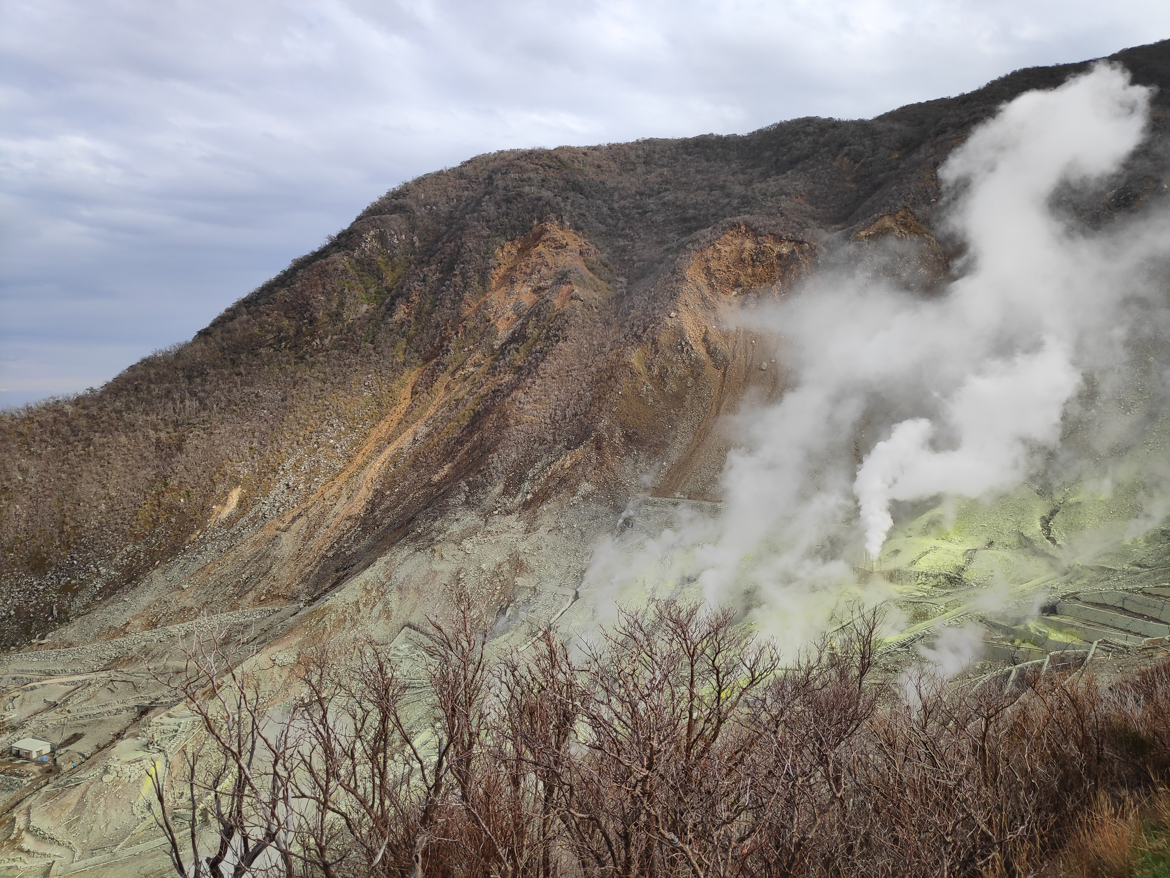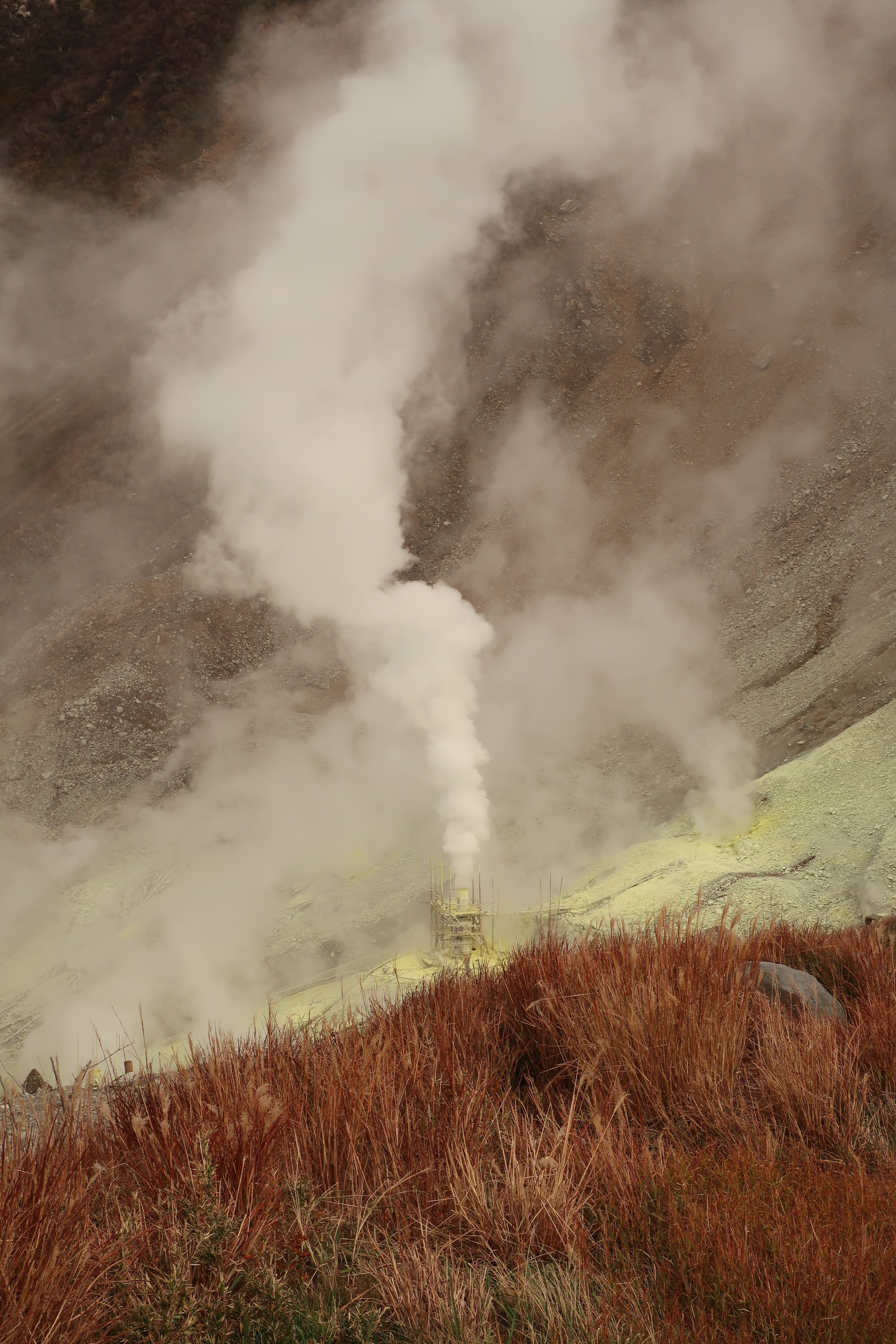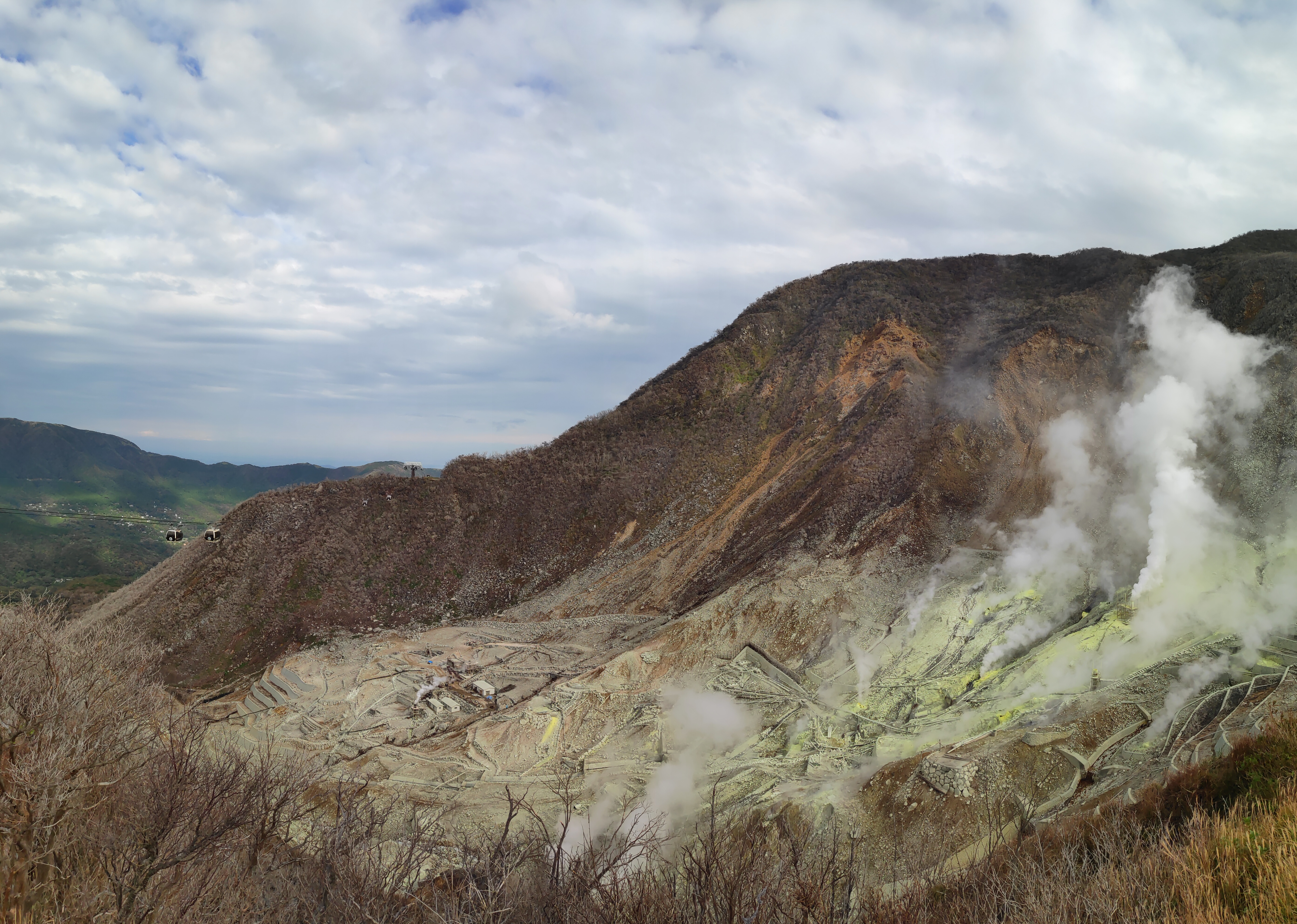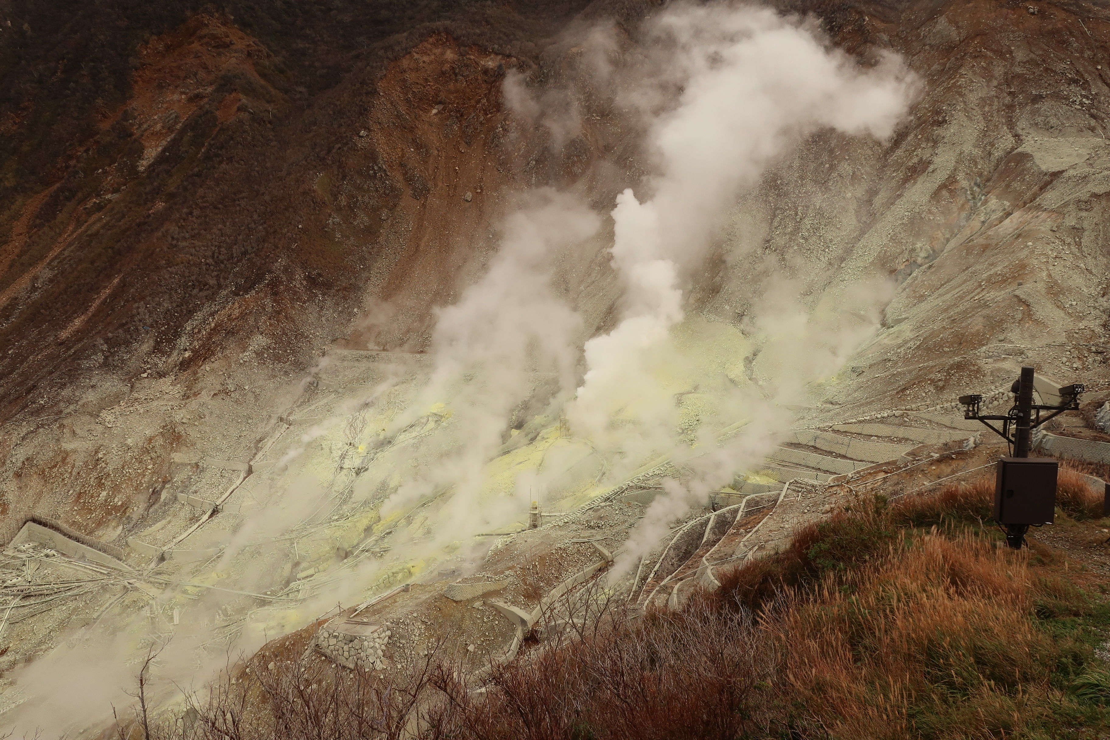 Zum Abschluss fahren wir nach Owakudani. Die Bergstation der Seilbahn ist auch gut mit dem Auto zu erreichen. Hier wird Schwefel abgebaut. Schon von weitem ist der Geruch eindeutig. Überall steigt Rauch auf und der Berg ist gelb von austretendem Schwefel an den Abbaustellen.