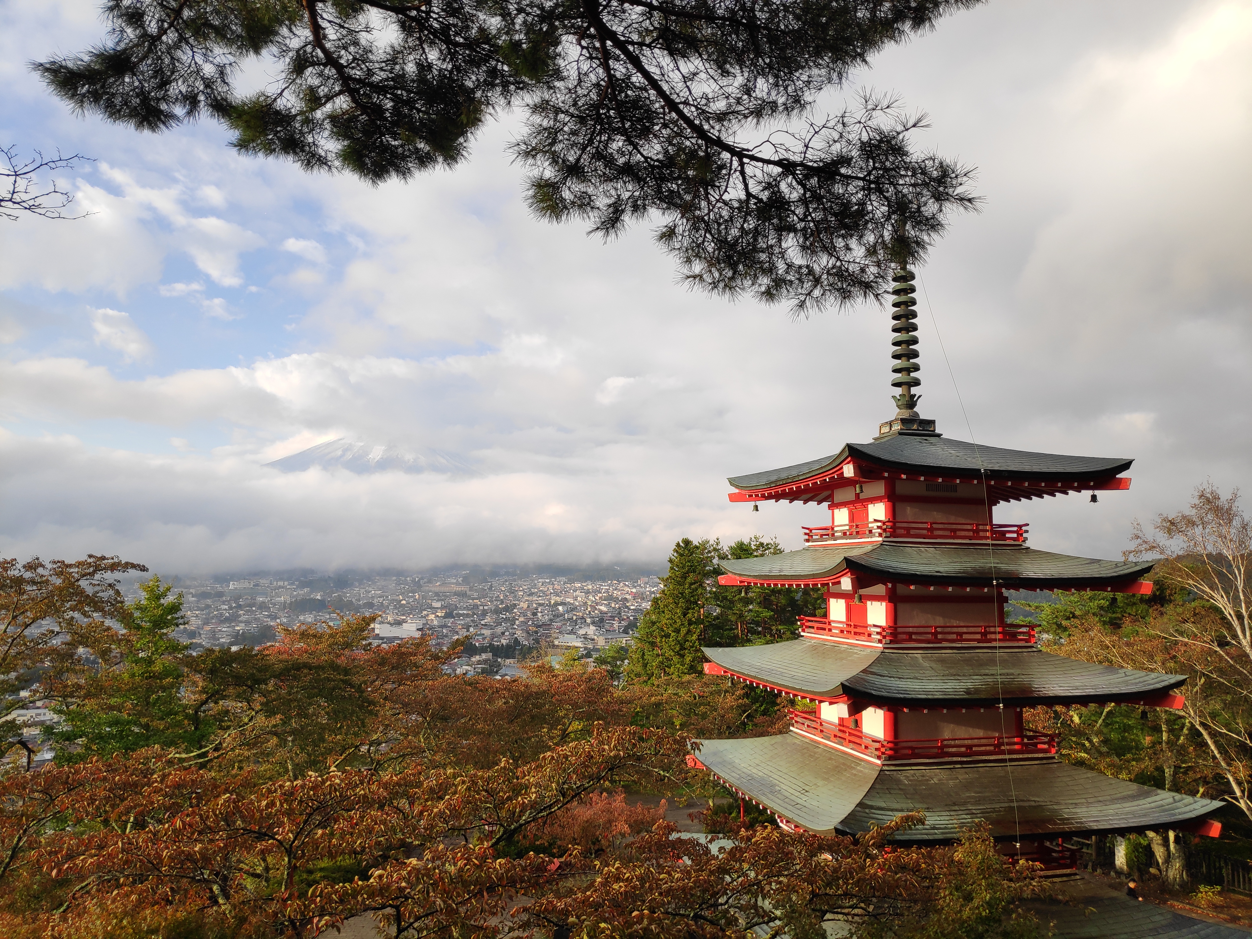 Sechs Uhr morgens. Wir stehen an der Chureito Pagode. Dem Fotospot am Fuji. Nach 400 Stufen ist auch das Sportprogramm für heute geschafft. Und dann stehen wir da. Die Pagode schön von der Sonne angestrahlt. Aber der Fuji tief hinter den Wolken versteckt. Ab und zu schaut die Flanke hervor.
