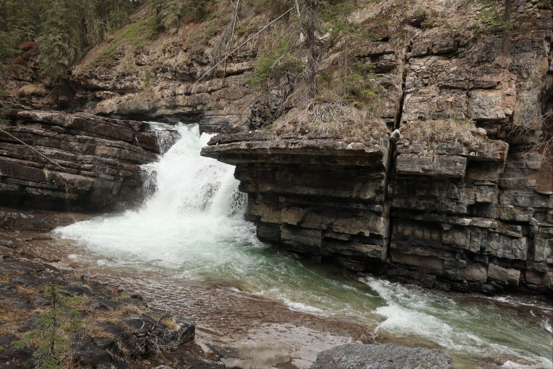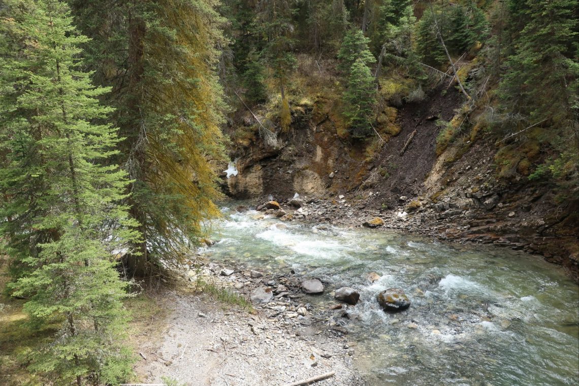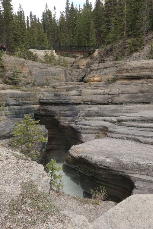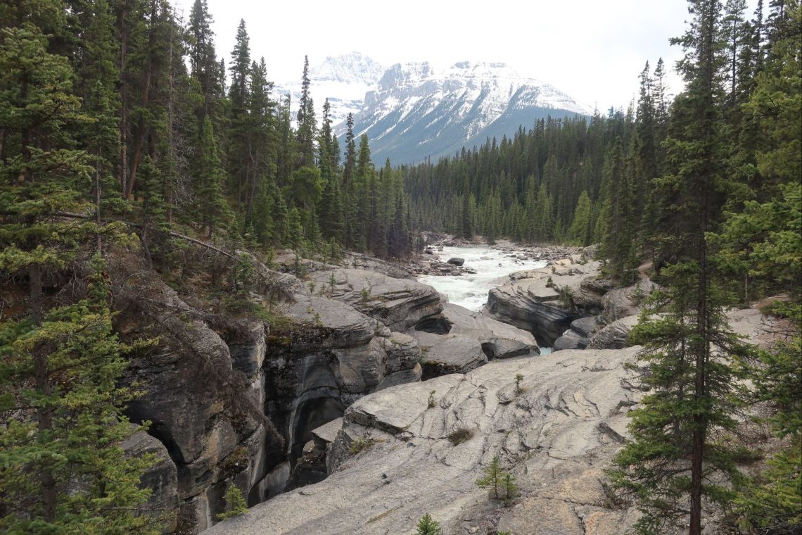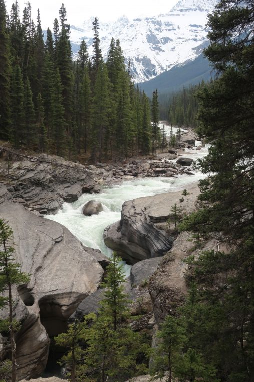 Wir fahren bis zum Mistaya Canyon. Ein kurzer Fußweg führt hinab zum Fluss. Das Wasser hat sich seinen Weg durch das Gestein geschaffen und dabei interessante Formen hinterlassen. Im Hintergrund die schneebedeckten Bergegipfel.