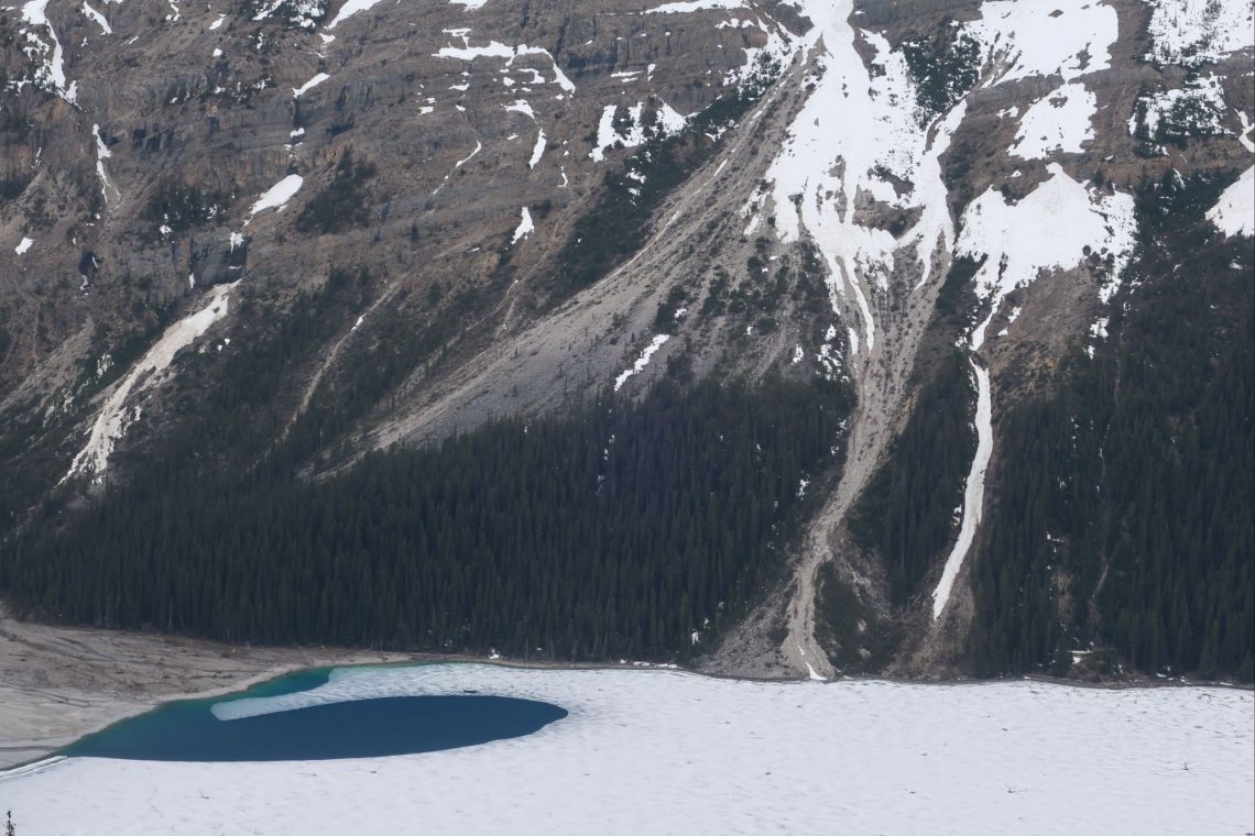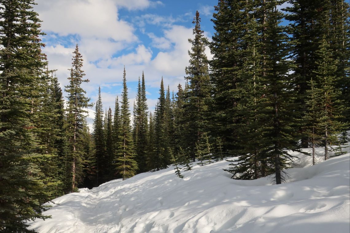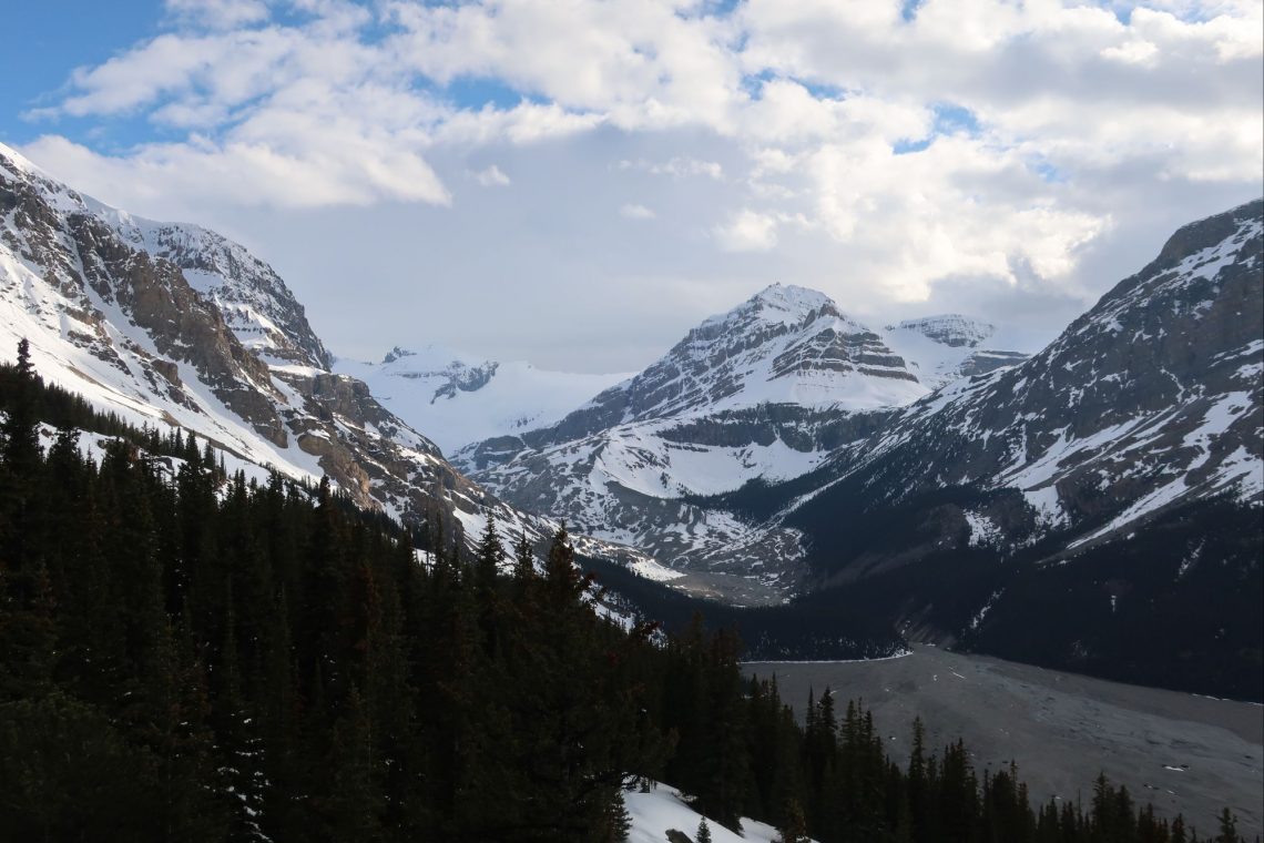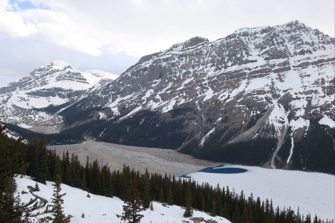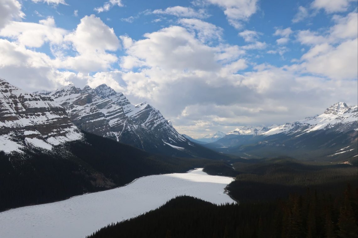 Es klart weiter auf. Über einen kurzen, schneebedeckten Weg erreichen wir die Aussichtsplattform des Peyto Lakes (10-15 Minuten Fußweg). Die Vielfalt der Schuhe unterwegs ist spannend: von Crocs über Sketchers bis hin zu den Moonboots ist alles zu sehen. Je nach Wahl kann dies ziemlich rutschig werden und den kurzen Weg sehr beschwerlich. Die Aussicht lohnt sich. Der See ist noch weitestgehend zugefroren, die Berggipfel haben frischen Schnee und die Sonnenstrahlen bringen Farbe in das sonst triste winterliche grau.