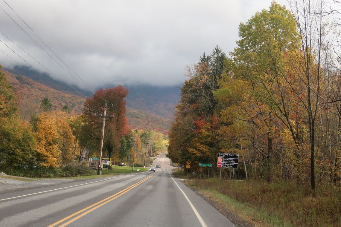 Weiter oben am Berg sind wir dann im Skigebiet angekommen. Es gibt einige Lifte und Gondeln – eine Gondel fährt direkt aus der Hotelanlage heraus los. Es regnet, entsprechend ist wenig los. Auch die bekannte Passstraße Smugglers Notch ist dank des Regens wenig befahren. An Aussteigen ist bei dem strömenden Regen nicht zu denken. Bezeichnend ist die Einfahrt über eine Art Schikane, um gleich hier große Autos und vor allem Wohnanhänger auszusortieren. Wer nicht durch die Schikane passt, wird gebeten zu wenden.
