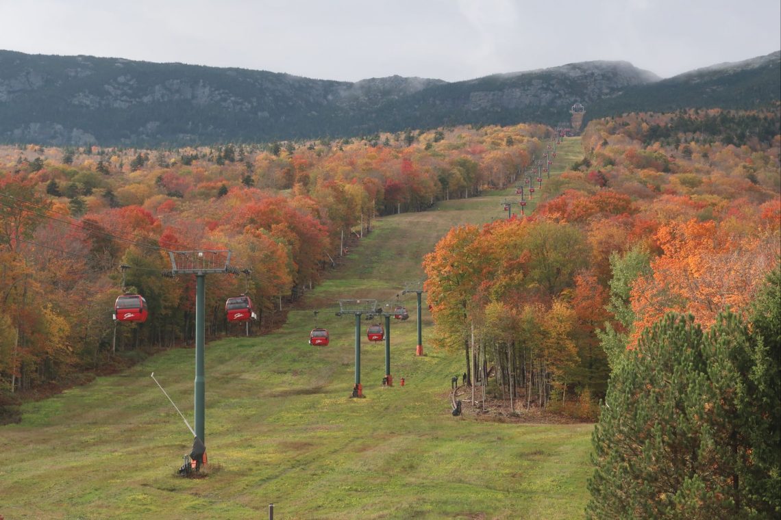 Auf der anderen Seite der kleinen Passstraße ist die Gondel Station in Stowe. Auch hier ist mittlerweile Hochbetrieb. Das Wetter hat aufgeklart, ab und zu kommt die Sonne durch. Rundherum dichter Laubwald.