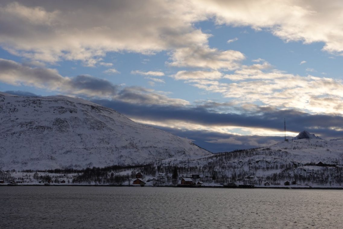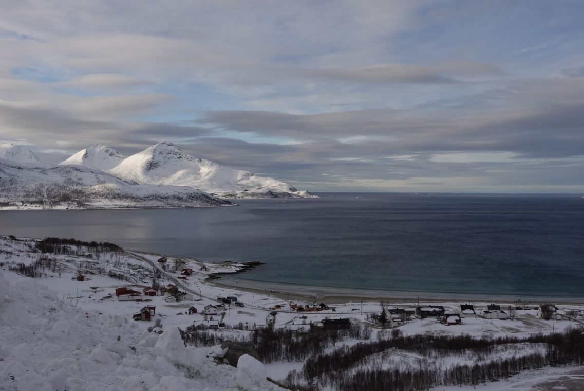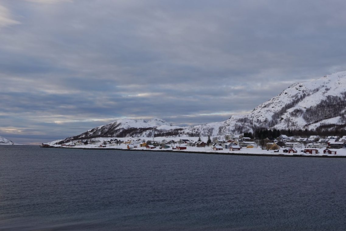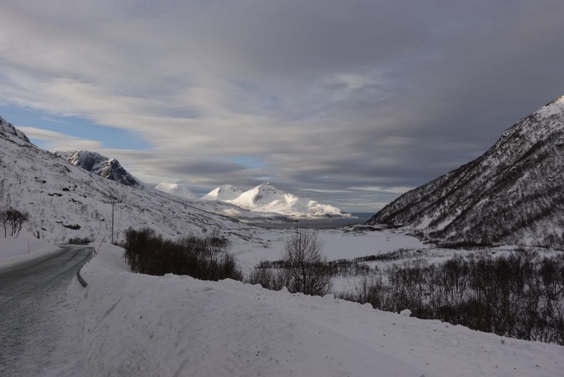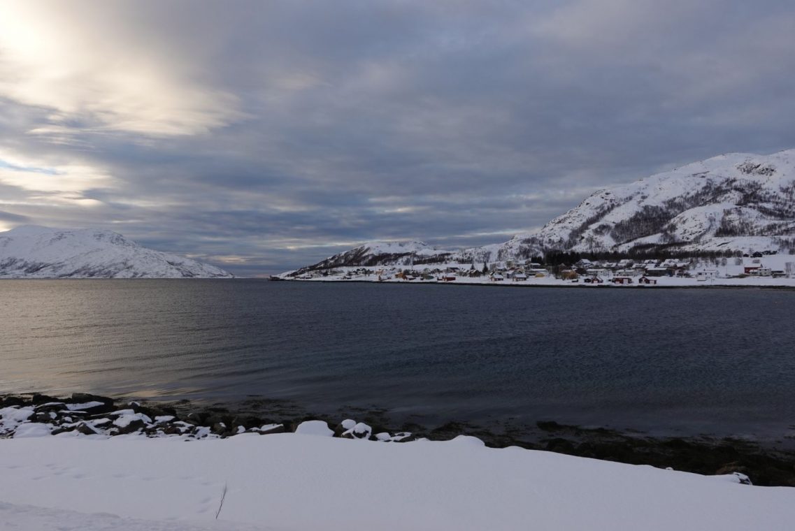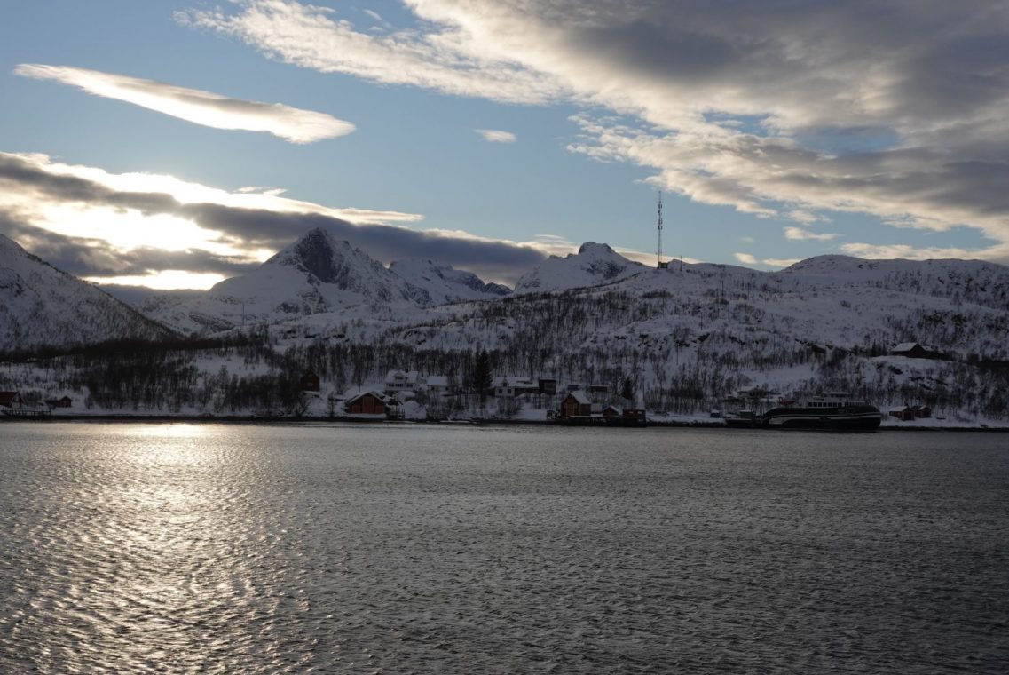 Weiter geht’s nach Skulsfjord. Vor dem Tunnel gibt es einen schönen Aussichtspunkt von dem man über die ganze Bucht und die umliegenden Berge sieht. Allerdings weht heute ein starker Wind, so dass wir die Aussicht nur sehr kurz genießen.
