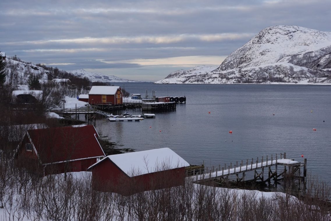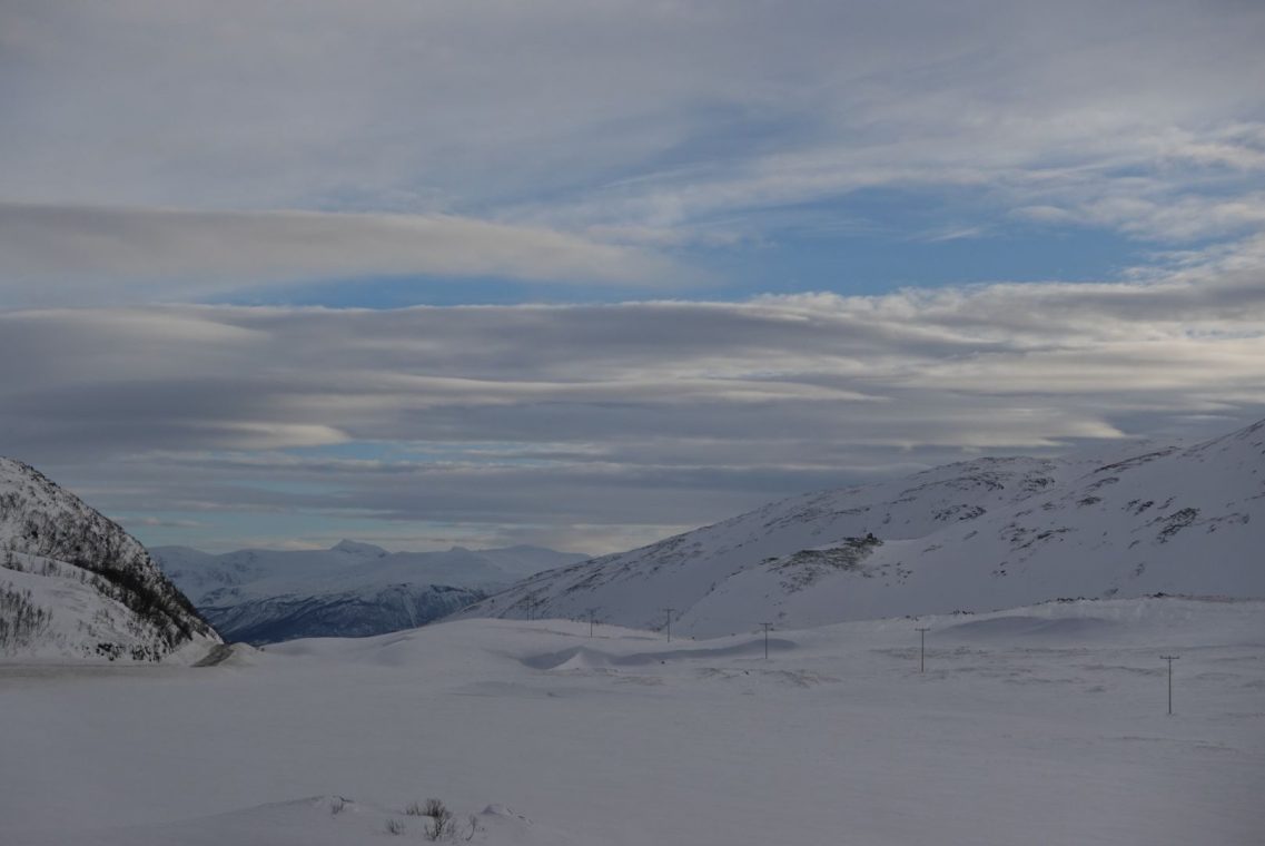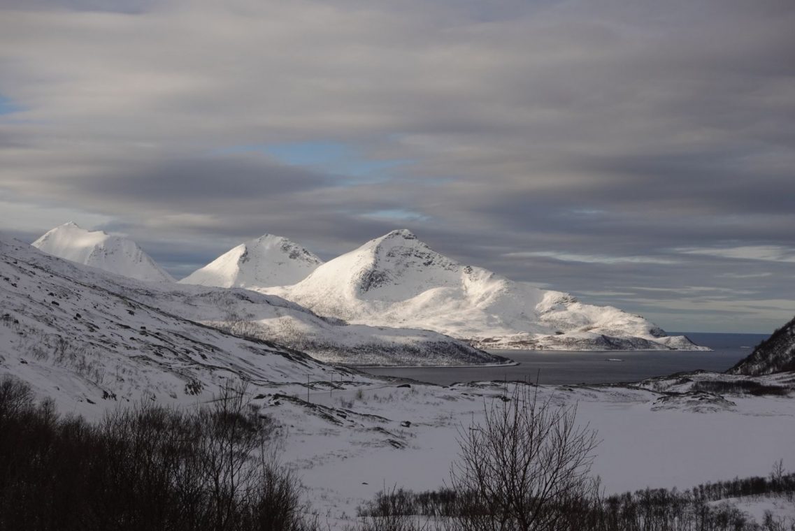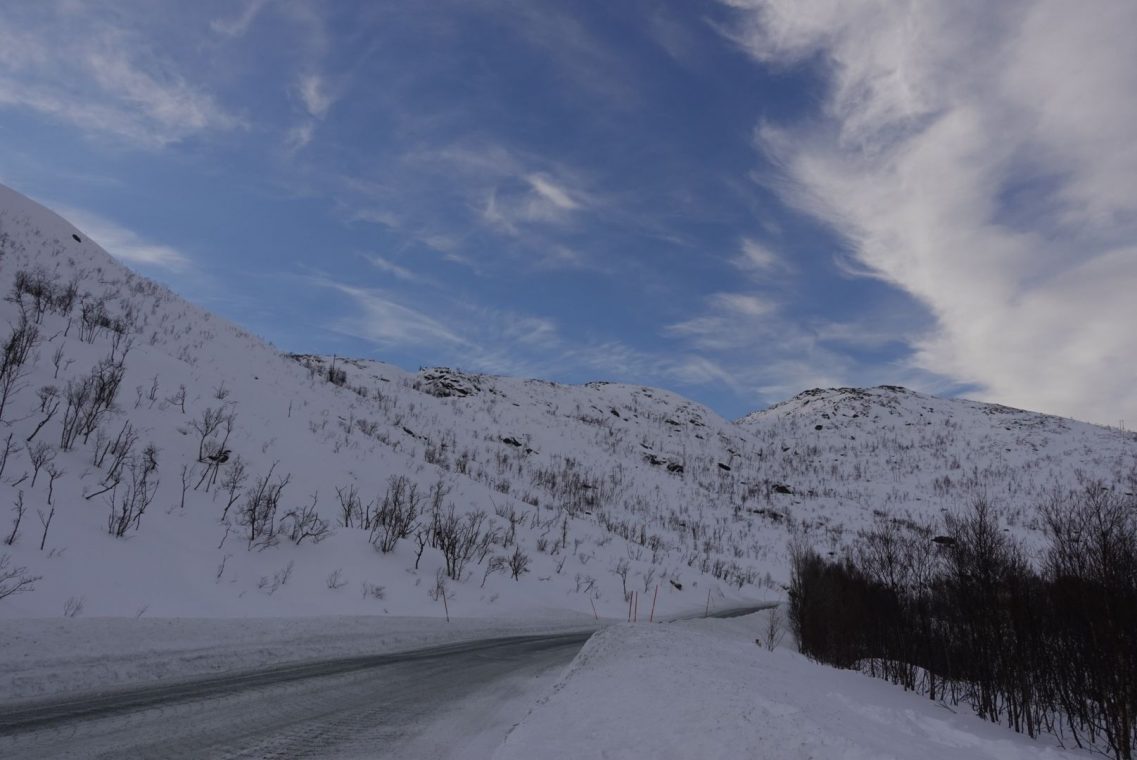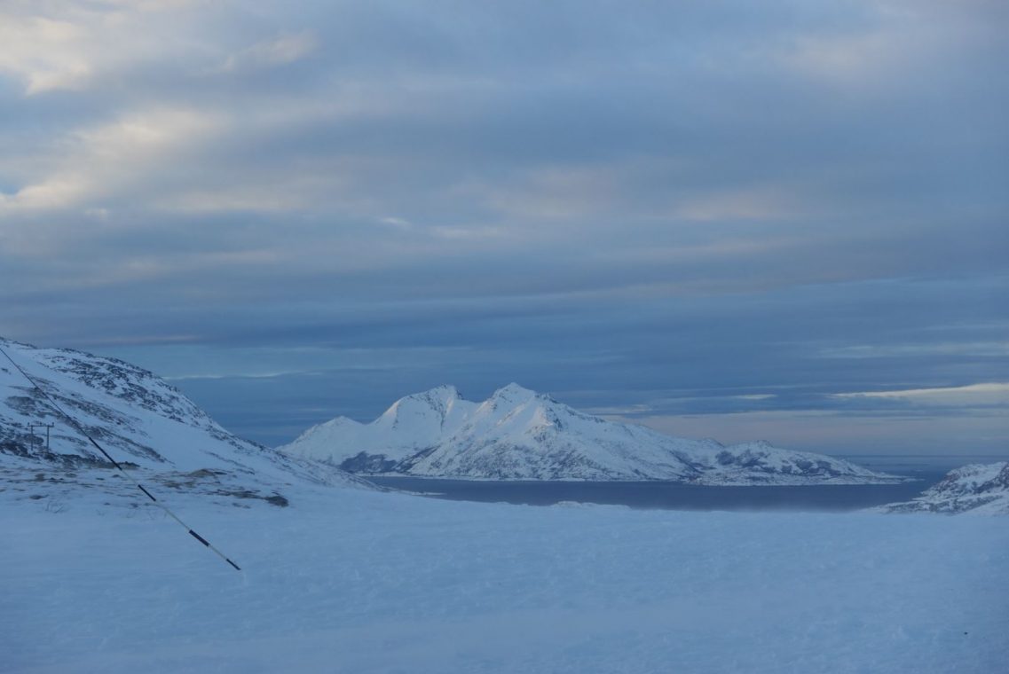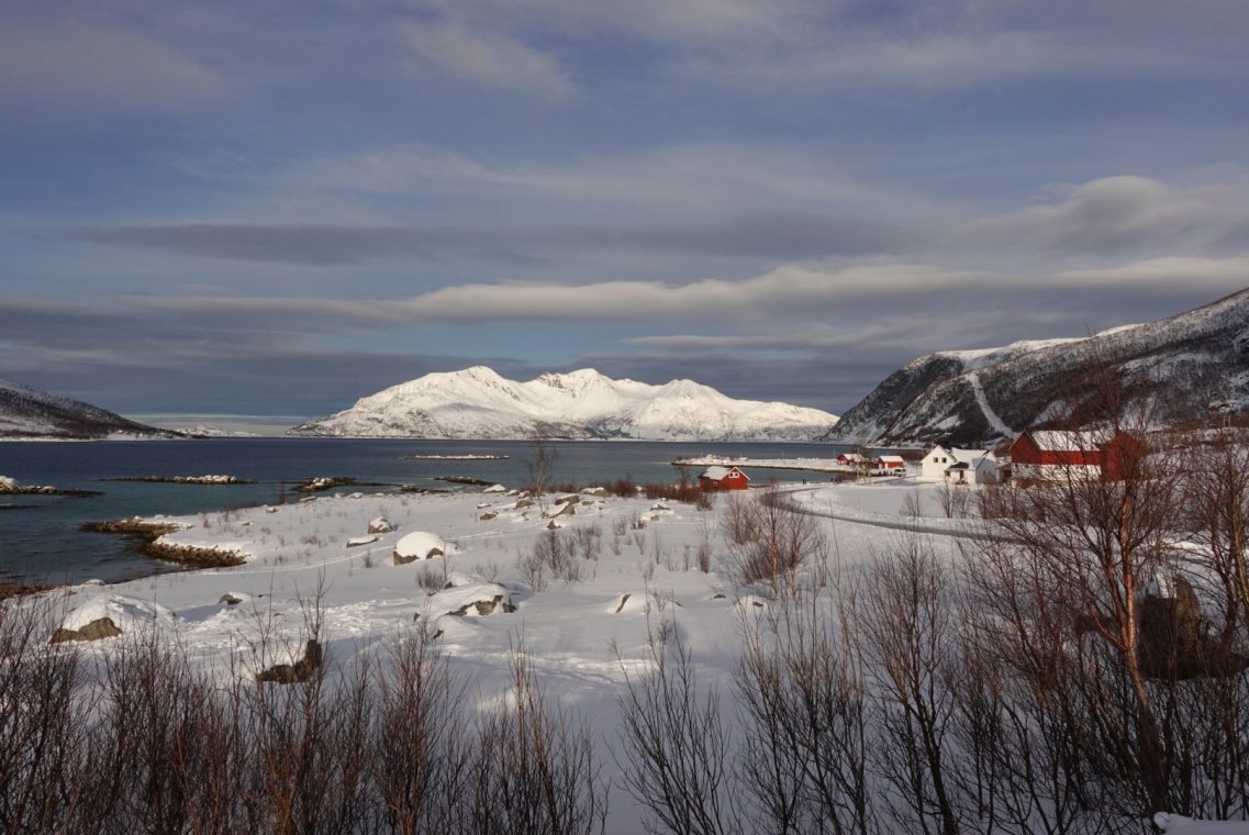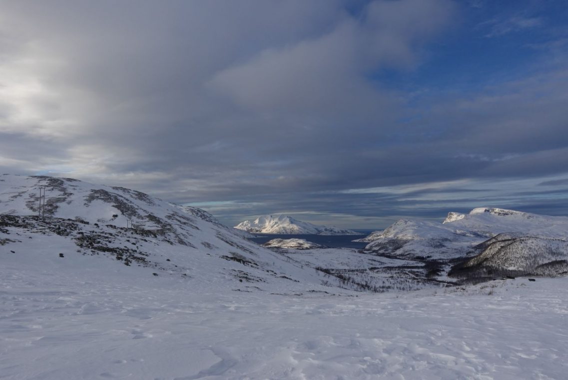 Weiter geht’s nach Skulsfjord. Vor dem Tunnel gibt es einen schönen Aussichtspunkt von dem man über die ganze Bucht und die umliegenden Berge sieht. Allerdings weht heute ein starker Wind, so dass wir die Aussicht nur sehr kurz genießen.