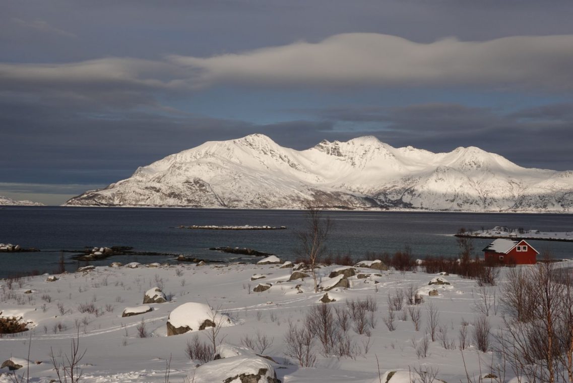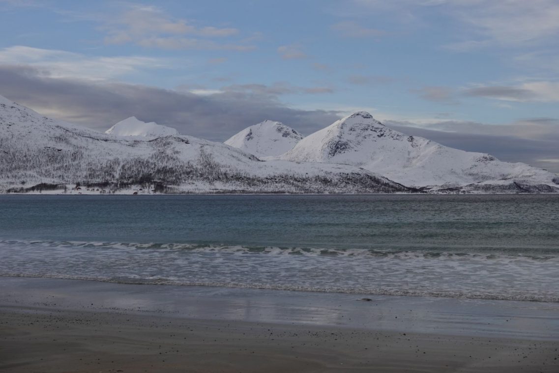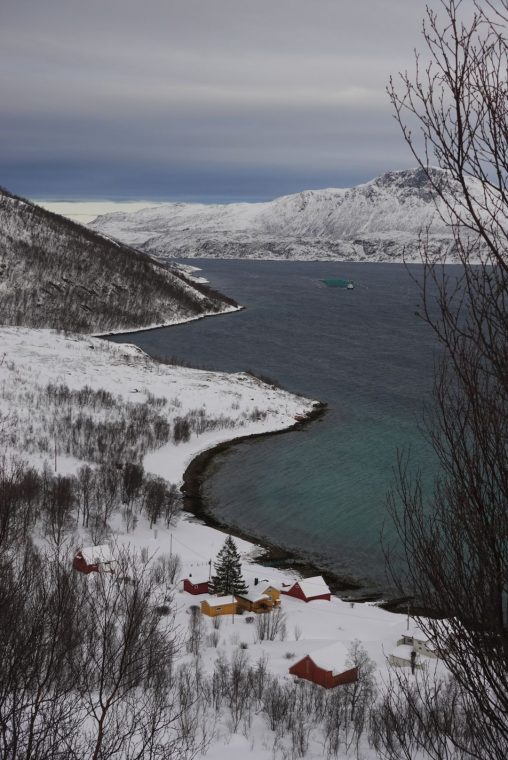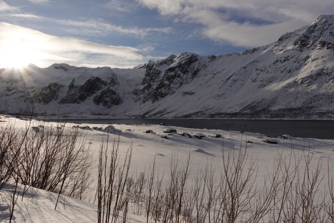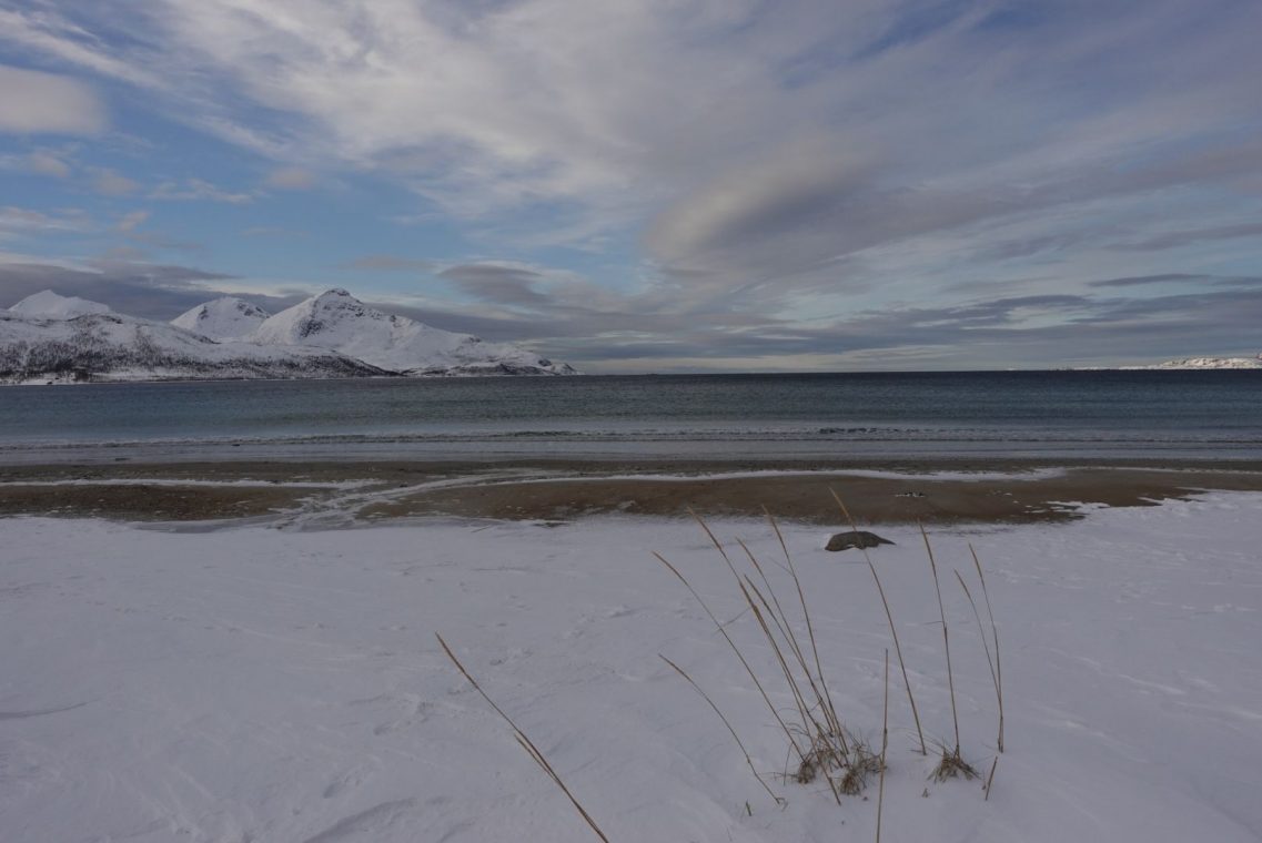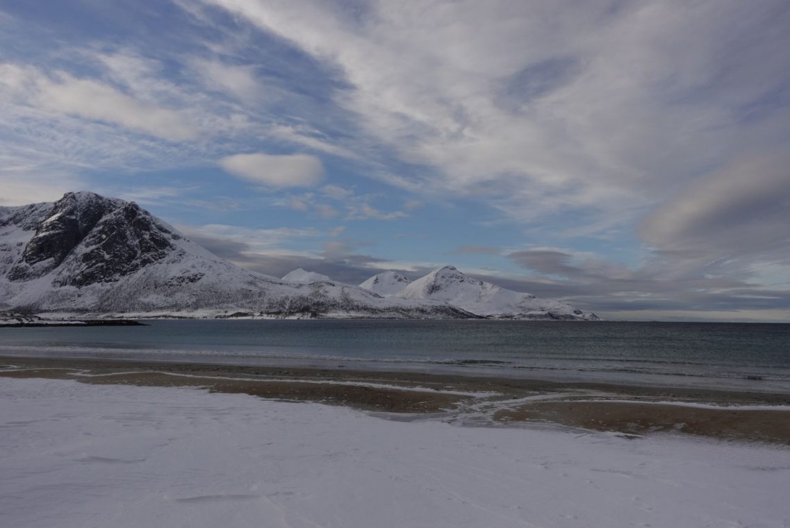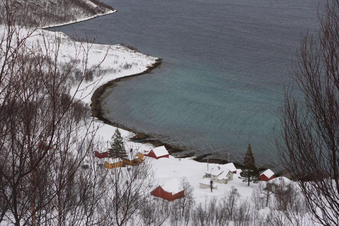 Weiter geht’s nach Skulsfjord. Vor dem Tunnel gibt es einen schönen Aussichtspunkt von dem man über die ganze Bucht und die umliegenden Berge sieht. Allerdings weht heute ein starker Wind, so dass wir die Aussicht nur sehr kurz genießen.