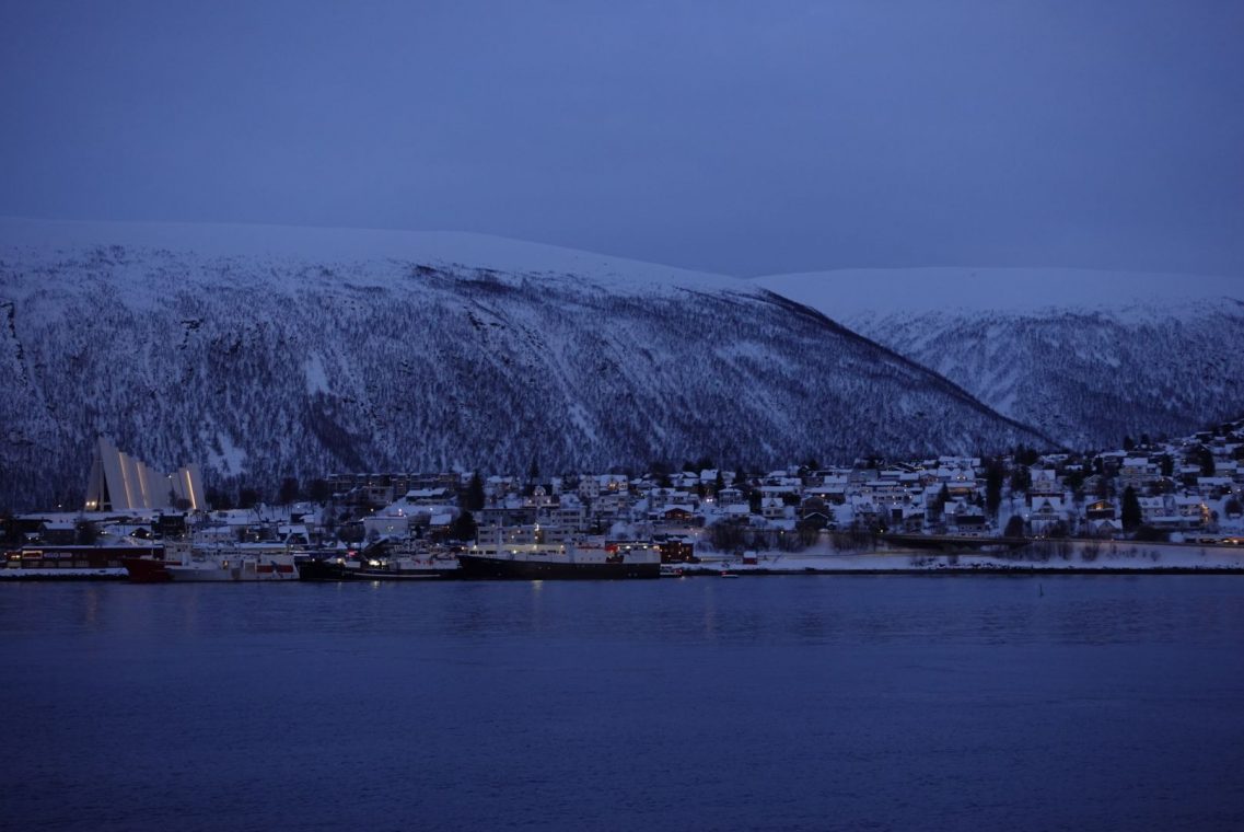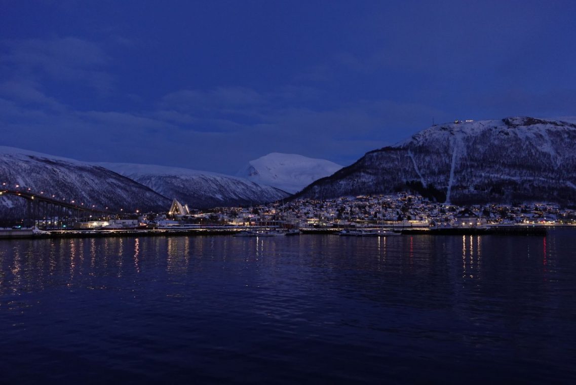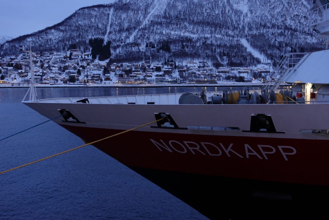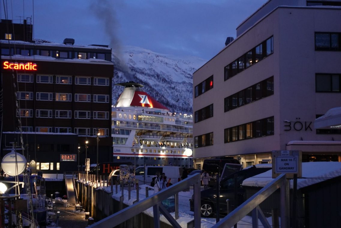 Abends fahren wir noch nach Tromsø. Heute liegt dort die Nordkap Hurtigrute. Wir bummeln noch etwas durch den Ort. Am Hafen entlang im Sonnenuntergang ist es ganz schön.