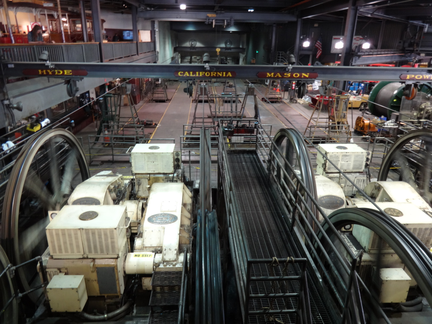 Auch in NobHill fährt eine CableCar. Das erinnert uns daran, daß wir noch in das CableCar Museum wollten. Und genau das machen wir jetzt. Ecke Mason / Washington Street befindet sich der Dreh- und Angelpunkt der Besonderheit von San Francisco. Das CableCar Museum ist eigentlich die Betriebsstätte der CableCars. Hier werden alle Seiler für die Bahnlinien angetrieben und gewartet. Und auch die Wägen werden über Nacht hier eingestellt. Schautafeln erklären das Prinzip der CableCar. Wir sind fasziniert, wie der Betrieb funktioniert.