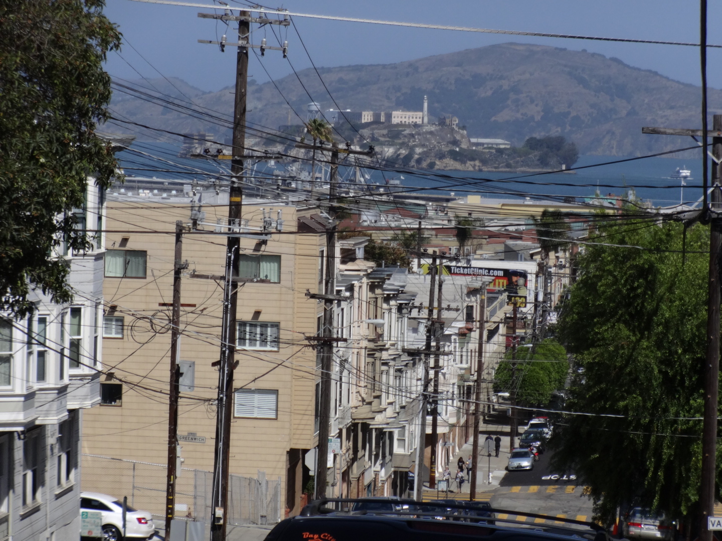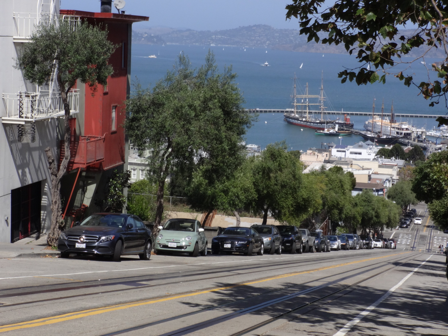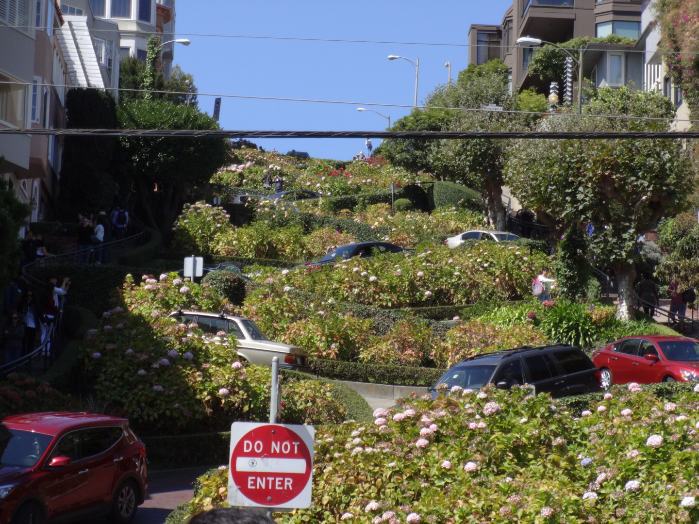 Das nächste Ziel sehen wir schon auf dem gegenüber liegenden Hügel: die Lombard Street. Eine kurvige Straße mit Büschen bewachsen, die in fast jedem Film der hier gedreht wird, vorkommt. Sehr beliebt für Verfolgungsjagden. 🙂