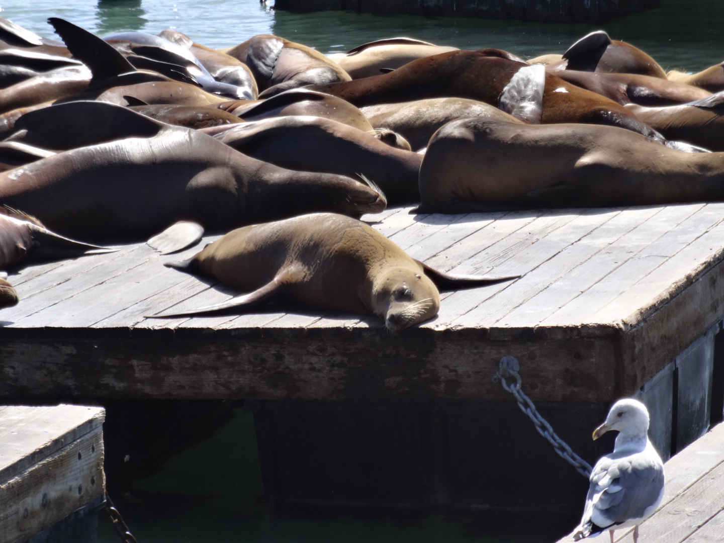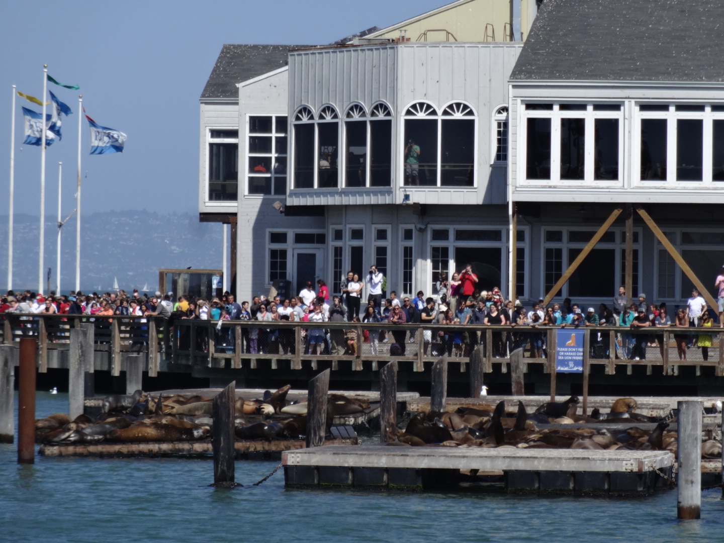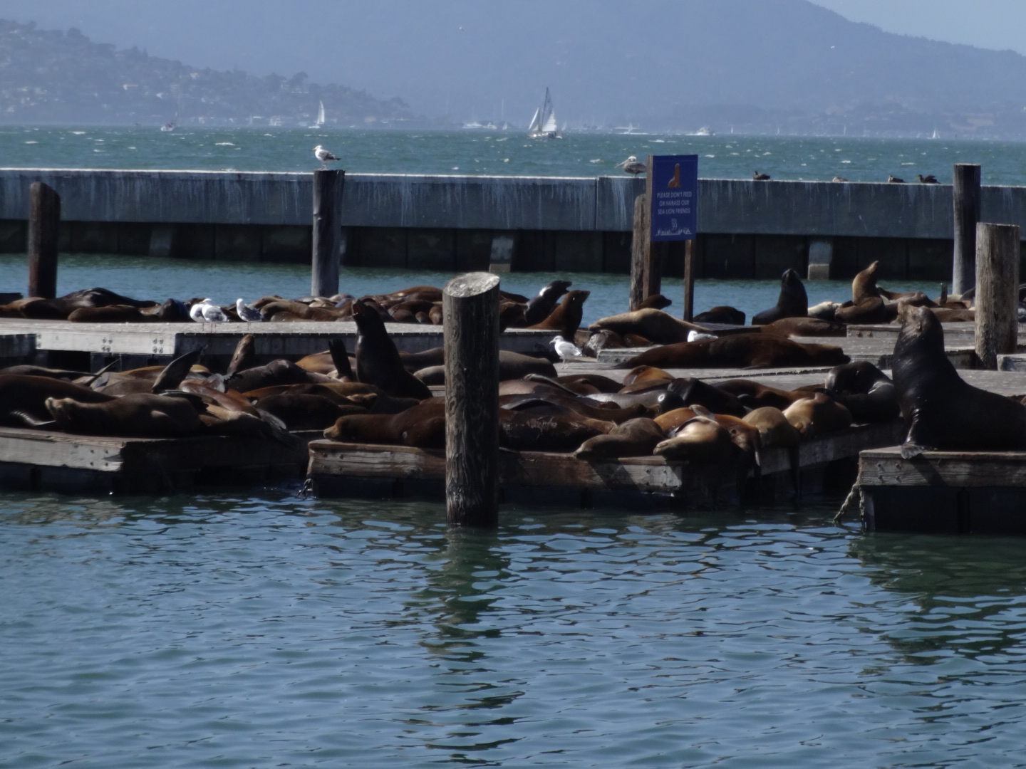 Auf das nächste Ziel habe ich schon gewartet. Pier 39 – hier lebt eine Seehund-Kolonie direkt am Ufer vor San Francisco. Unzählige Seehunde liegen auf schwimmenden Plateaus. Leider stehen noch mehr Touristen am Pier dahinter und schauen genauso fasziniert den Tieren zu.