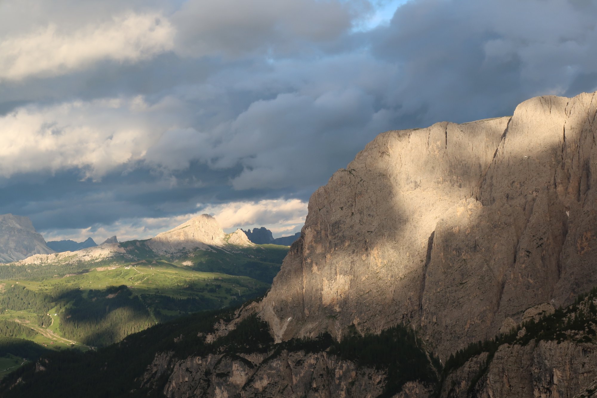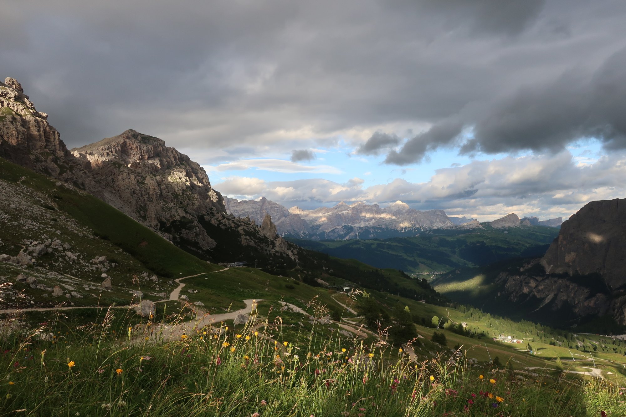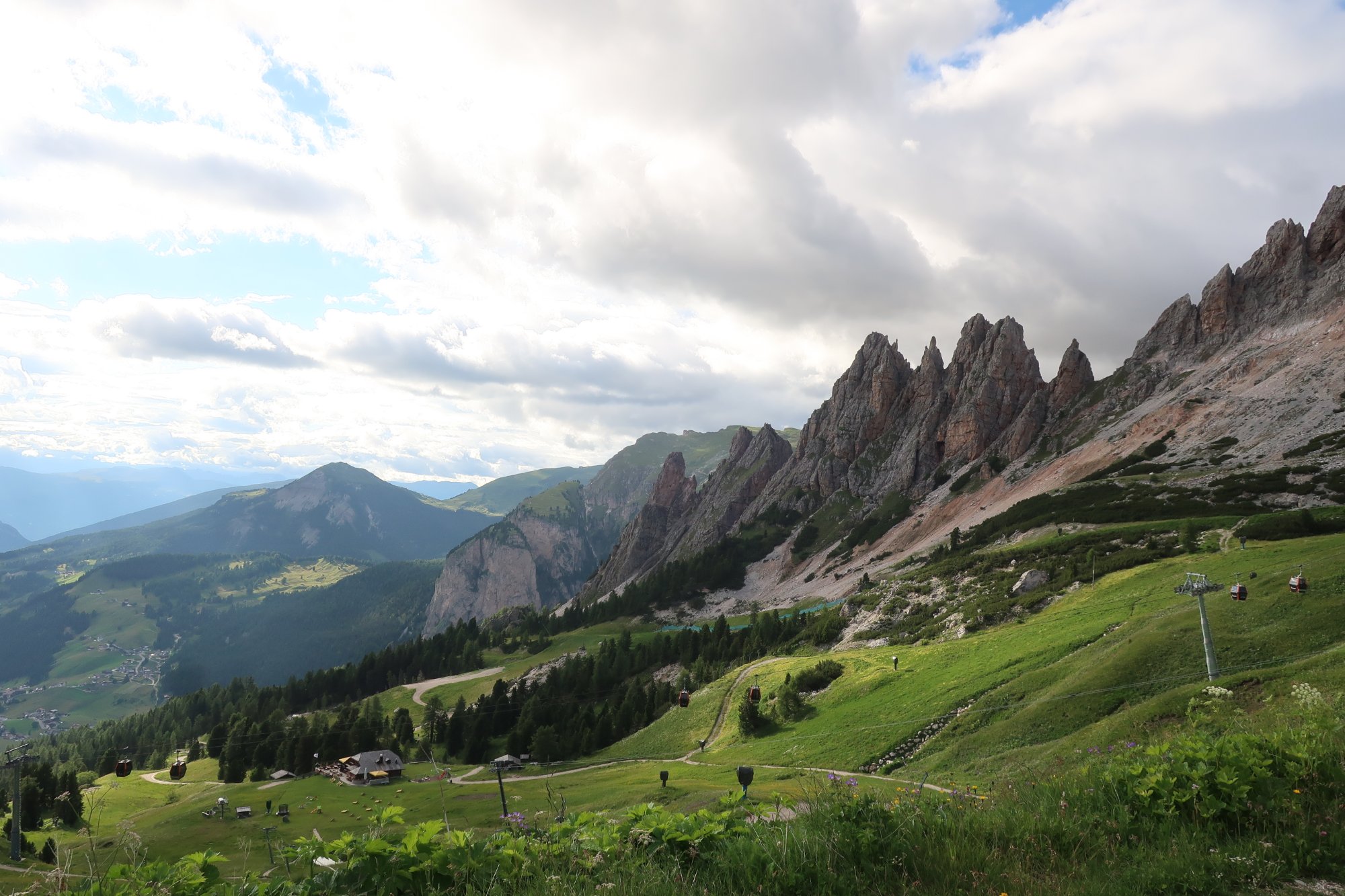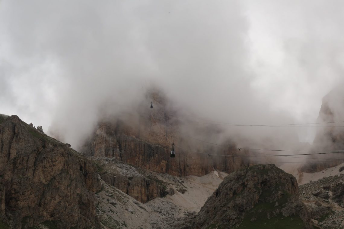 Wir laufen die 30 Minuten zur Bergstation Dantercepies hinauf. Hier kommen die Gondeln aus Wolkenstein auf der Passhöhe an. Abends fährt keine Bahn mehr und es ist entsprechend einsam. Wir werden bald schon belohnt mit einem herrlichen Bergpanorama das vom Spiel des Winds mal mit Sonne, mal mit Wolken bedeckt sich ständig wandelt.