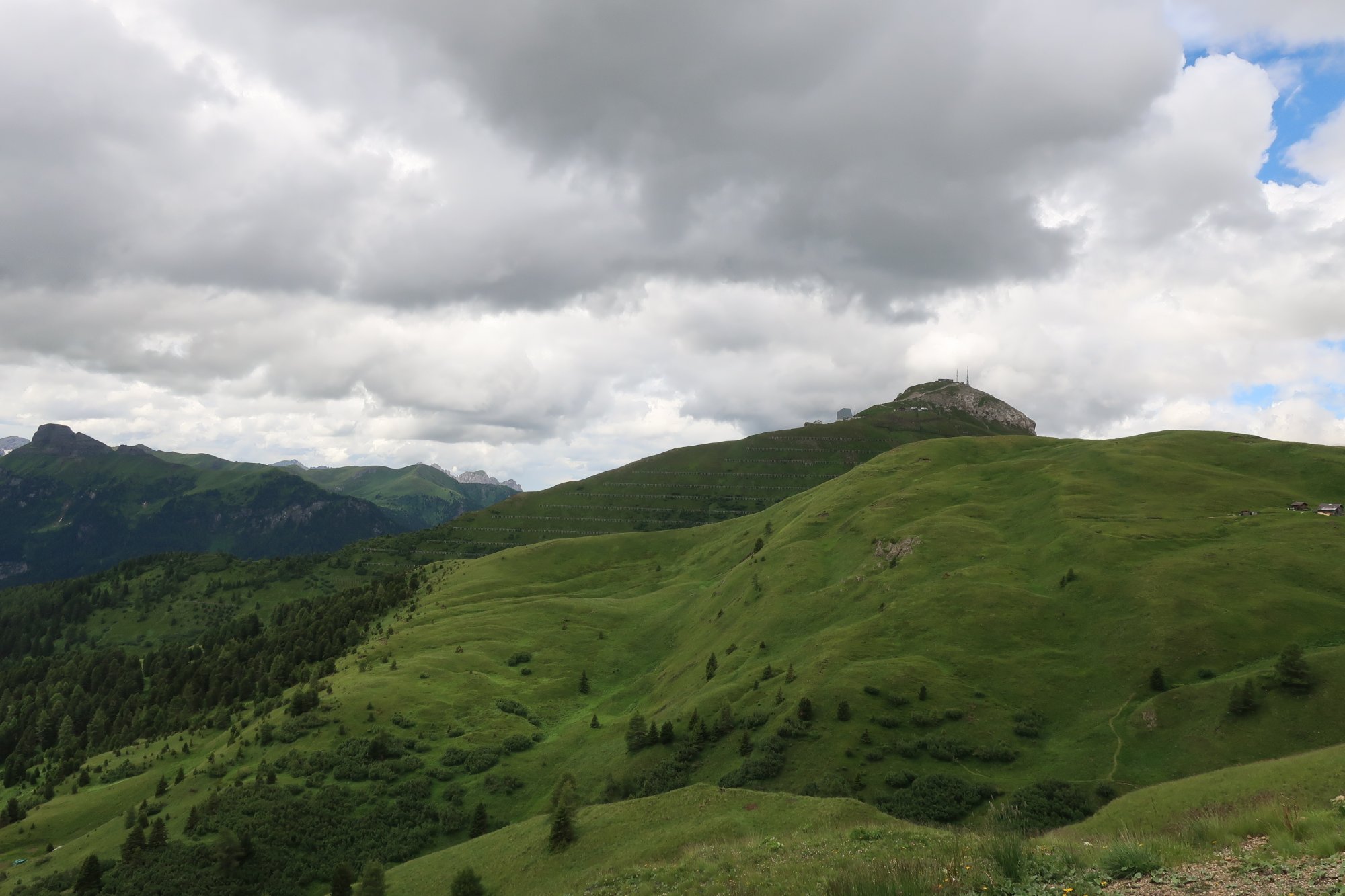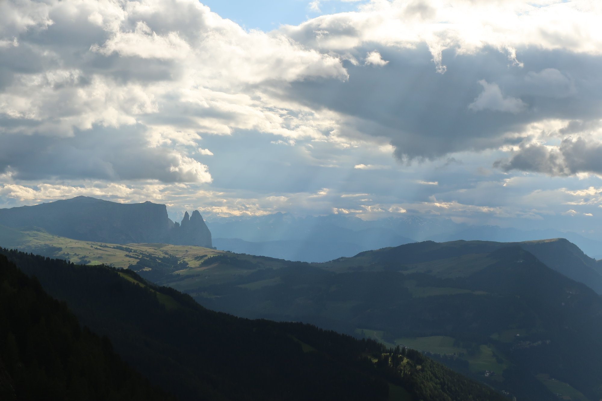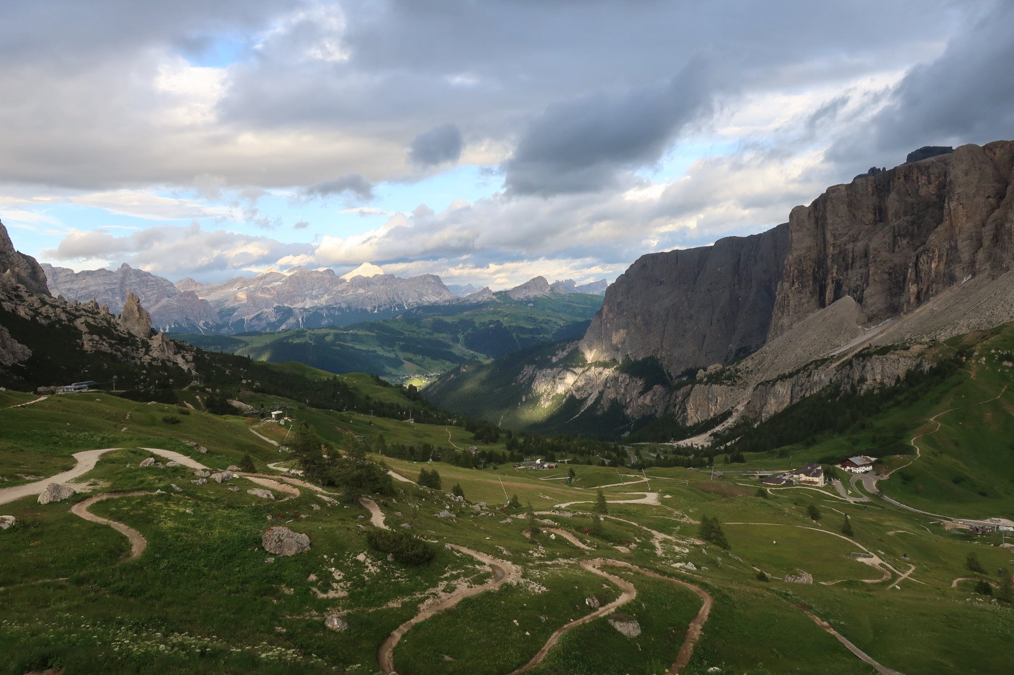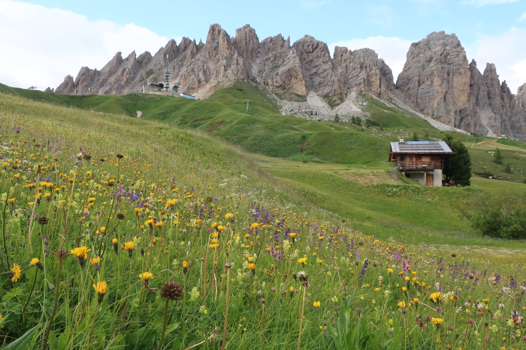 Wir laufen die 30 Minuten zur Bergstation Dantercepies hinauf. Hier kommen die Gondeln aus Wolkenstein auf der Passhöhe an. Abends fährt keine Bahn mehr und es ist entsprechend einsam. Wir werden bald schon belohnt mit einem herrlichen Bergpanorama das vom Spiel des Winds mal mit Sonne, mal mit Wolken bedeckt sich ständig wandelt.