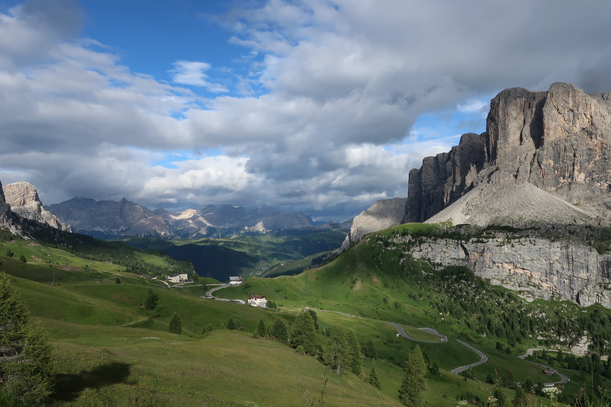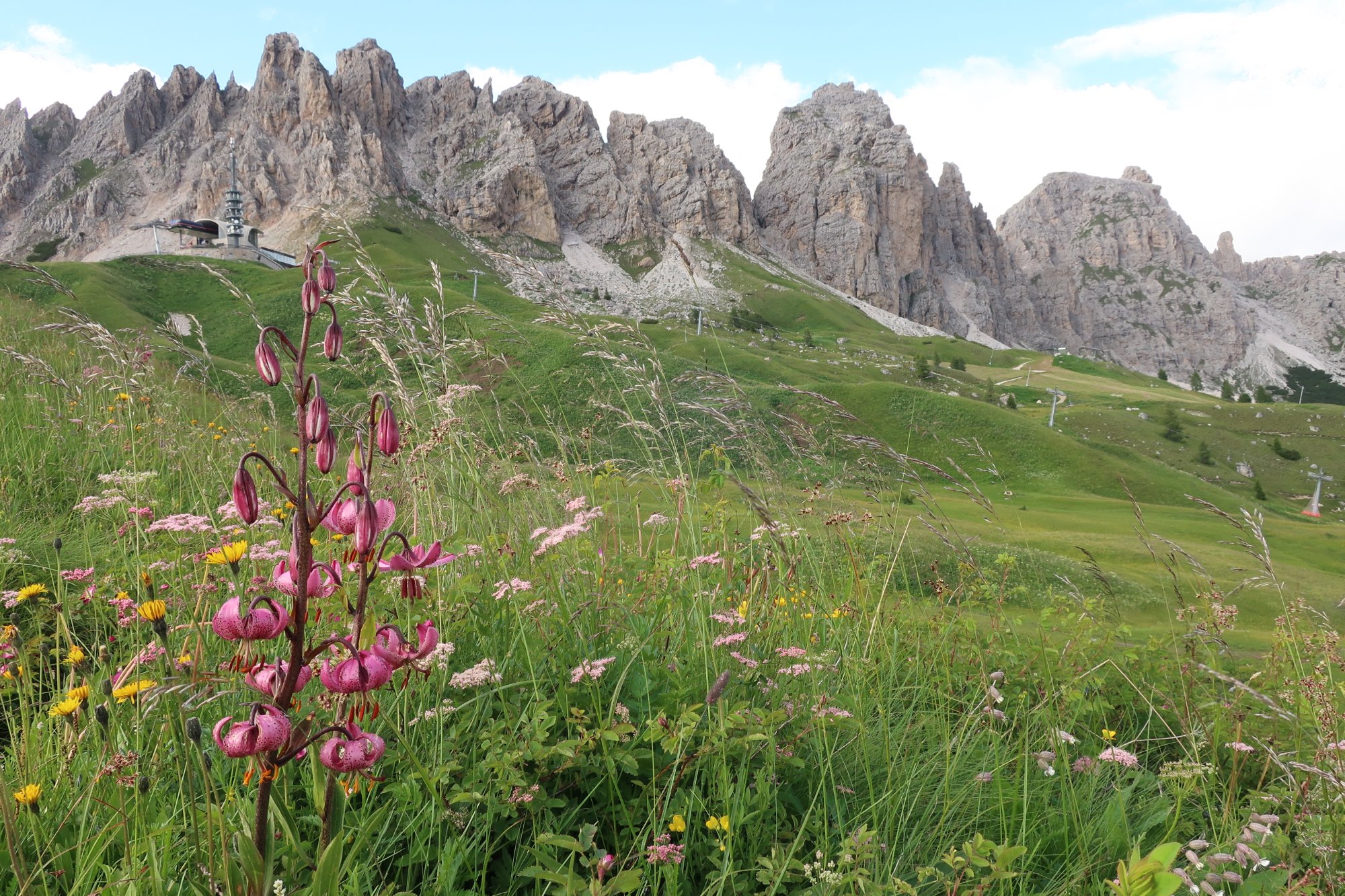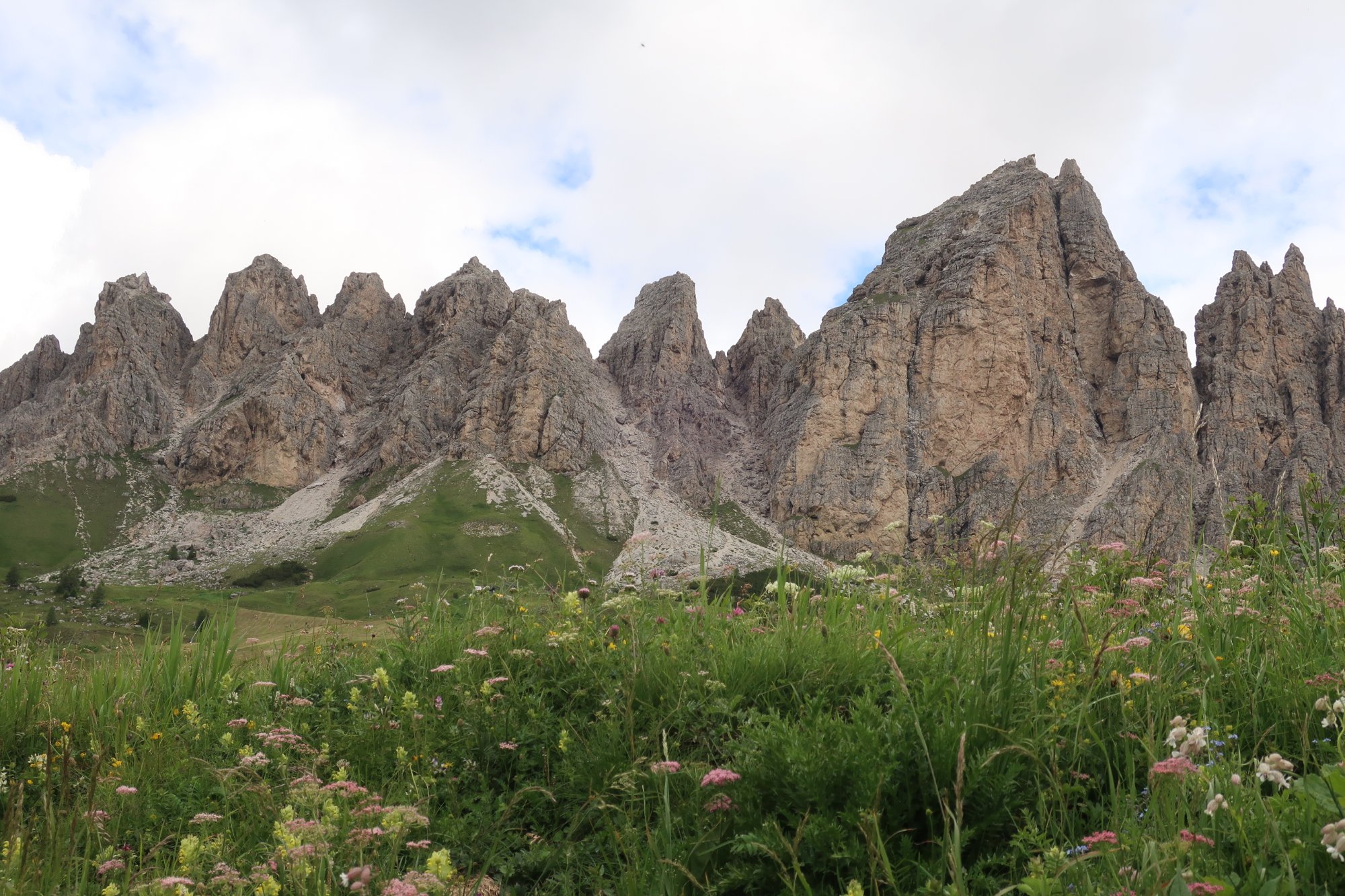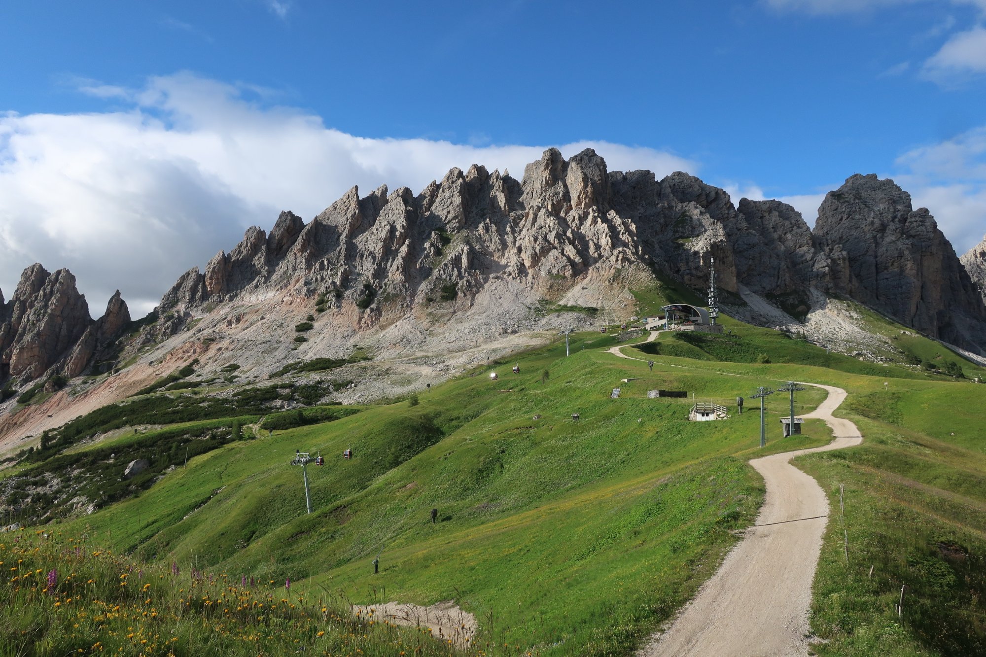 Wir laufen die 30 Minuten zur Bergstation Dantercepies hinauf. Hier kommen die Gondeln aus Wolkenstein auf der Passhöhe an. Abends fährt keine Bahn mehr und es ist entsprechend einsam. Wir werden bald schon belohnt mit einem herrlichen Bergpanorama das vom Spiel des Winds mal mit Sonne, mal mit Wolken bedeckt sich ständig wandelt.