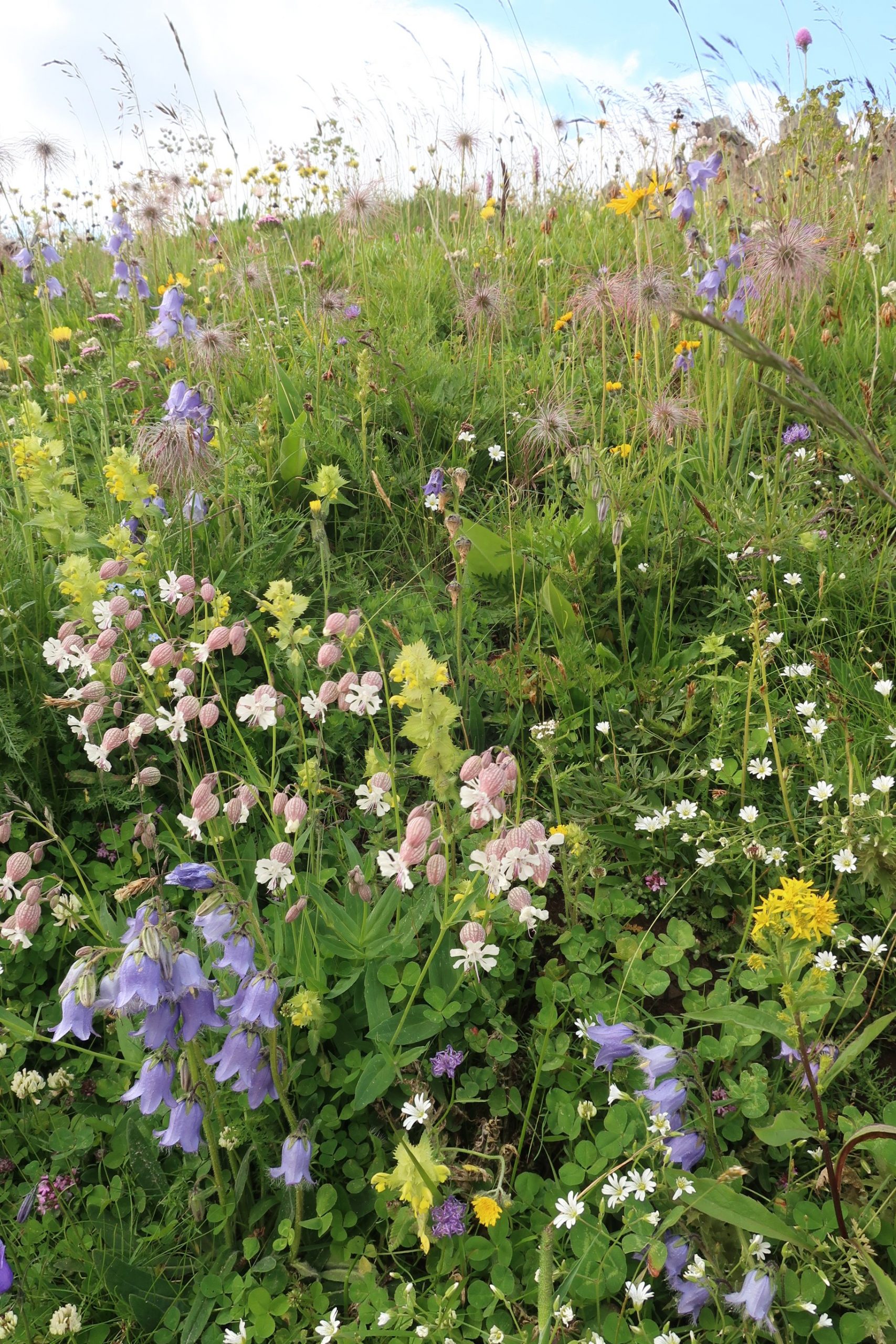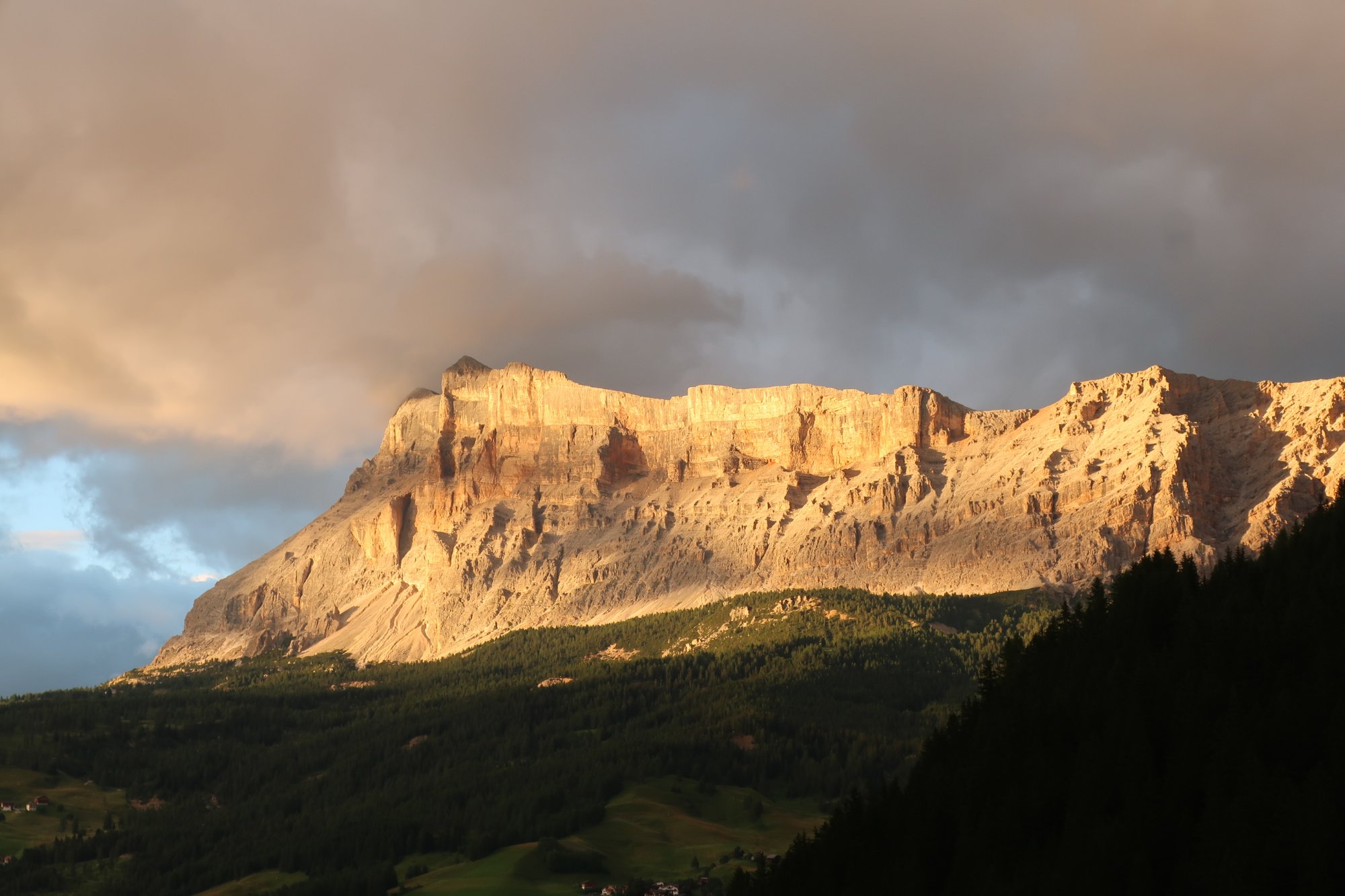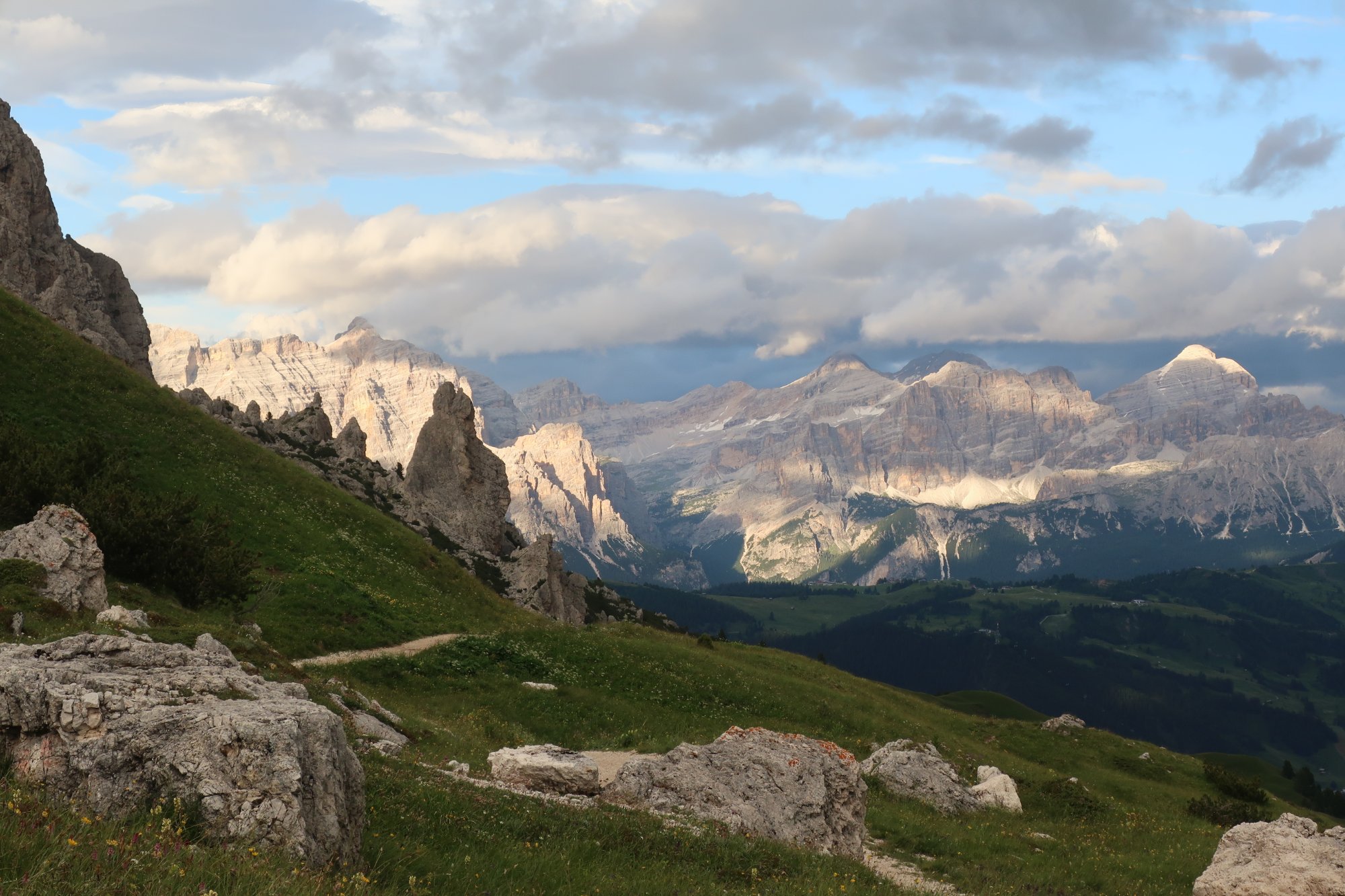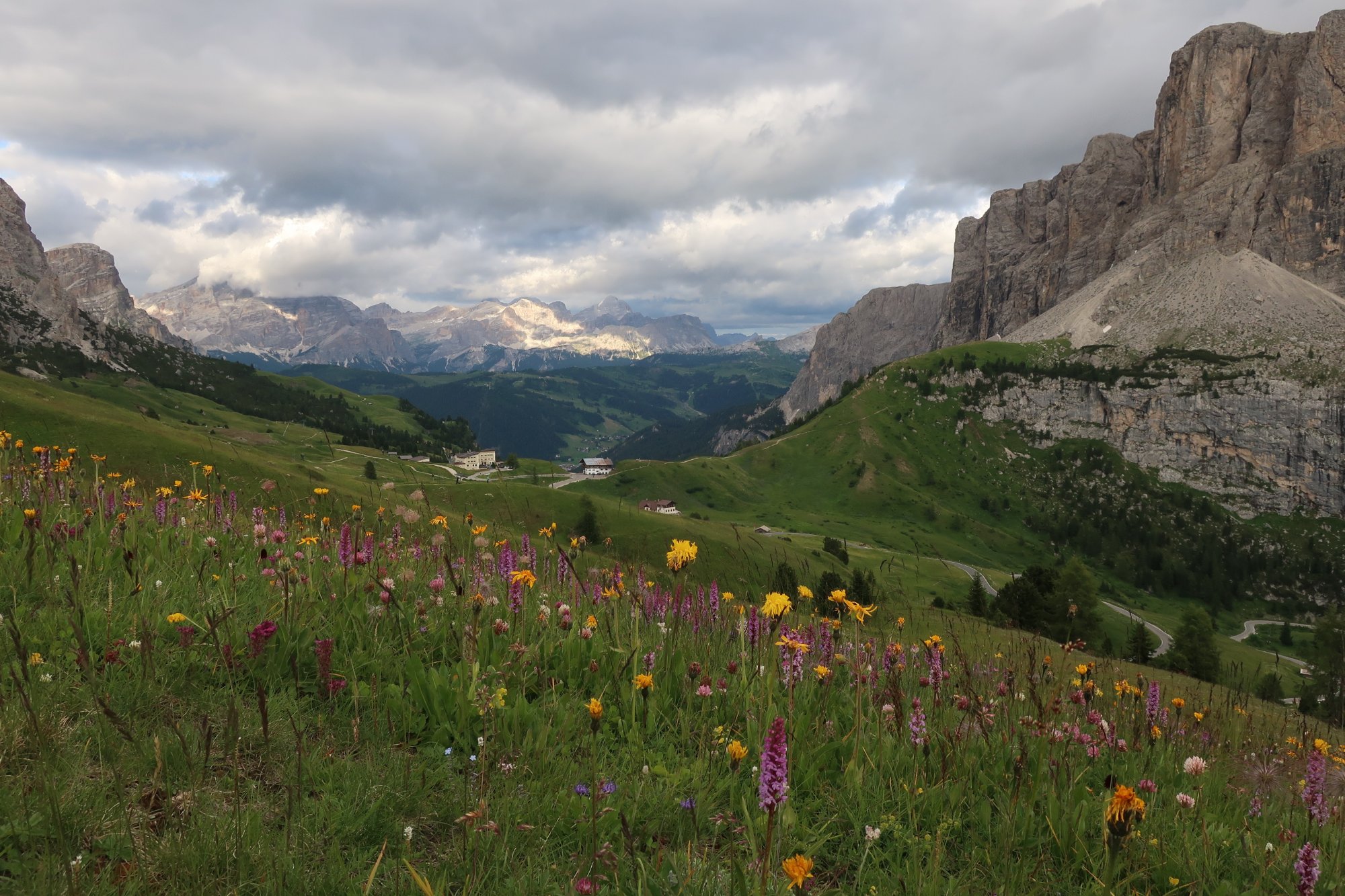 Wir laufen die 30 Minuten zur Bergstation Dantercepies hinauf. Hier kommen die Gondeln aus Wolkenstein auf der Passhöhe an. Abends fährt keine Bahn mehr und es ist entsprechend einsam. Wir werden bald schon belohnt mit einem herrlichen Bergpanorama das vom Spiel des Winds mal mit Sonne, mal mit Wolken bedeckt sich ständig wandelt.