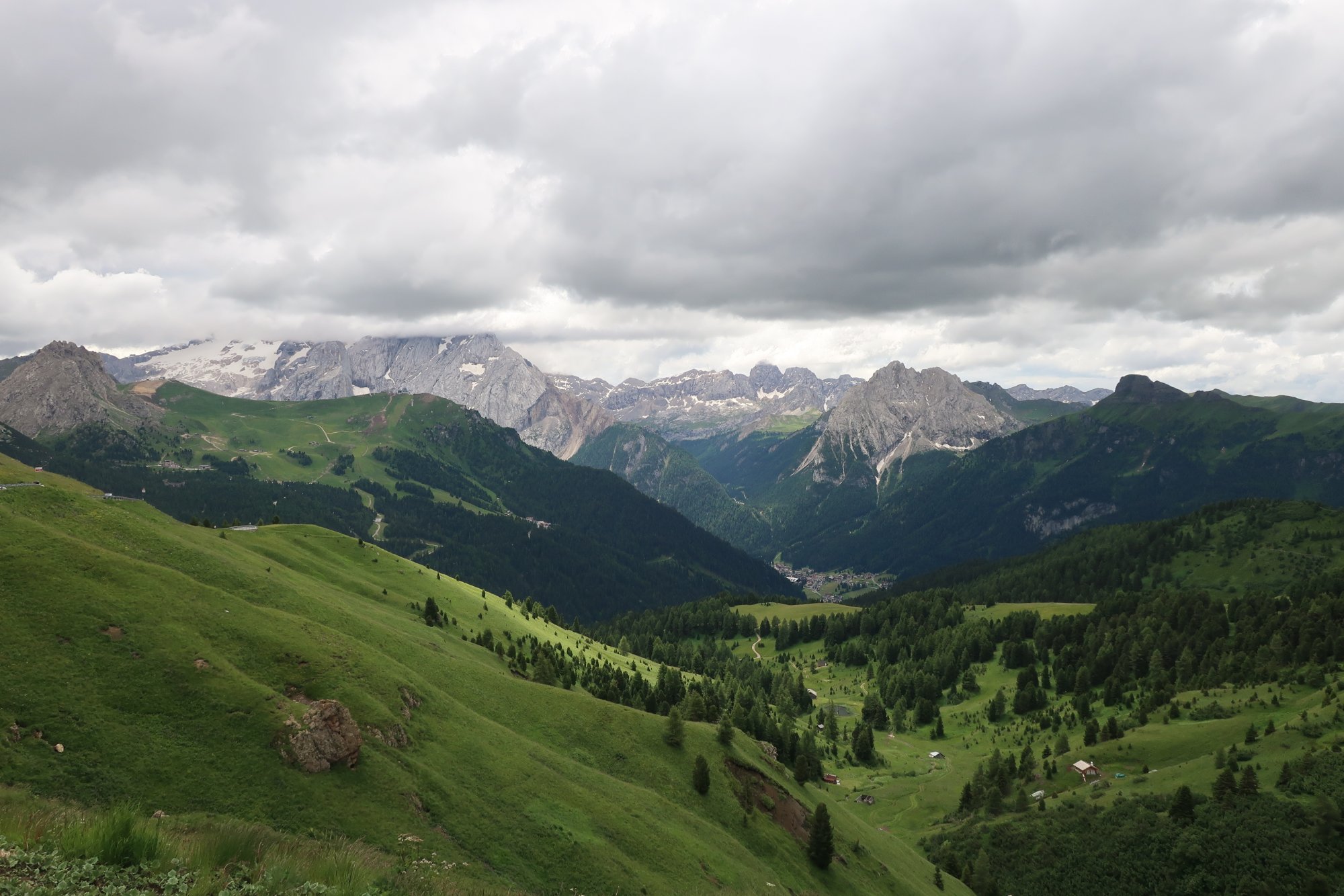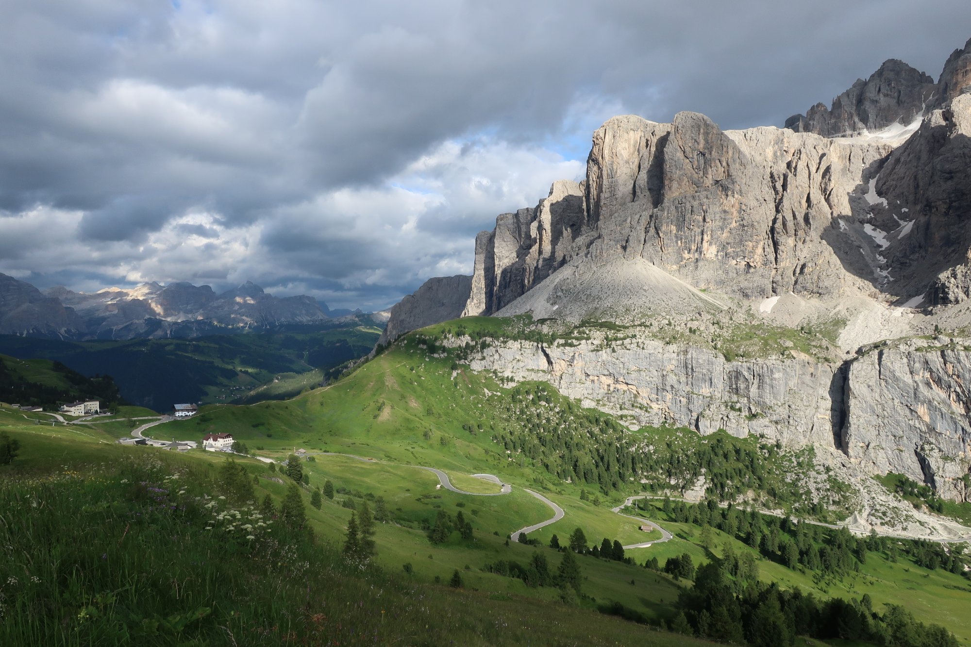 Nach dem belebten Sellapass geht’s weiter zum Pordoi Pass und über schöne Kurven hinauf zum Pordoi Joch. Bisher der schönste Teil der Strecke. Auf der Passhöhe gibt es eine Seilbahn hinauf zum Felsenplateau des Sella Stock. Leider beginnt es genau jetzt zu regnen. Also fahren wir weiter. Vom Pordoi Joch geht es weiter nach Arabba und dann zurück nach Stern. Eine schöne Rundtour, die immer wieder zum Aussteigen und einfach nur schauen einlädt.