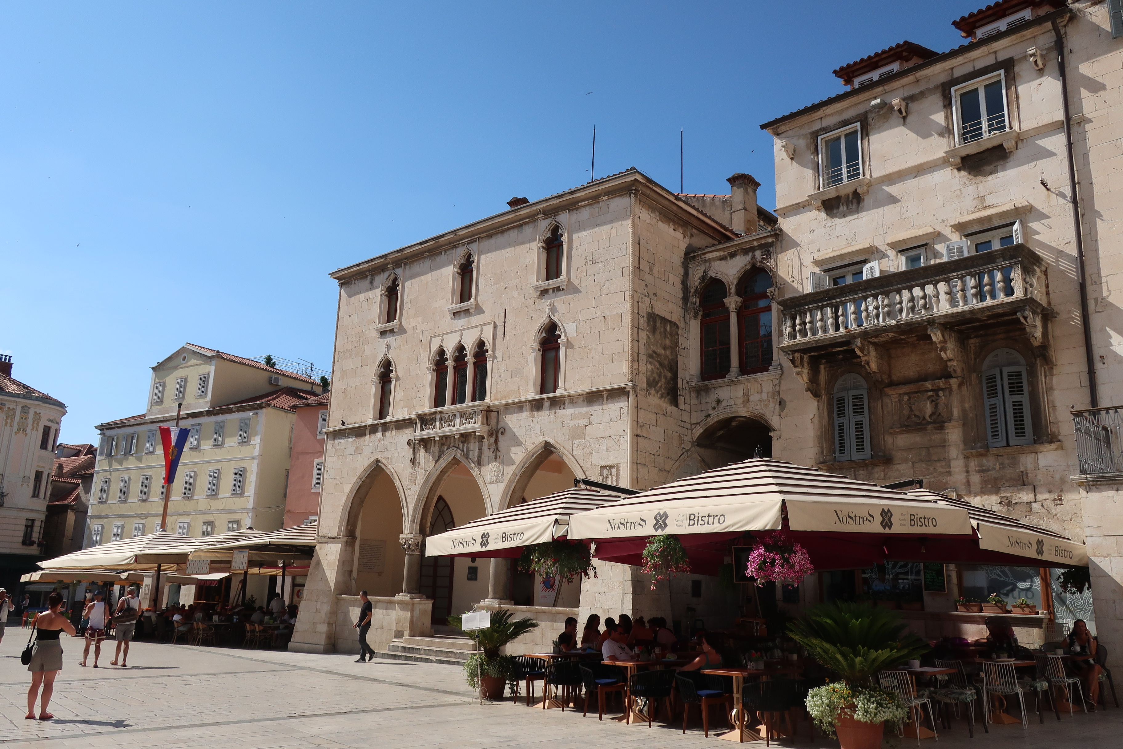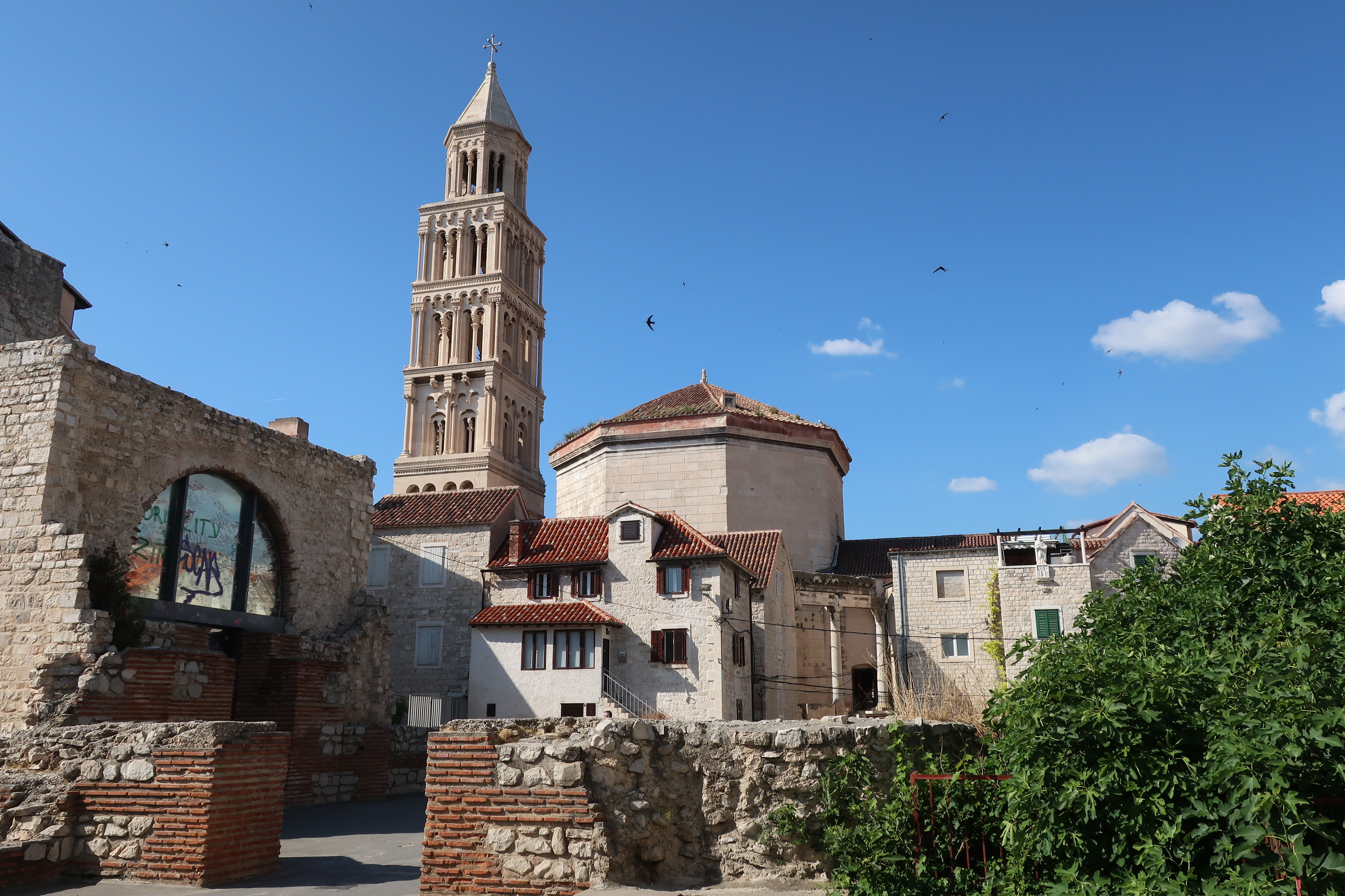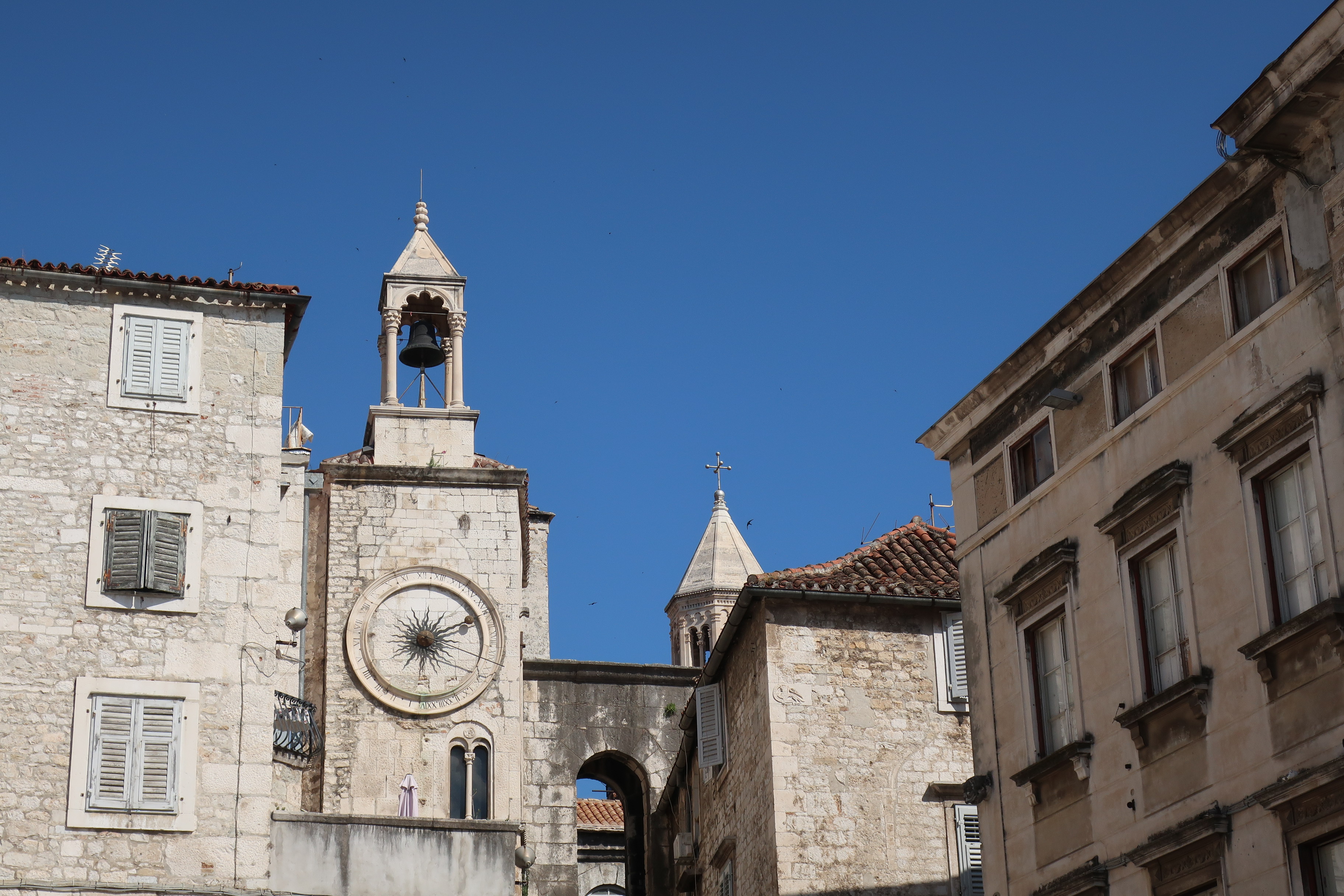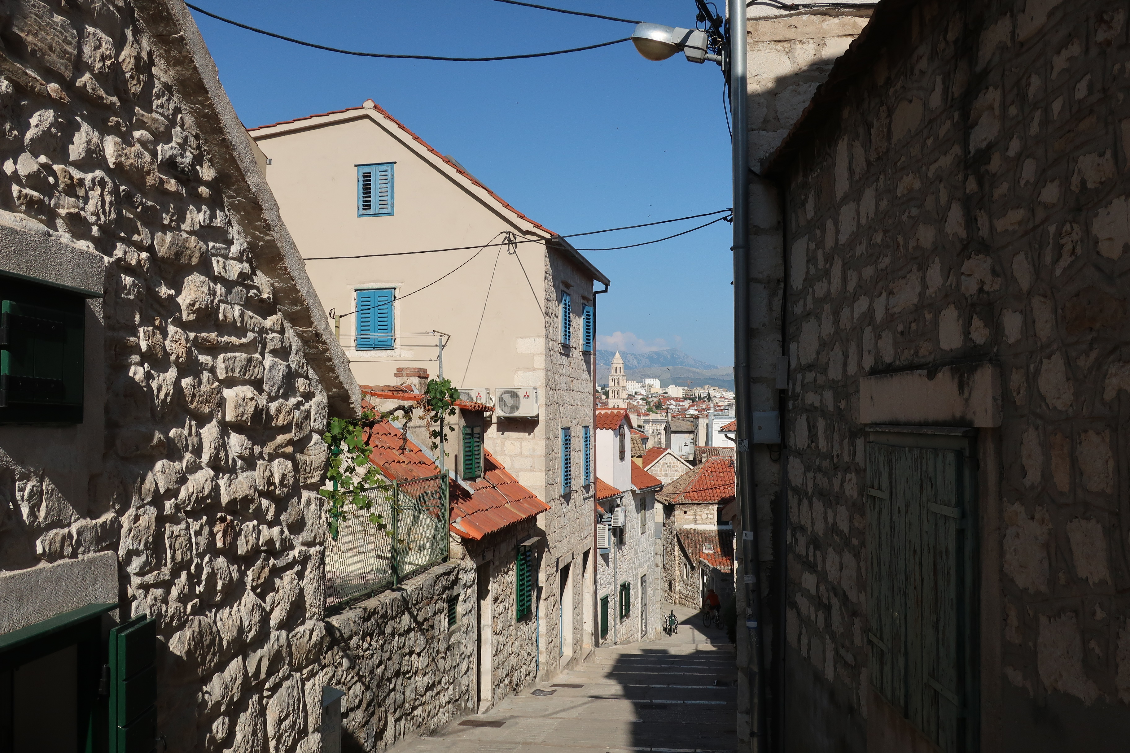Split ist die zweitgrößte Stadt in Kroatien. In der Altstadt merkt man davon nichts. Die Gassen sind eng und verwinkelt. Innerhalb der Mauern des ehemaligen Diokletianpalasts sind heute Häuser und Plätze mit einladenden Restaurants. Auf den Turm der Kathedrale kann man(n) hochgehen und die Aussicht genießen. (In Anbetracht der wackligen, leicht verrosteten Stufen bleibt Frau eher unten.)
