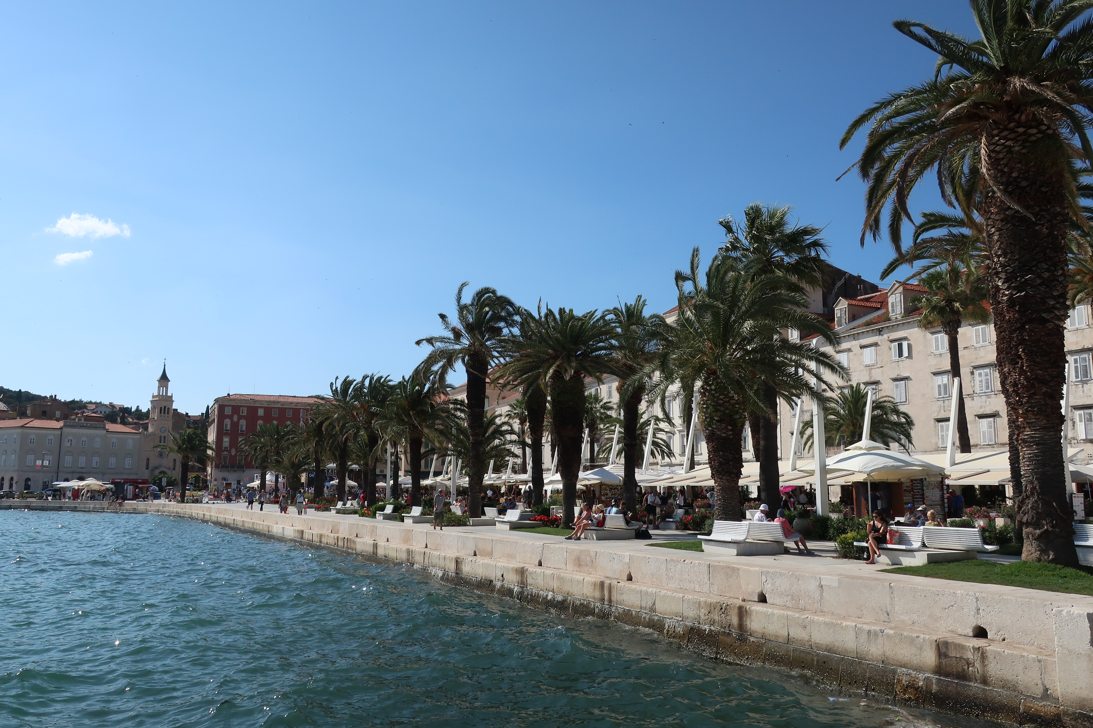 Die Uferpromenade ist mit weißen Steinplatten ausgelegt. Bänke unter Palmen laden zum Verweilen ein. Das Wasser ist tief blau. Ein leichter Wind bringt angenehme Frische.