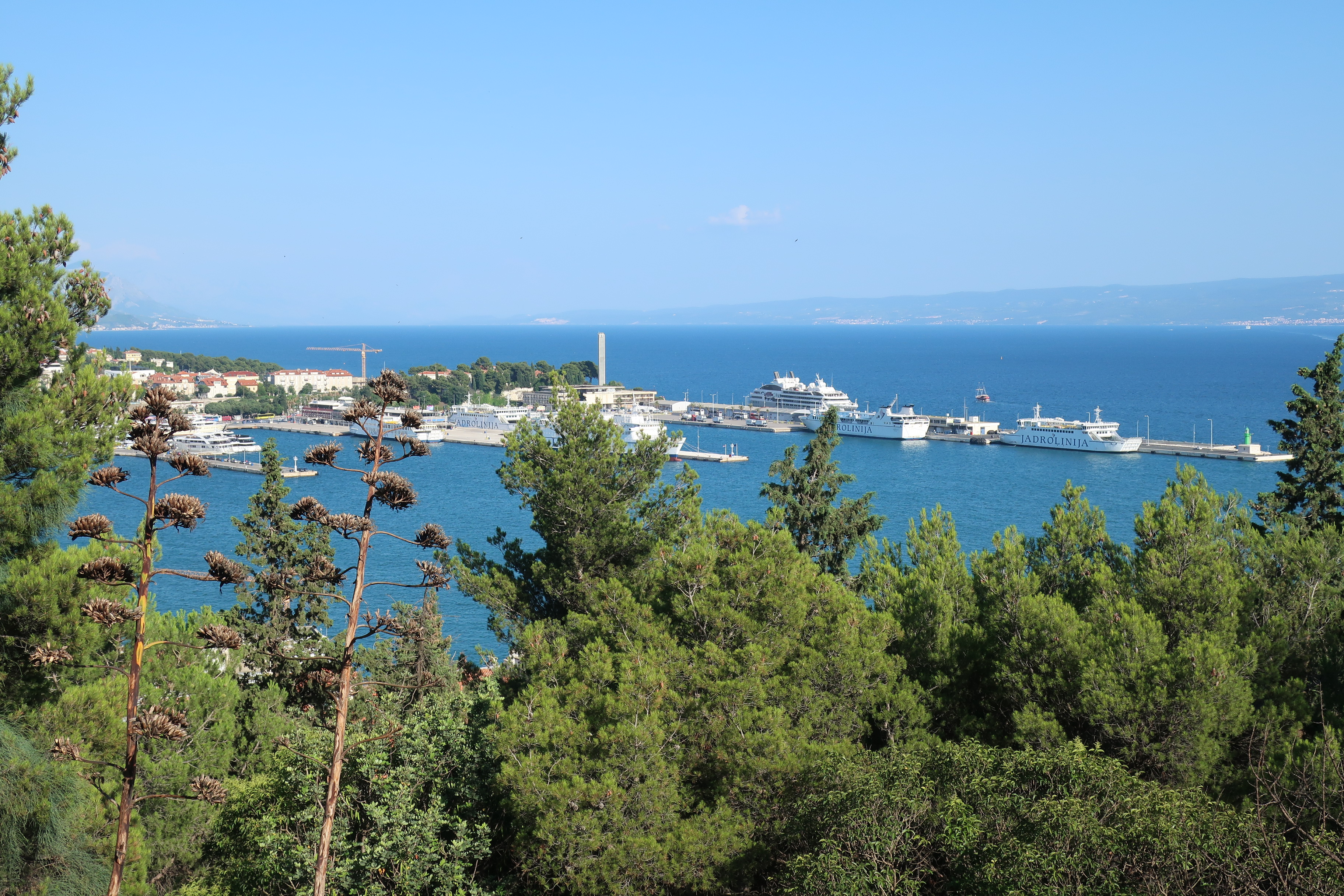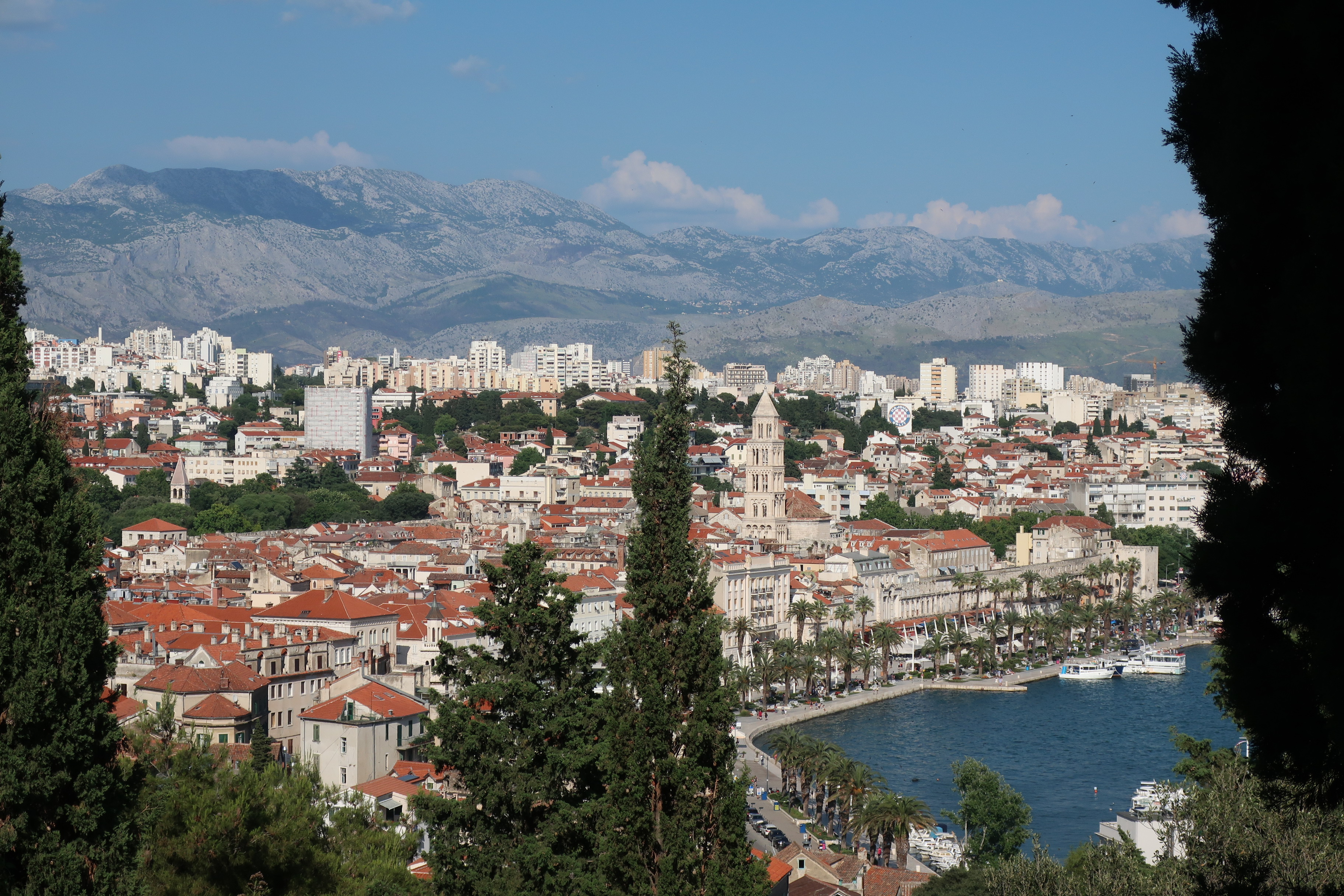 Entlang der Uferpromenade kommt man in den Stadtteil Marjan. Über Stufen steigen wir hinauf zum Aussichtspunkt. Der Ausblick auf Split, seinen Hafen und die umliegenden Inseln ist relativ einzigartig. Über den Bergen hinter Split bilden sich kleine Wölkchen, vom Meer her weht immer noch eine leichte Brise. Wir stellen fest, dass wir schon sehr, sehr lange nicht mehr im Süden im Urlaub waren. Irgendwie ist es wieder mal schön. Und irgendwie kommen wir beim Spaziergang durch Split auf potentielle Urlaubsziele für das nächste Jahr. Dabei haben wir dann gerätselt, ob sie über dem Polarkreis liegen oder doch nur knapp darunter.