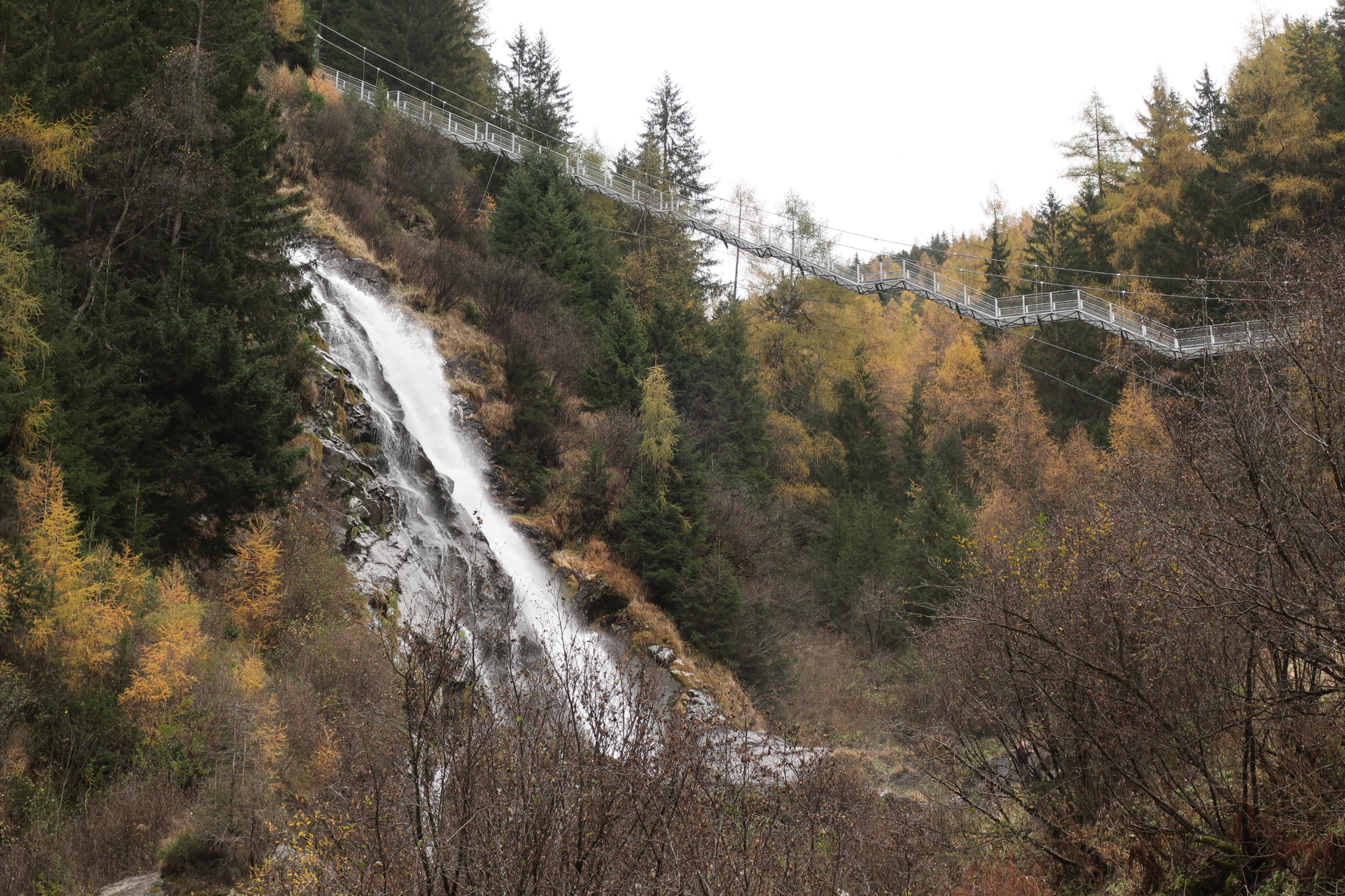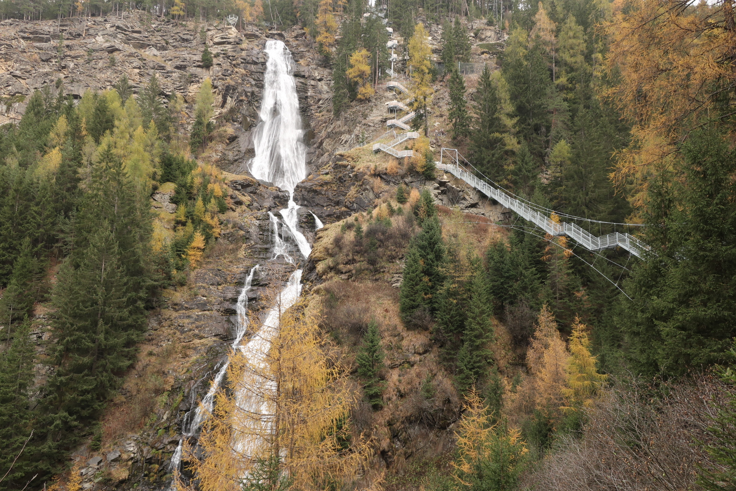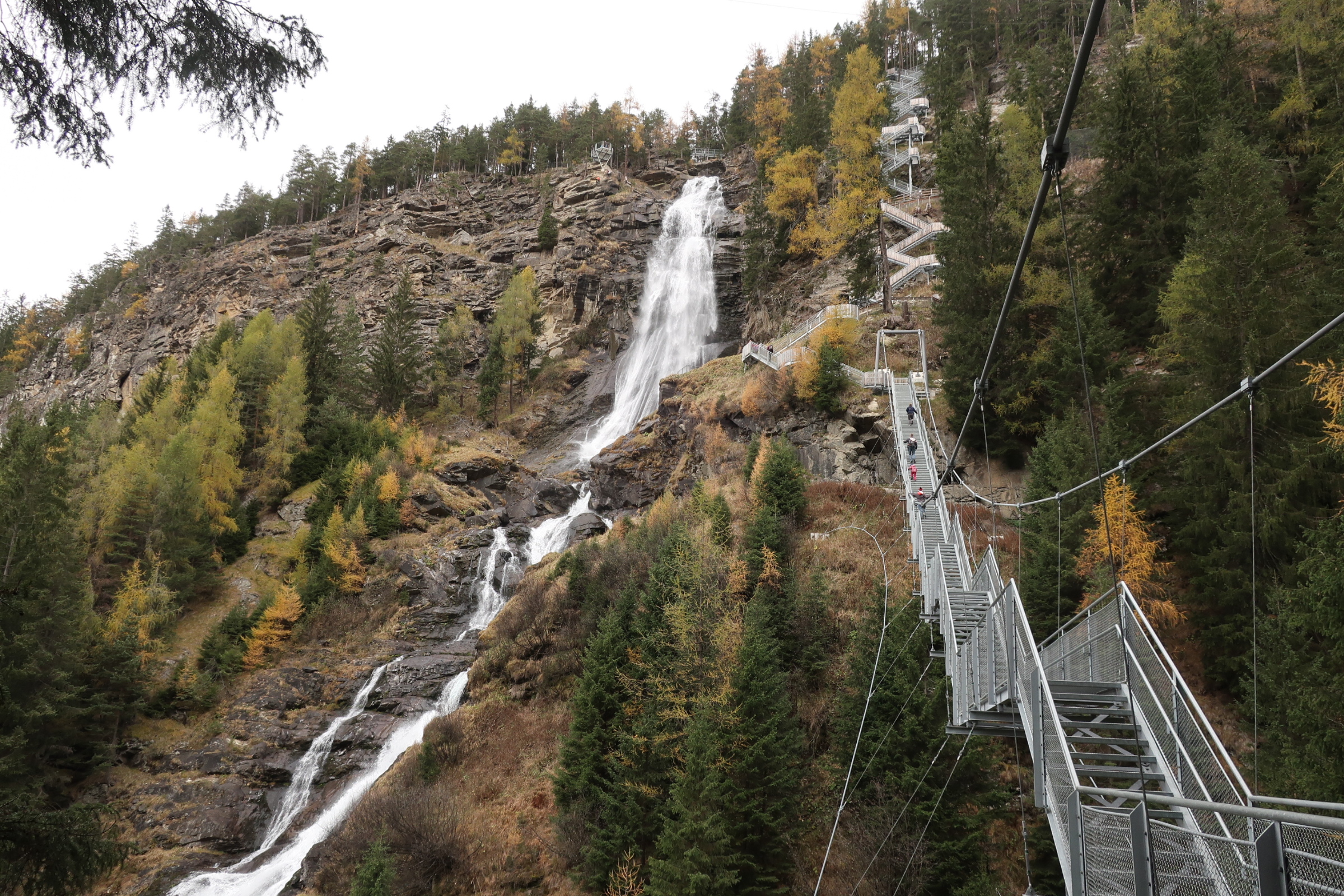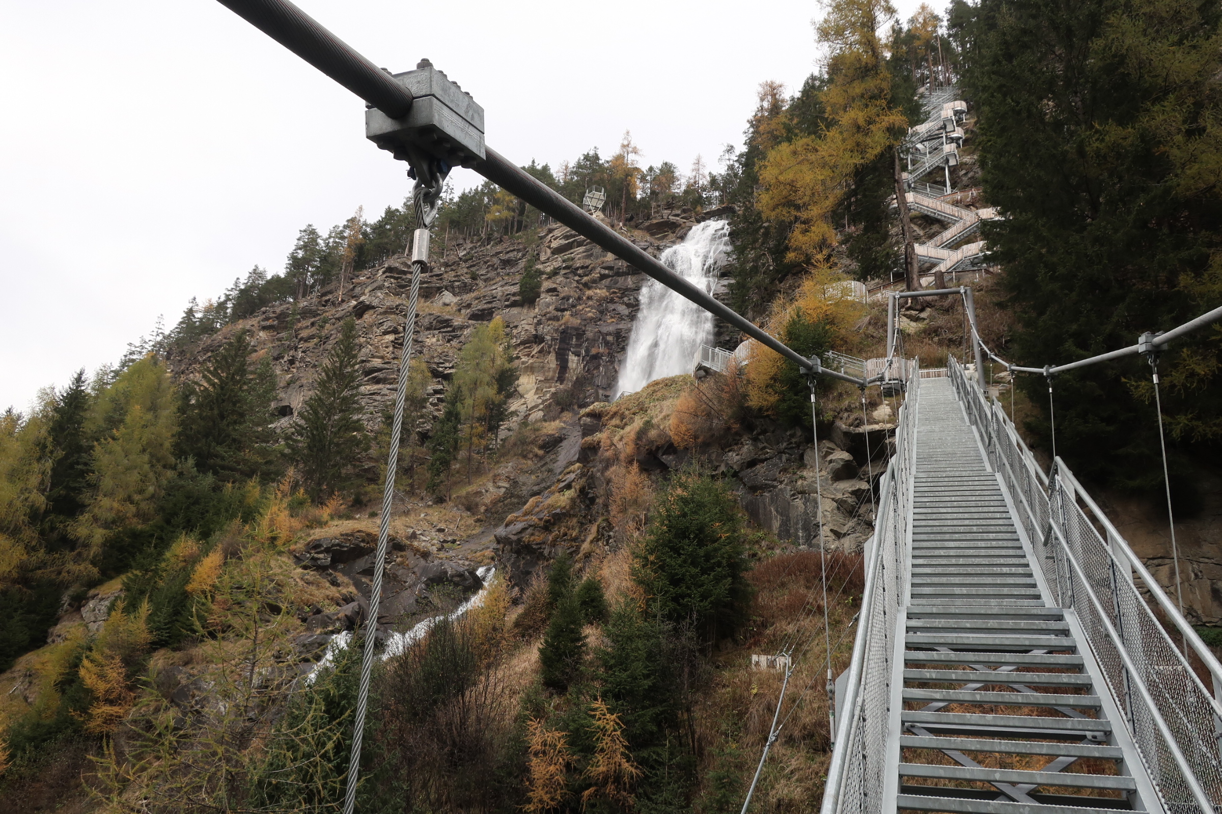 Auf die Entspannung gestern Abend folgt heute nochmal etwas Anspannung. Das Wetter ist wolkig. Keine Sonne in Sicht. Wir machen trotzdem noch einen Abstecher zum Stuibenfall. Der Wasserfall sieht von unten schon beeindruckend aus. Das ist aber nicht der Grund für die Aufregung. Vielmehr das was neben dem Wasserfall wartet. Eine Hängetreppe, die über den Wasserfall führt. Und die im Hang eingebauten Gitterstufen, die zum oberen Ende des Wasserfalls führen. Mit Höhenangst durchaus eine Herausforderung.
