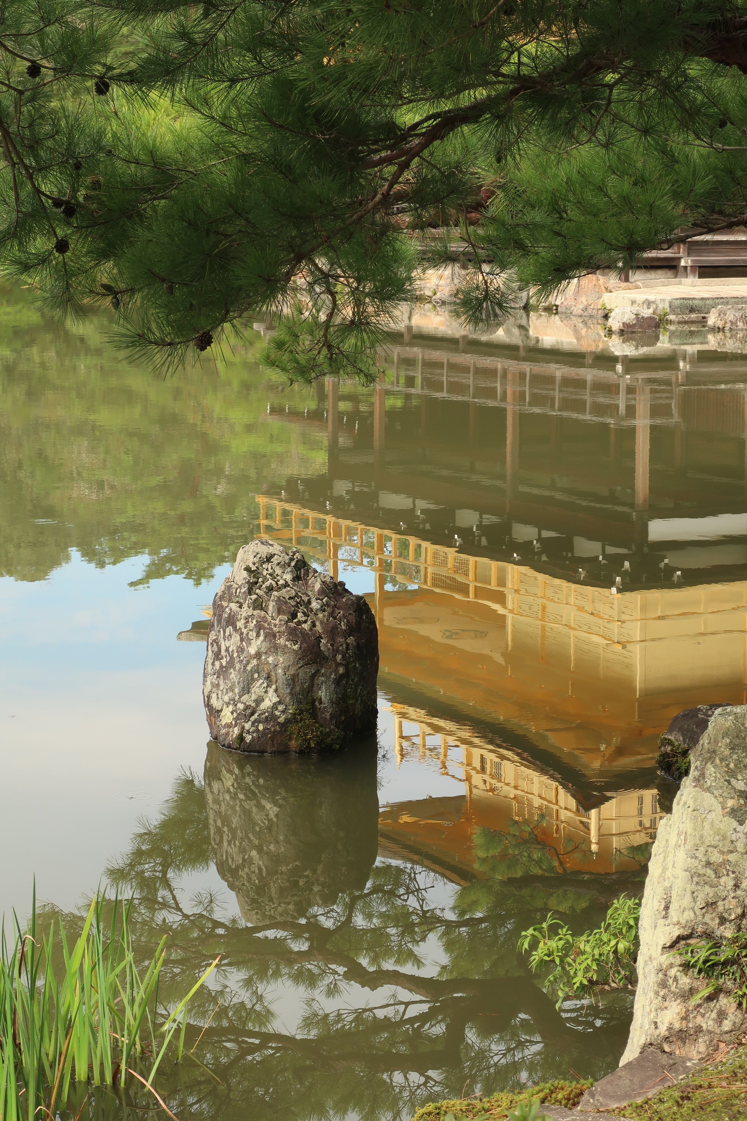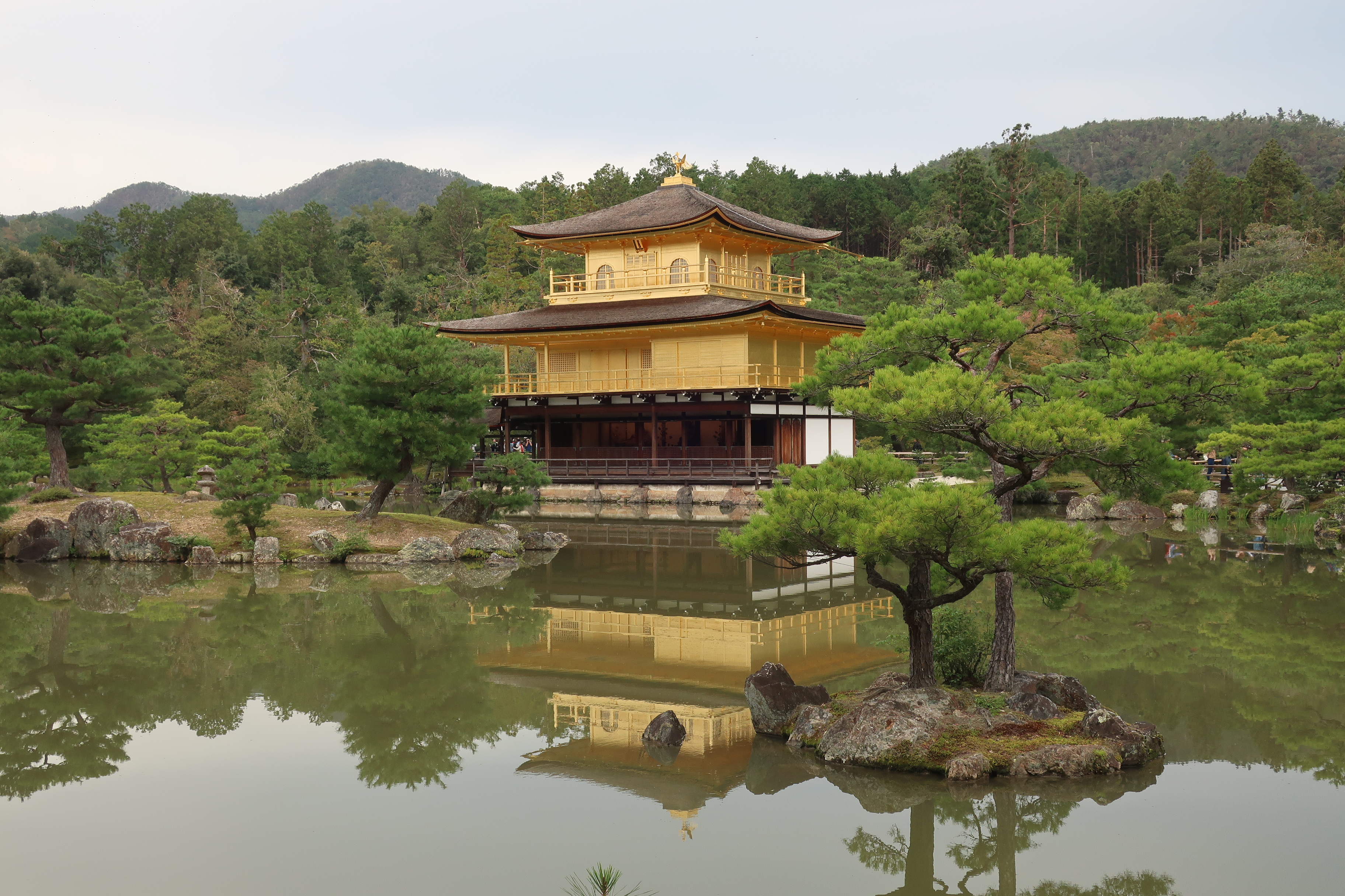 Der goldene Tempel. Schön am Wasser gebaut, kleine Bäumchen um und auf den Inseln am Wasser. Der Tempel reich verziert und strahlend gold. Vergoldet mit echtem Blattgold. So richtig strahlen will er noch nicht. Die Sonne kämpft noch gegen die Wolken an. Wir sind totzdem nicht die einzigsten. Der goldene Tempel ist eine der Hauptsehenswürdigkeiten in Kyoto. Aber dennoch geht alles ruhig und koordiniert zu.
