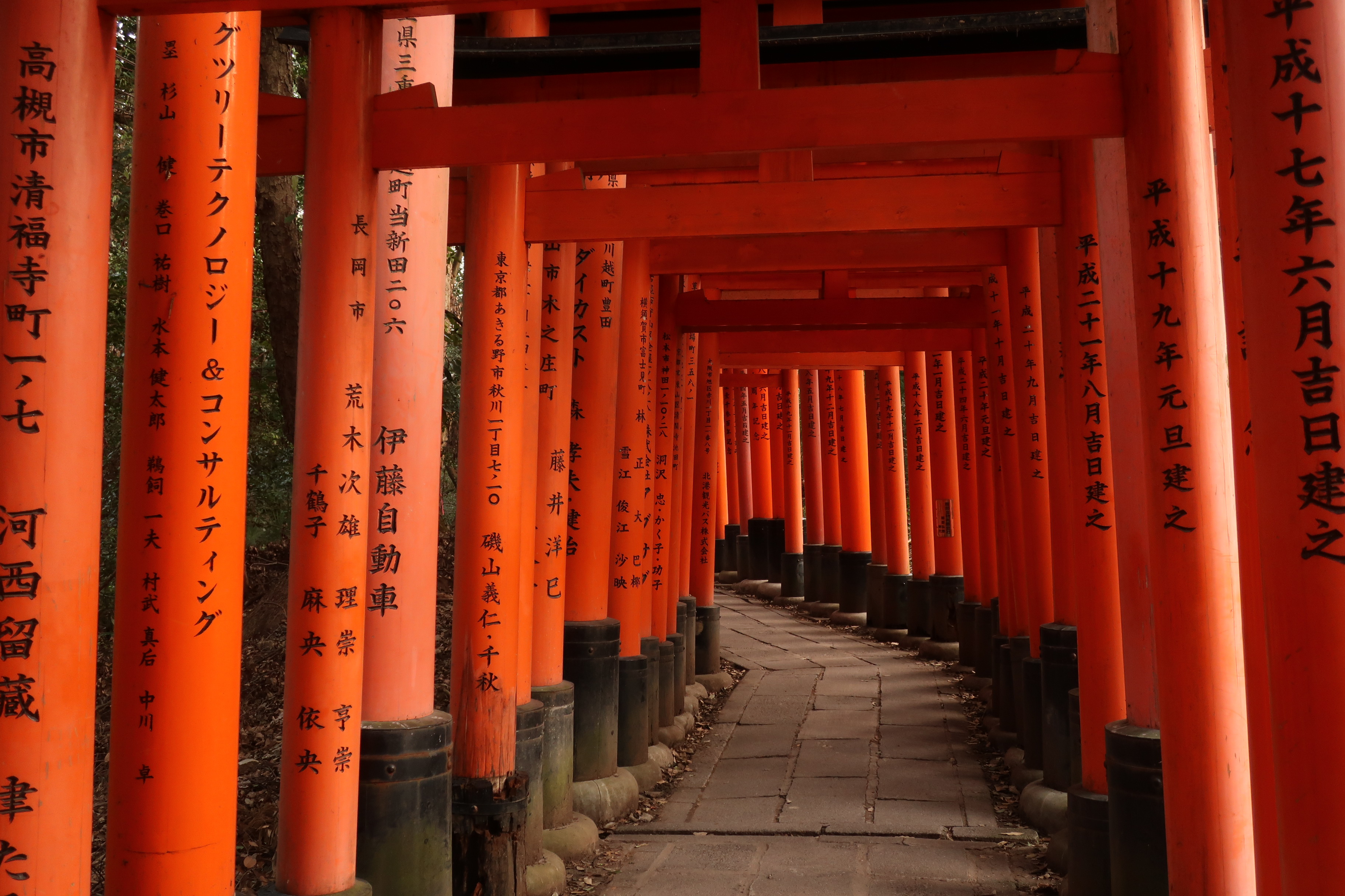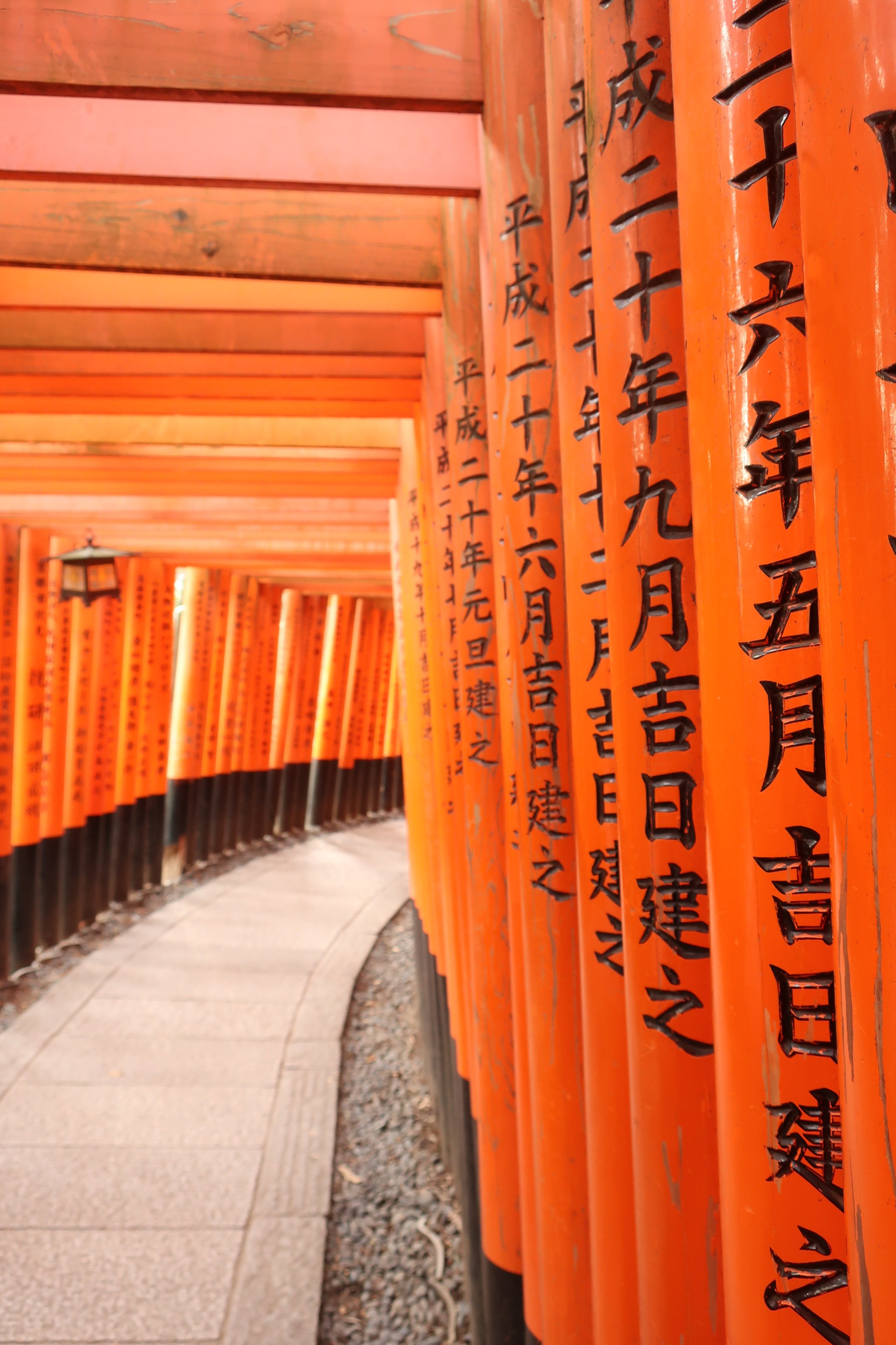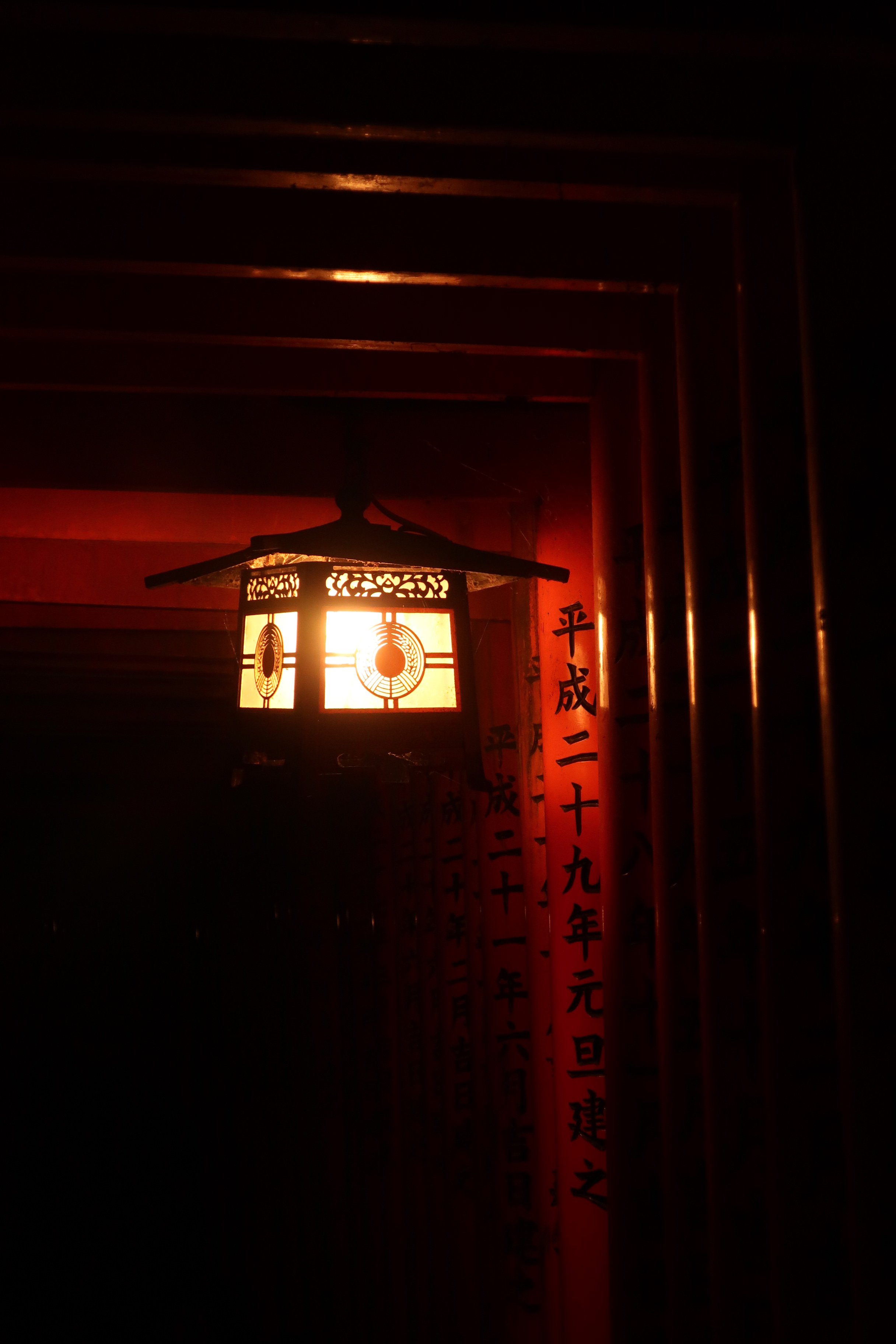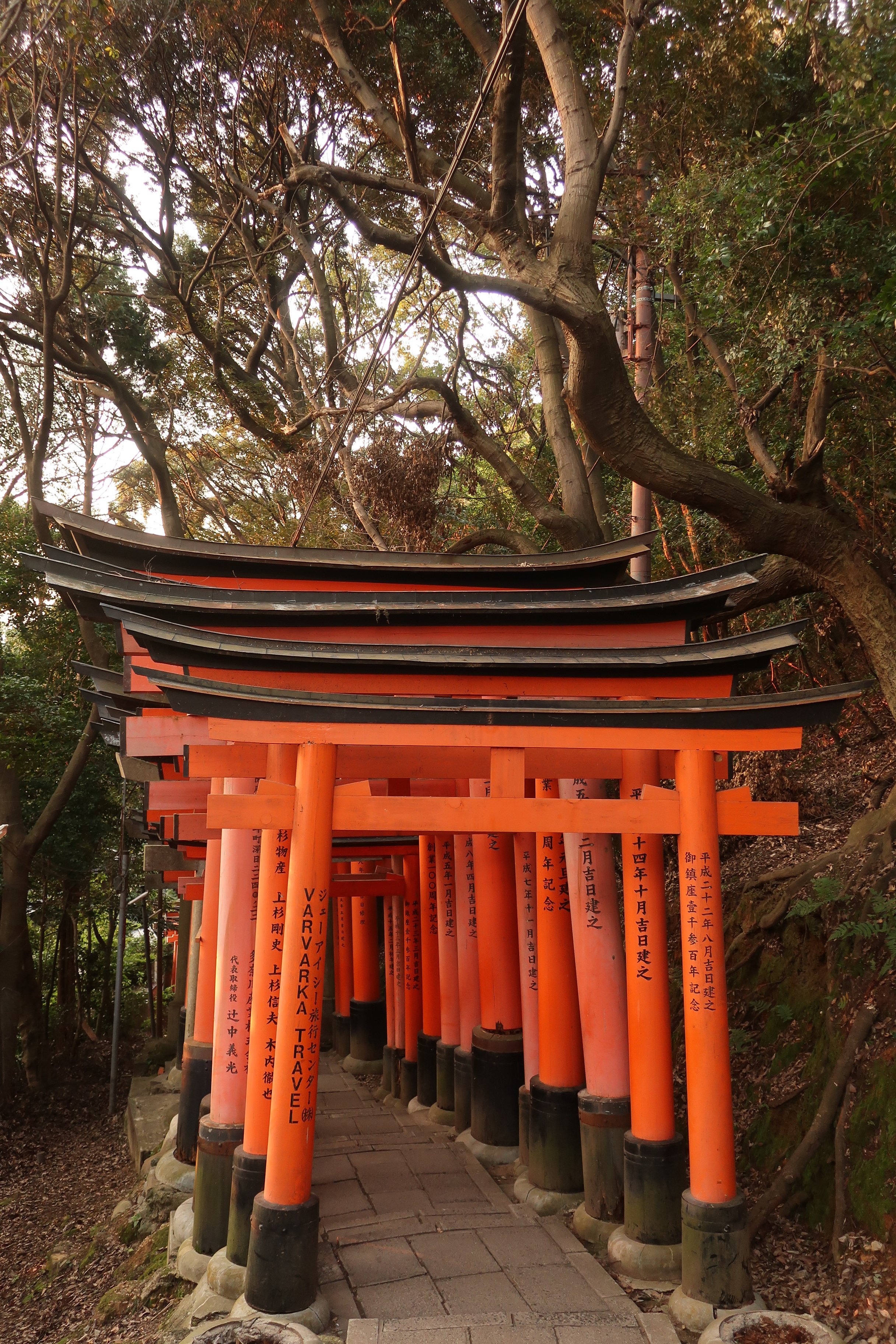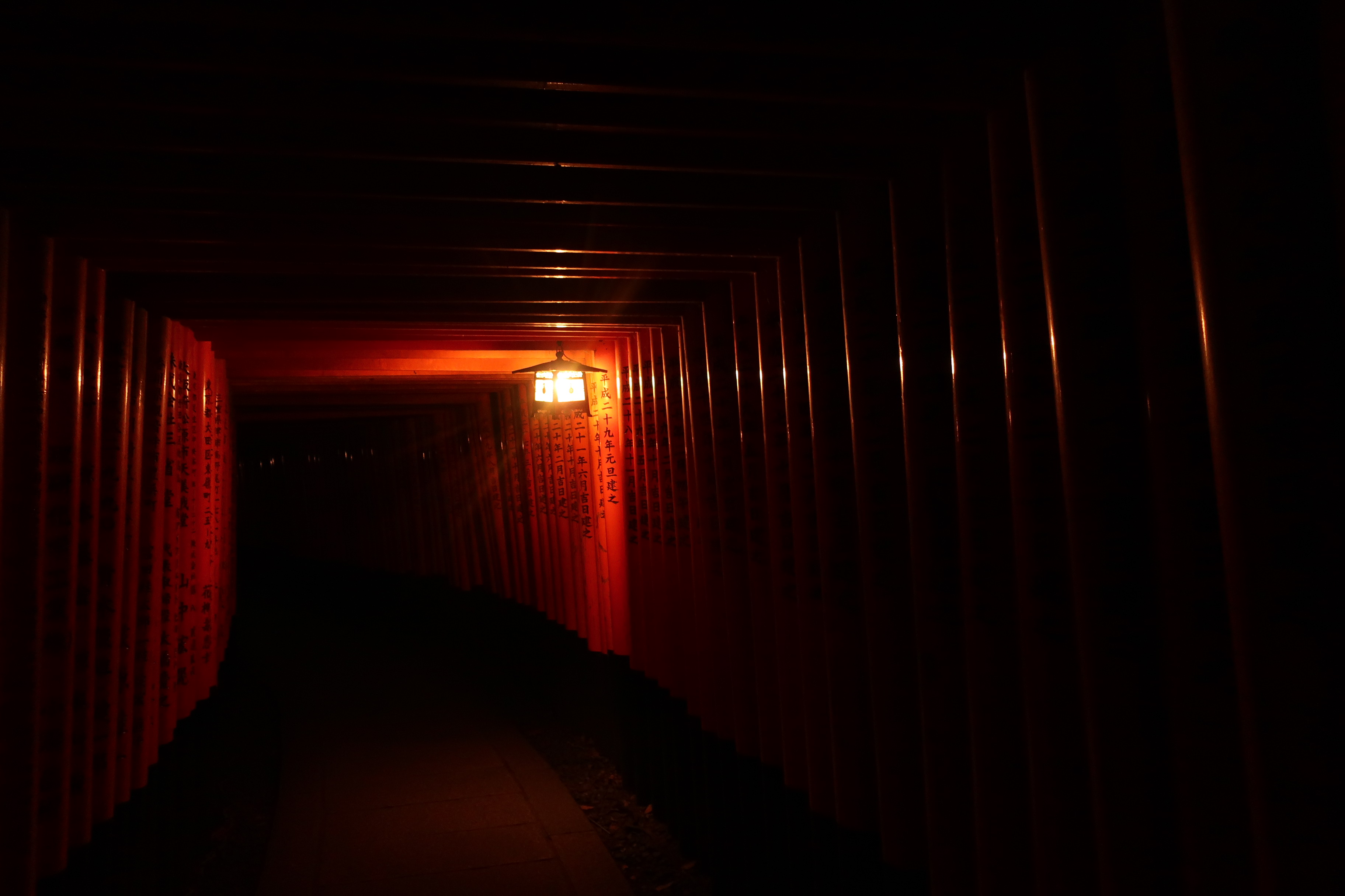 Die ersten Stufen durch die Tore sind noch recht voll. Aber je weiter wir den Berg hinauf laufen, desto ruhiger wird es. Ab und zu n einer Kurve warten, dann bekommt man die Bögen auch mal ohne Menschen zu sehen. Die Sonne steht schon tief und strahlt durch die roten Torbögen. Später wird es dunkel (17:30 Uhr). In den unteren Toren gibt es schöne Laternen, die für stimmungsvolles Licht sorgen.