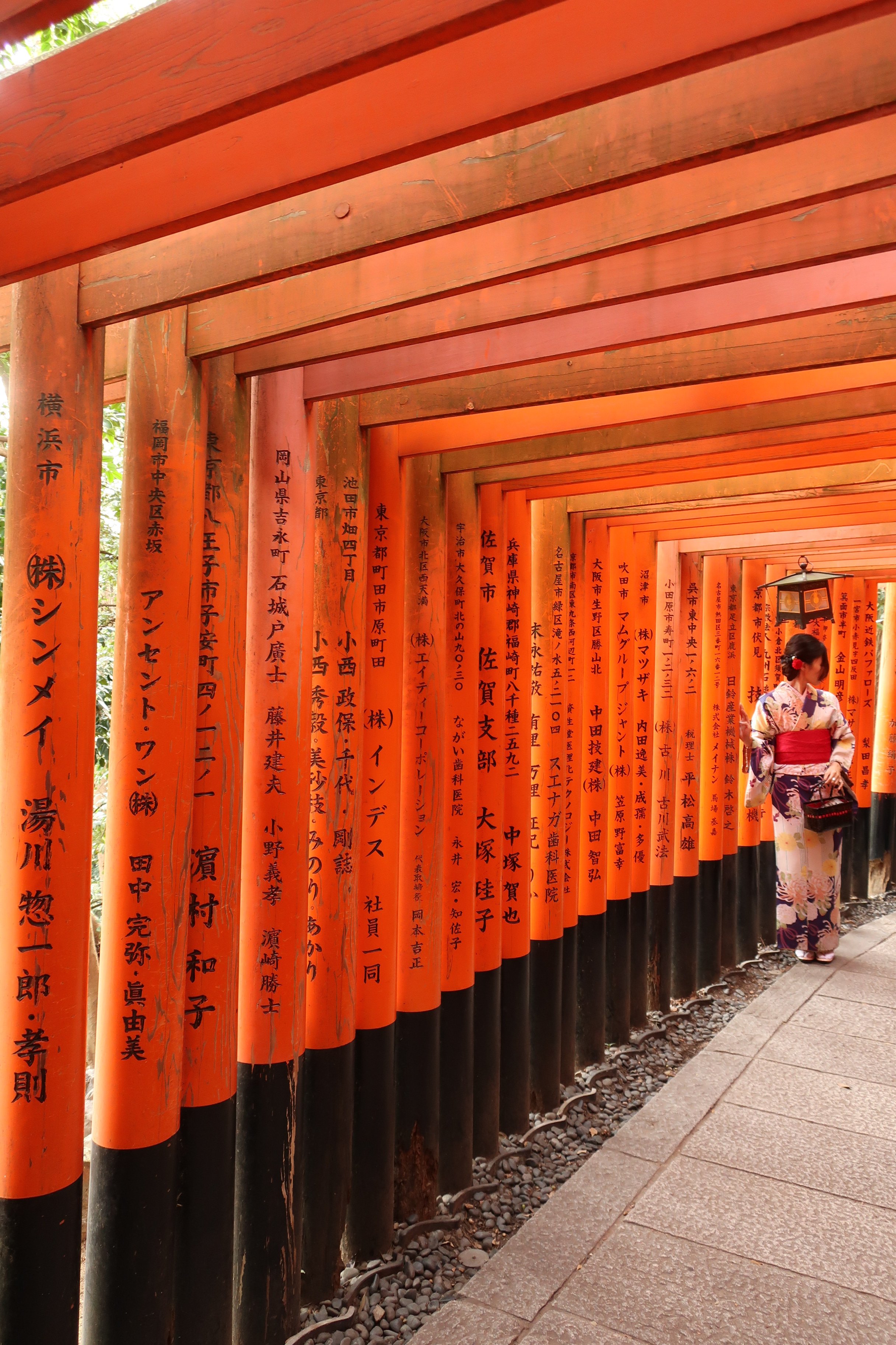 Den Fushimi-Inari Schrein (Bus 5, 105 oder die Zuglinie nach Nara) schauen wir uns nachmittags an. Wir fühlen uns bei der Ankunft ein wenig wie auf einem Volksfest. Überall Menschen, Stände am Straßenrand und Touristen als Geisha verkleidet. Man kann wohl die traditionelle Kleidung für einen Tag leihen und dann so angezogen Kyotos Sehenswürdigkeiten erkunden. Sehr beliebt bei Selfie-Freunden.