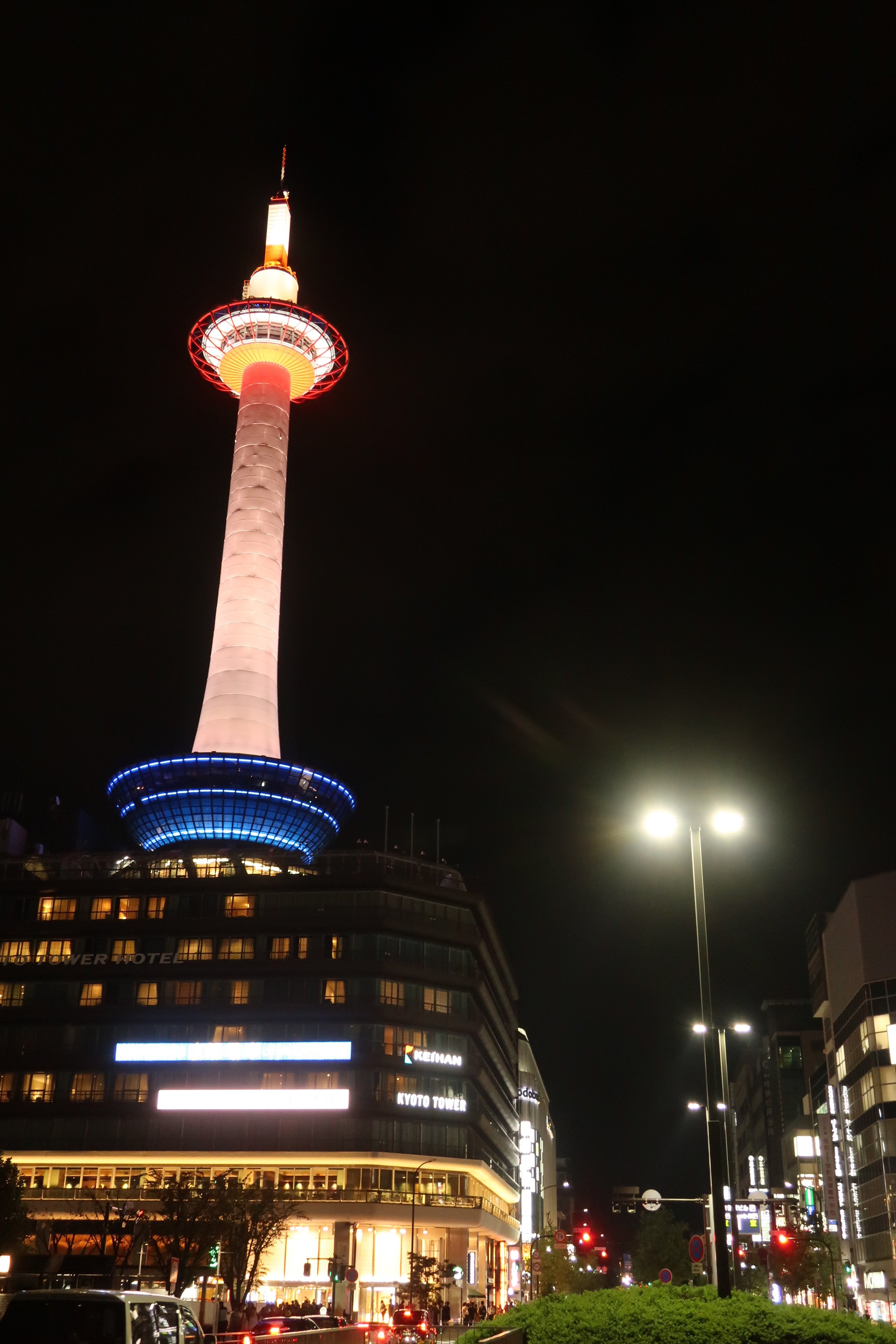 Abends schauen wir noch im Skypark am Bahnhof vorbei. Das Gebäude ist sehr modern und von oben hat man einen tollen Blick über die Stadt. Nebenan steht der bunt beleuchtete Kyoto Tower.